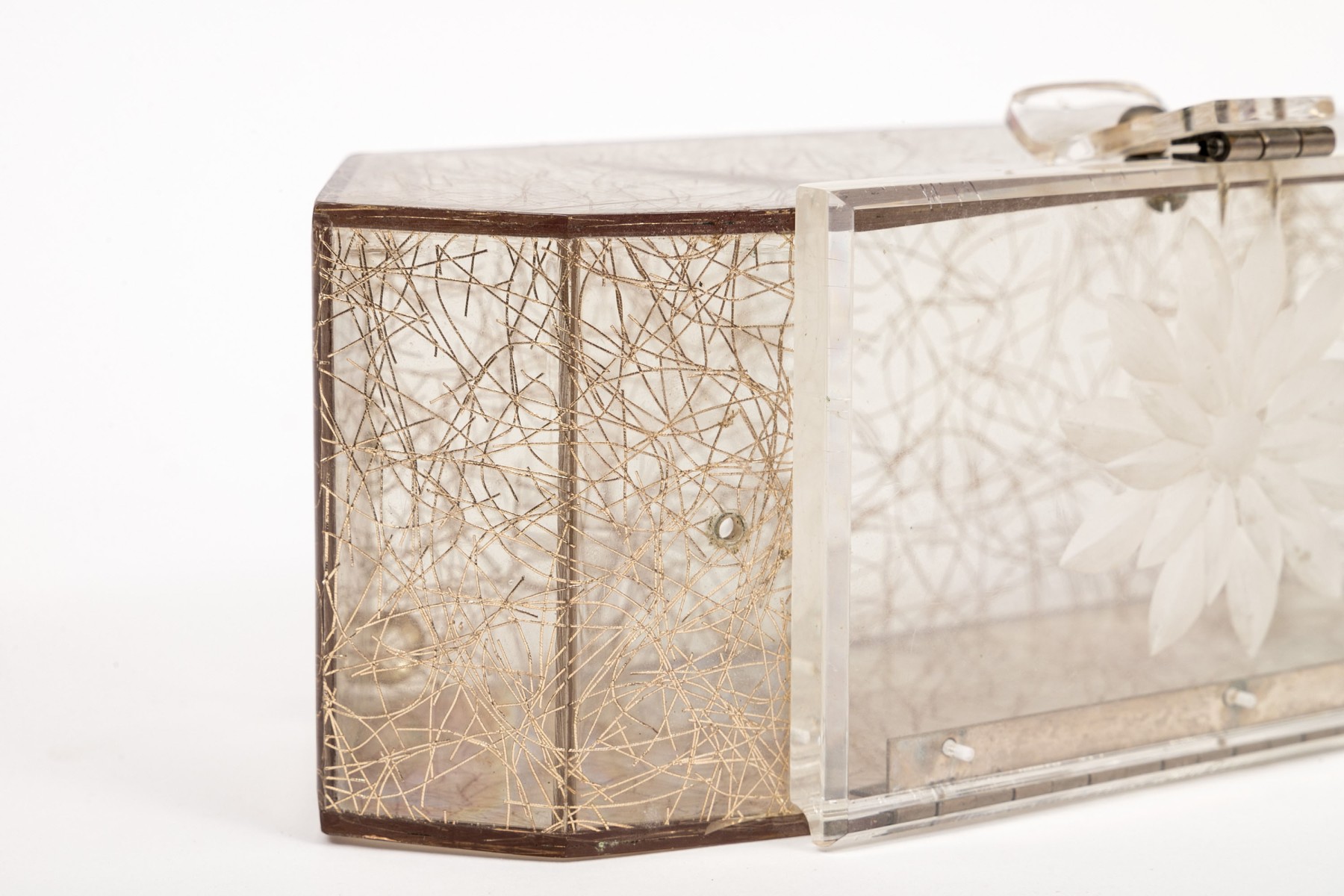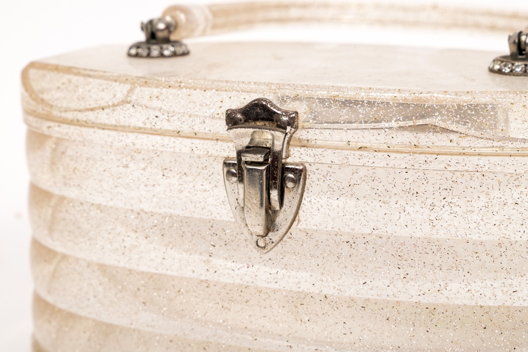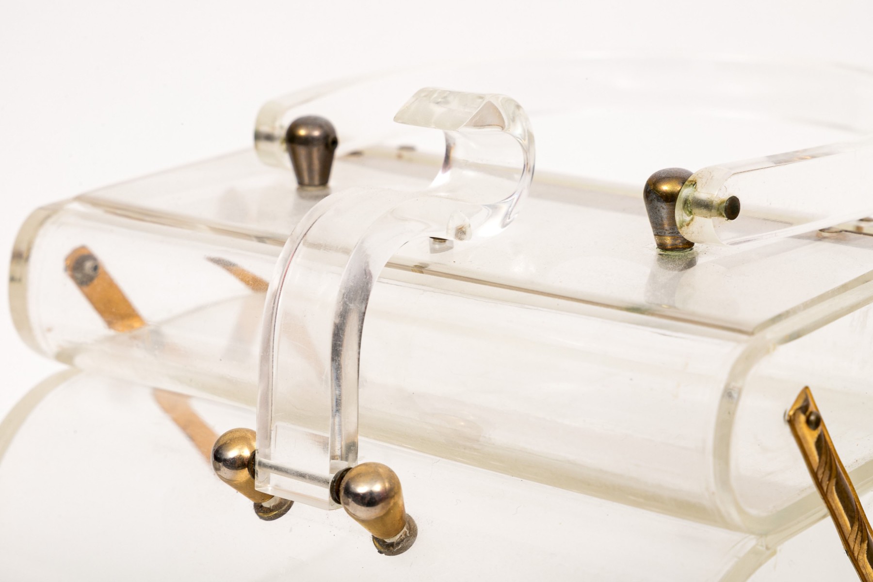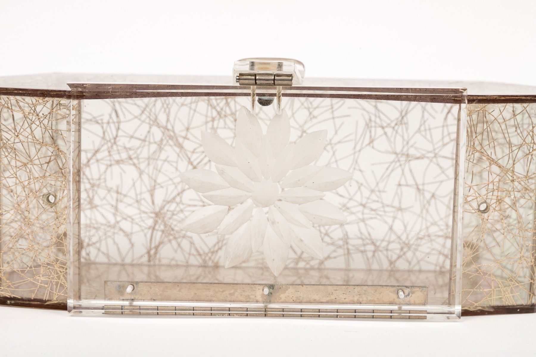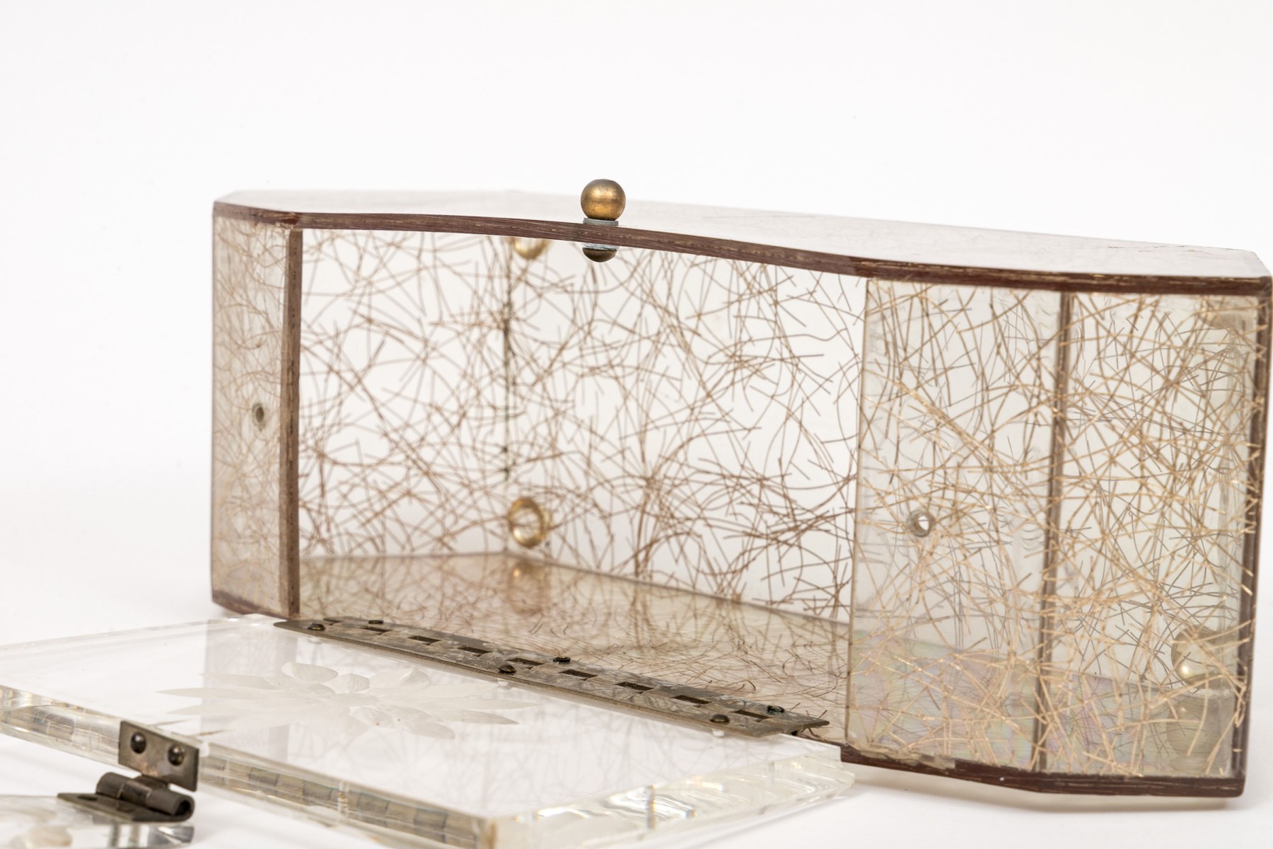 Some wear commensurate with some age and use along with storage. Slight wear to the mounts and lucite but overall a great lot of vintage handbags and dresser boxes. Please review the photos as they are part of the condition report.