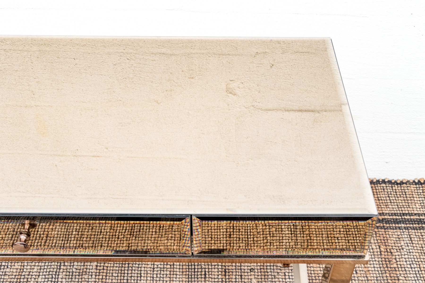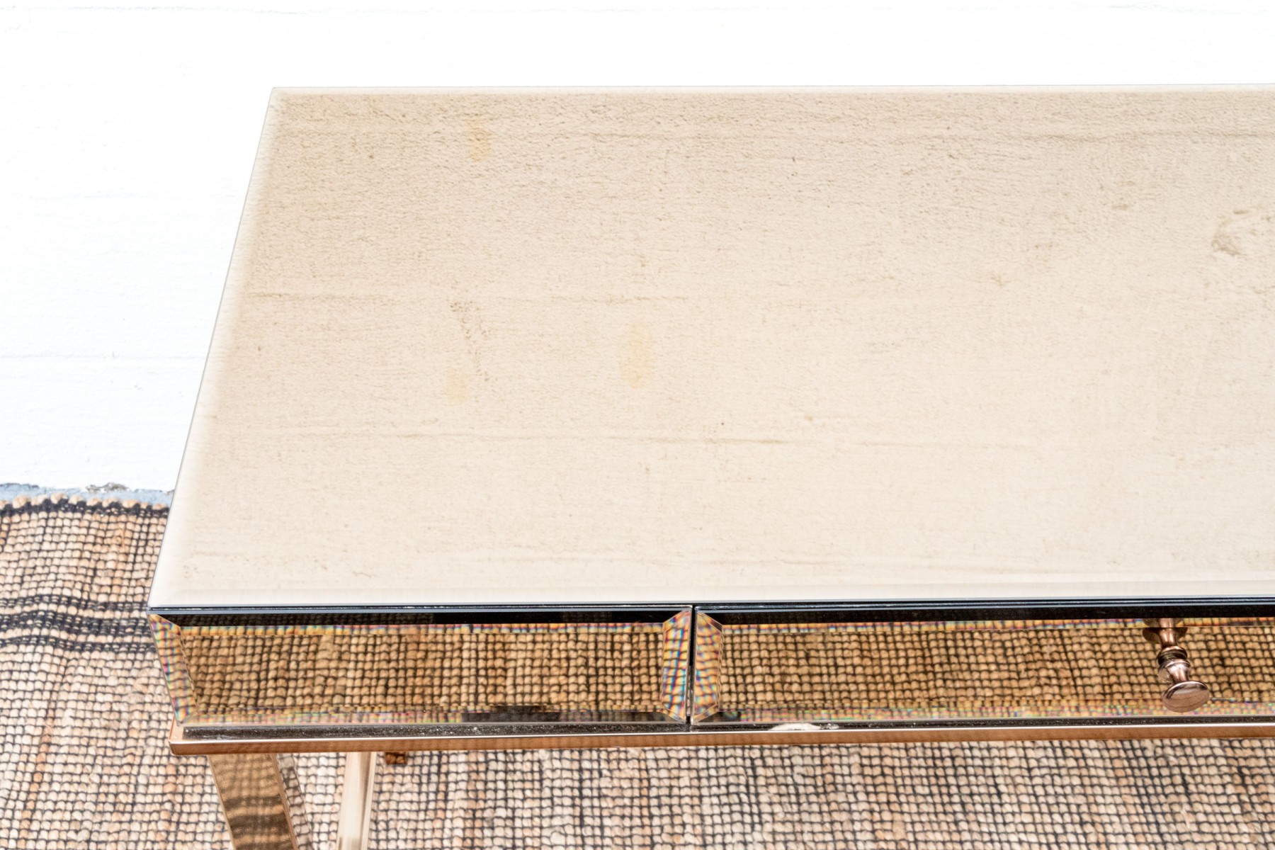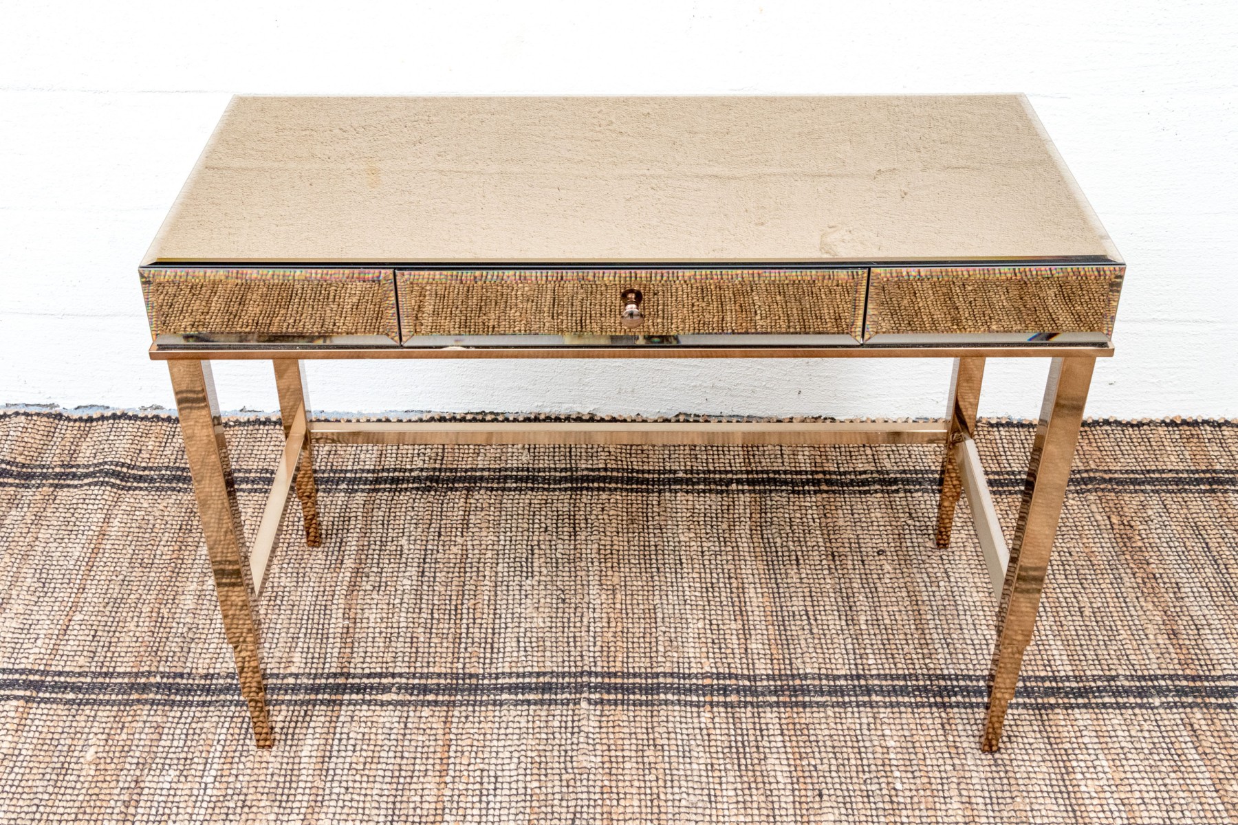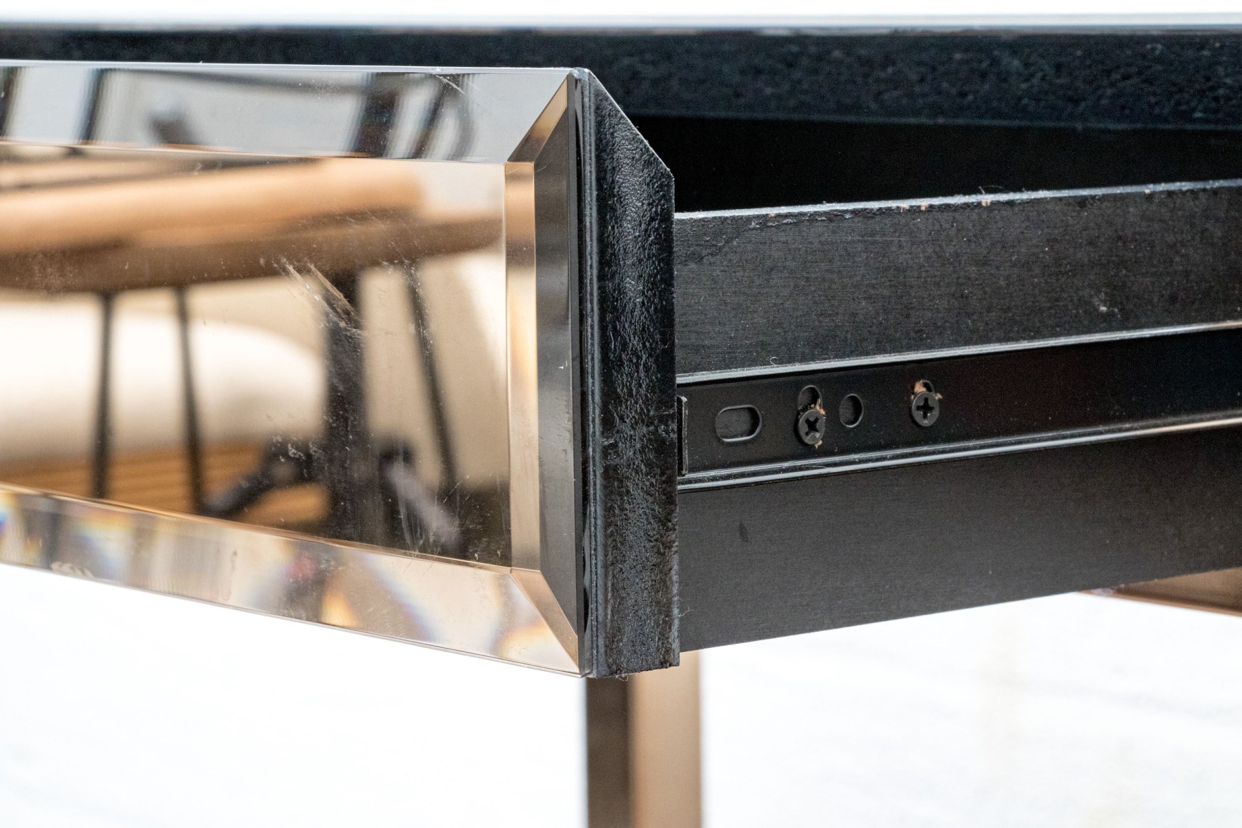 A chic Willa Arlo Interiors "Nyasha" writing desk featuring a luxurious mirrored top and beveled panels along the apron supporting a single drawer. Raised on a an iron frame with stepped legs adding a touch of Art Deco and Hollywood Regency flare.