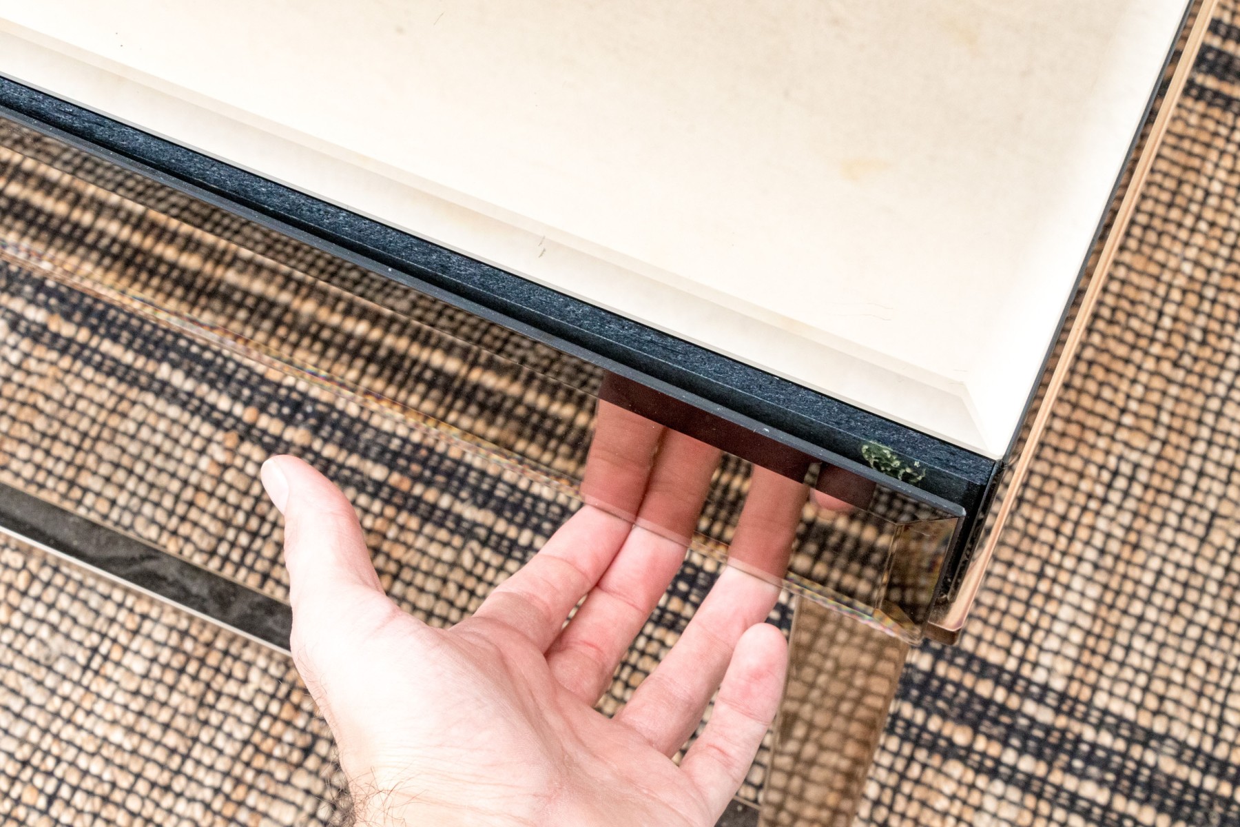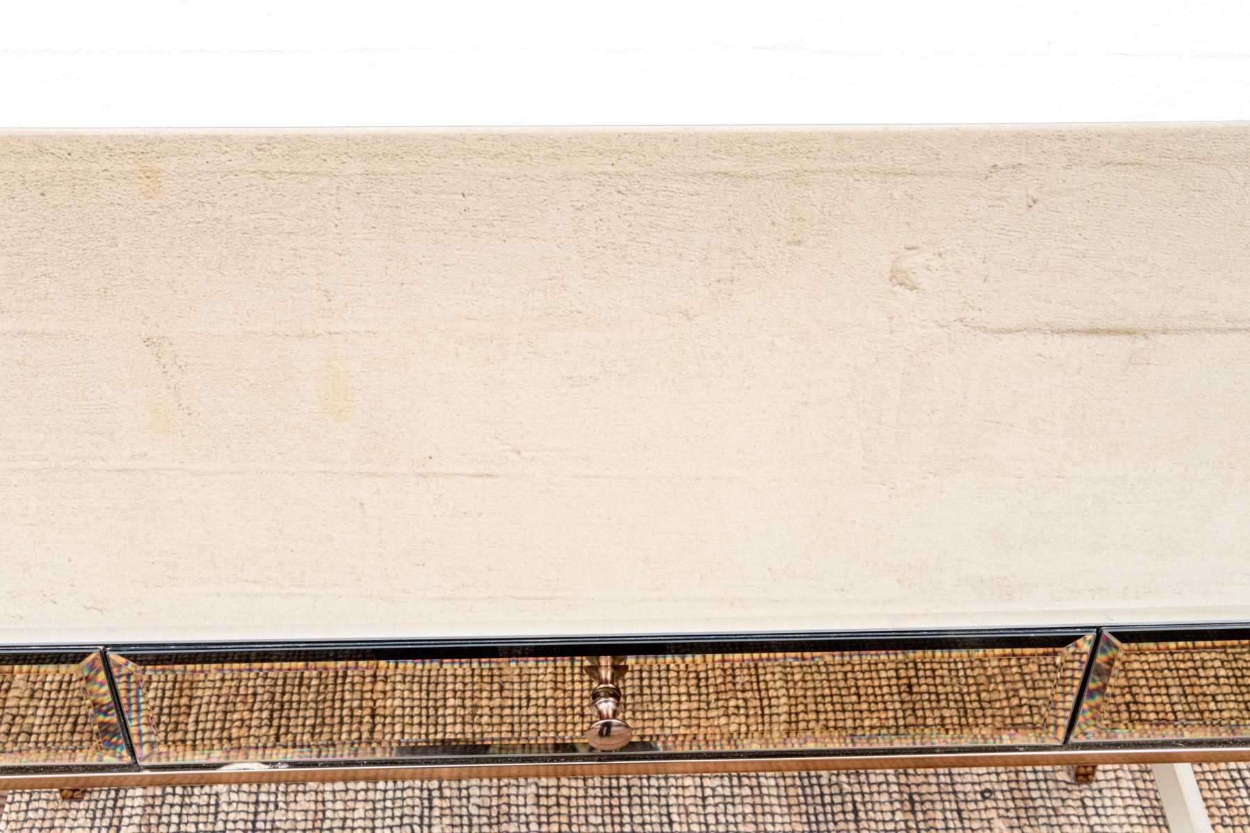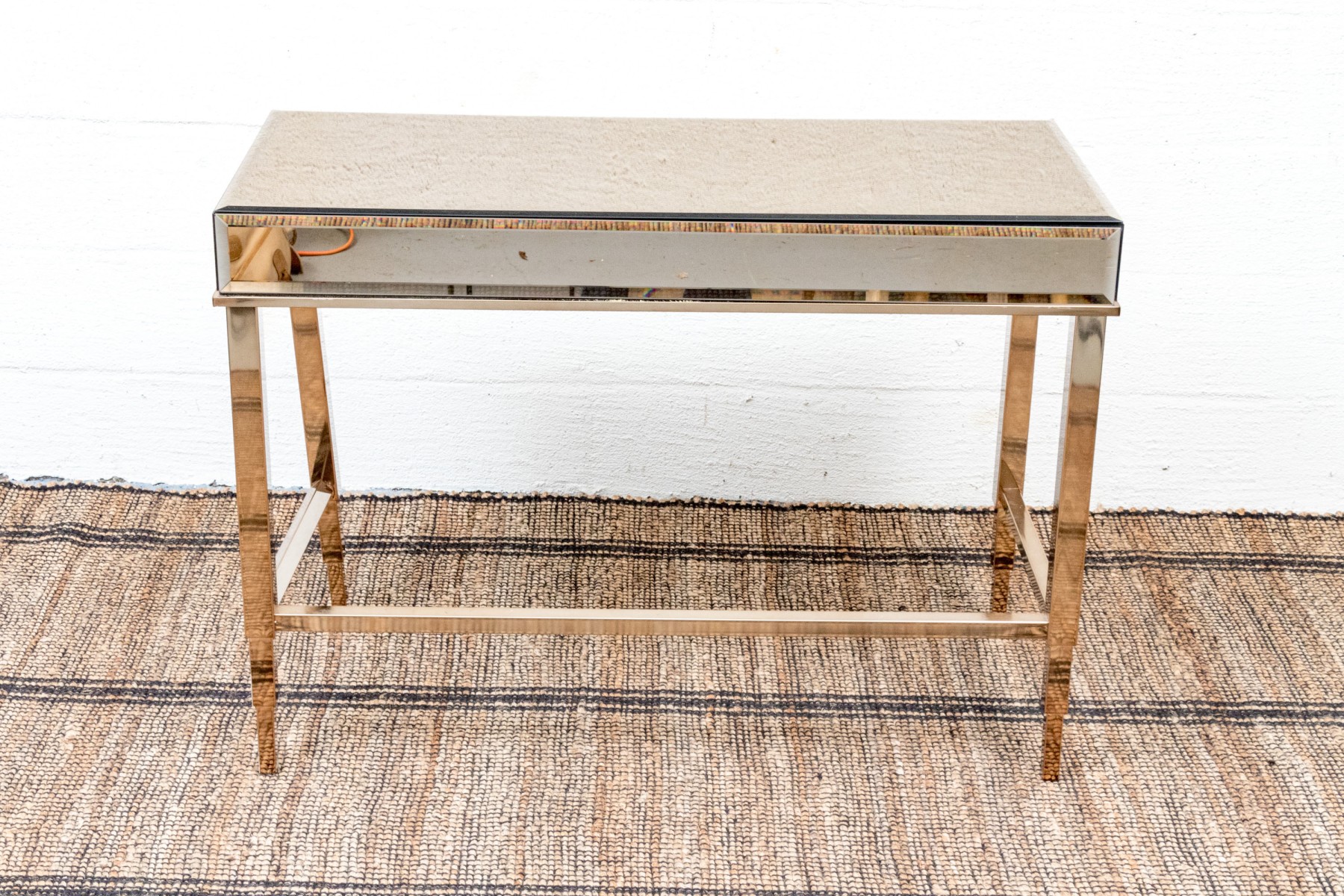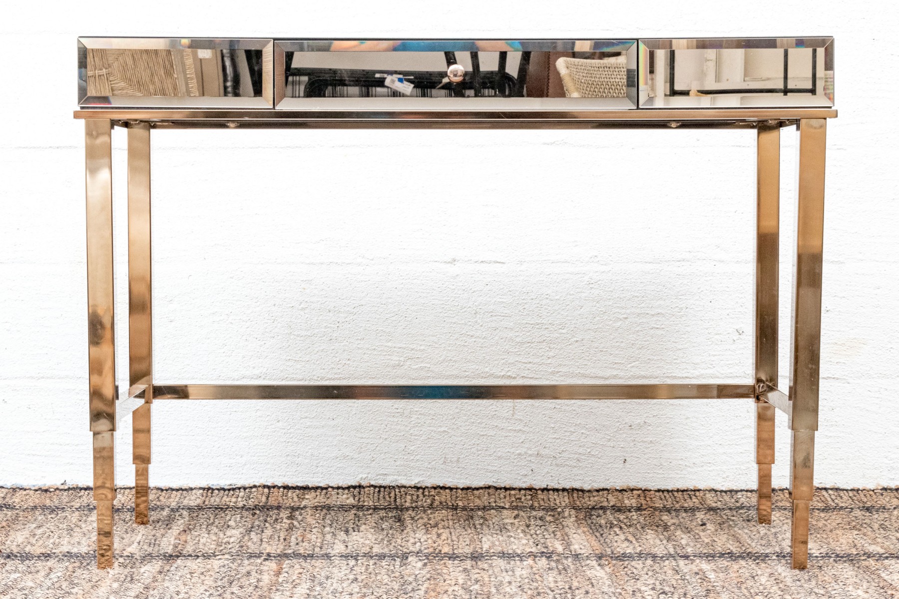 A chic Willa Arlo Interiors "Nyasha" writing desk featuring a luxurious mirrored top and beveled panels along the apron supporting a single drawer. Raised on a an iron frame with stepped legs adding a touch of Art Deco and Hollywood Regency flare.