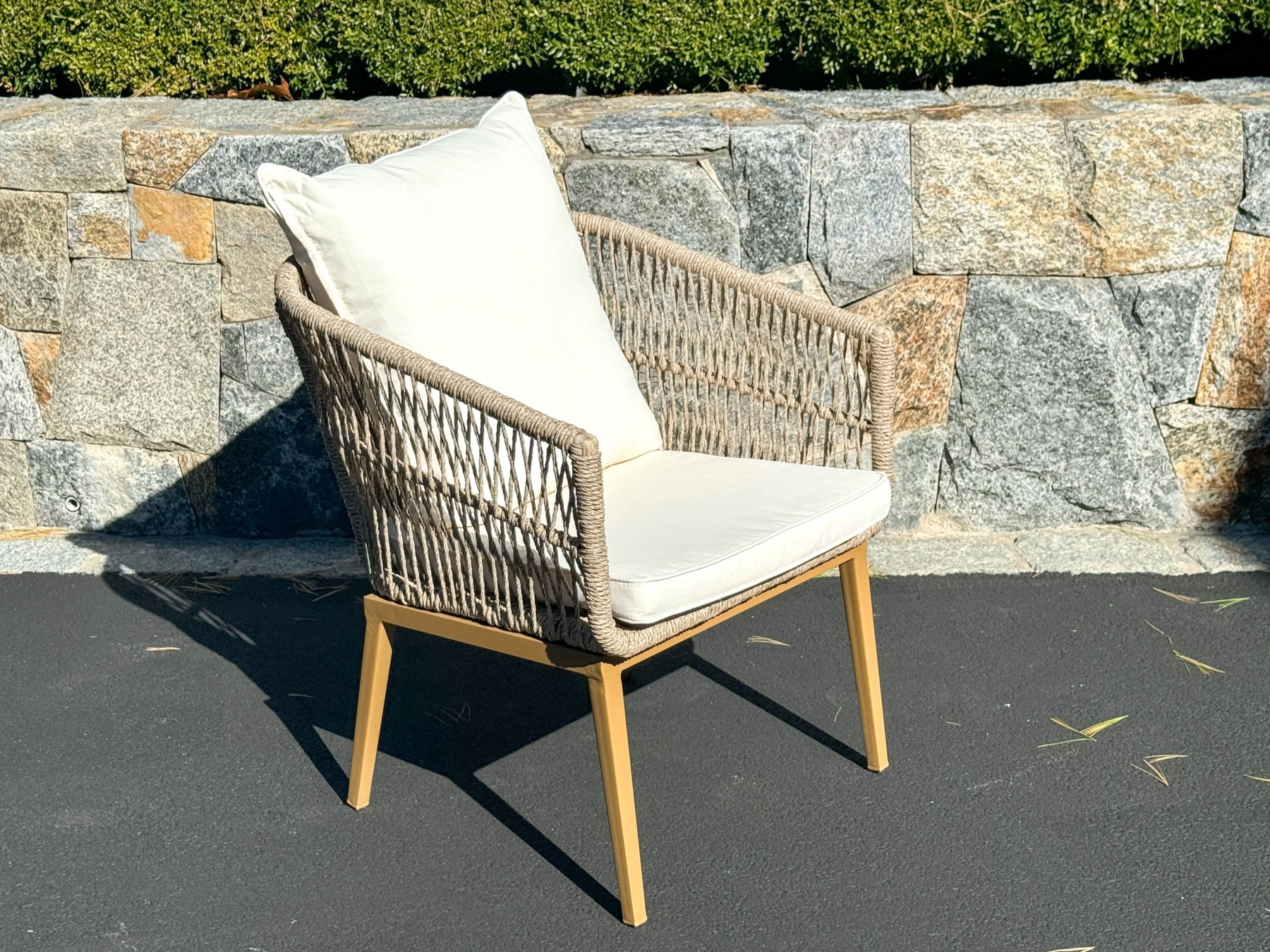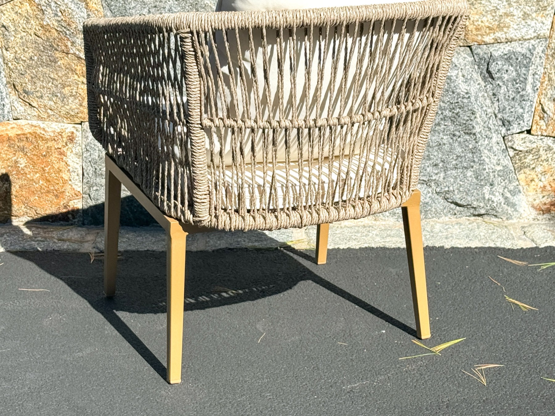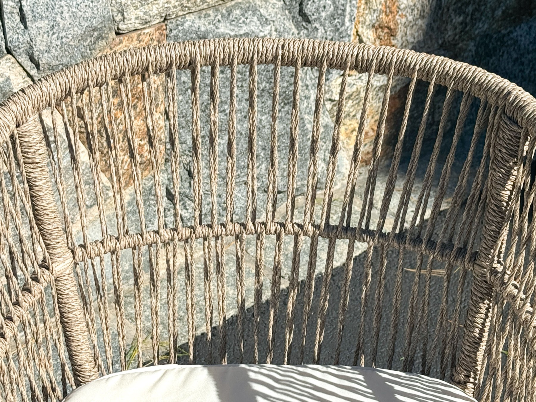A stylish armchair with a wonderful natural boho appearance, showcasing a beige rope woven tub back with a wrapped border surrounding a loose back and seat cushion in clean white. Raised on a honeyed frame with simple tapered and angled legs.