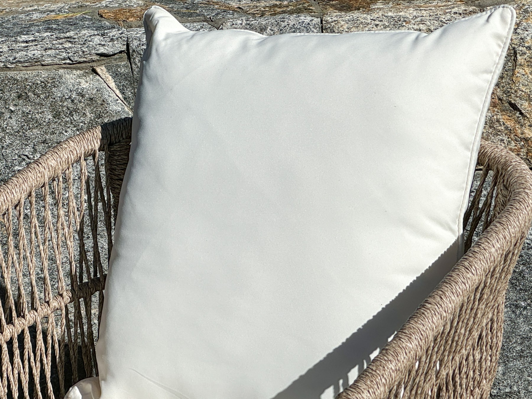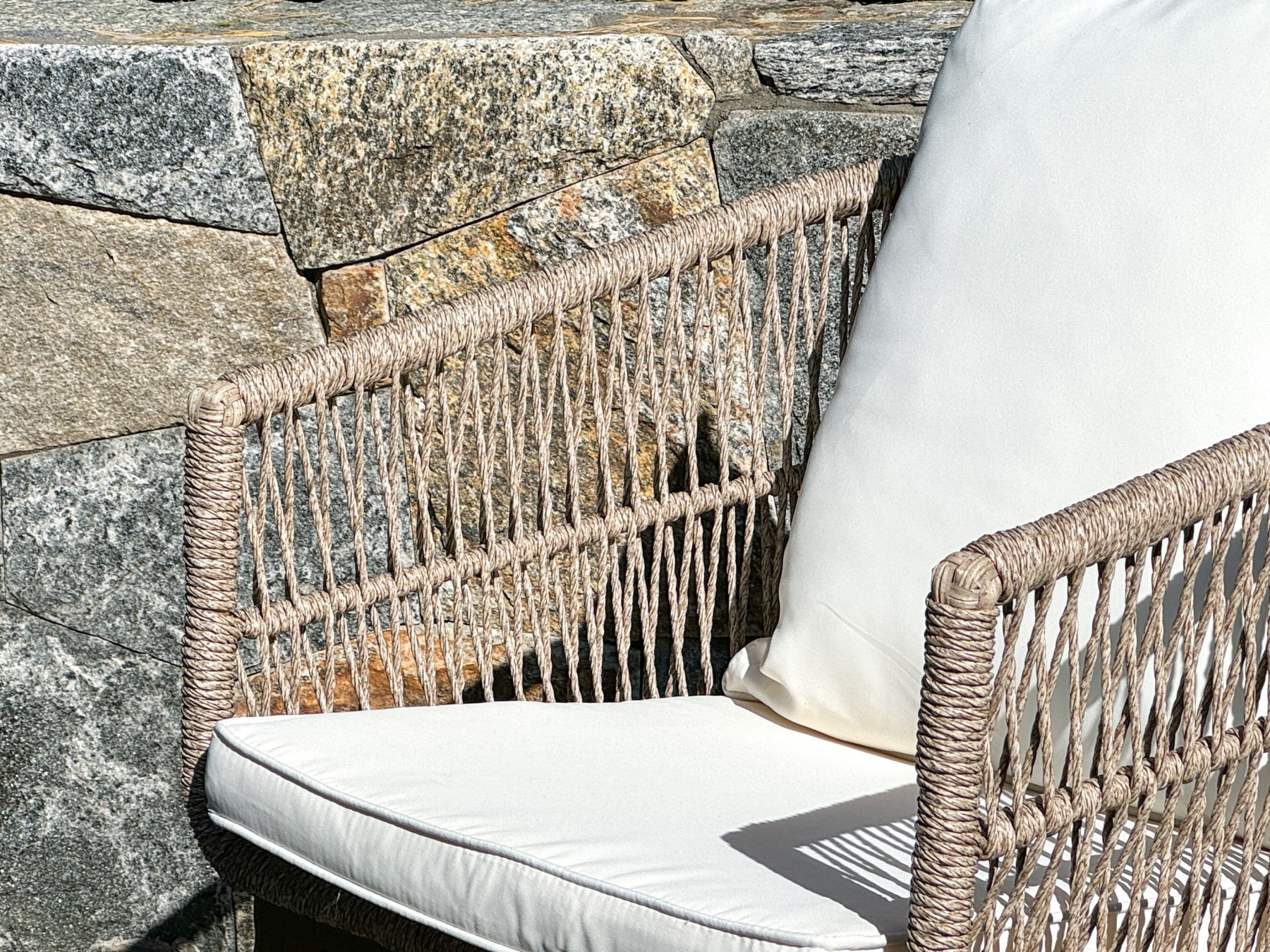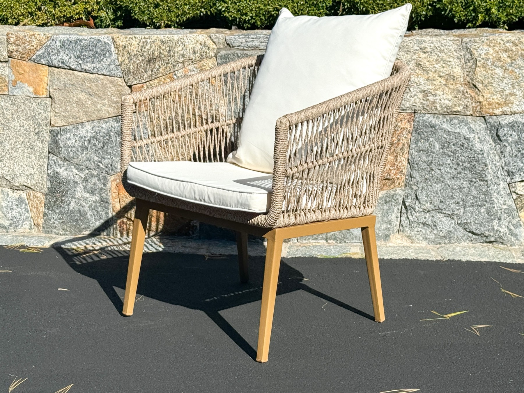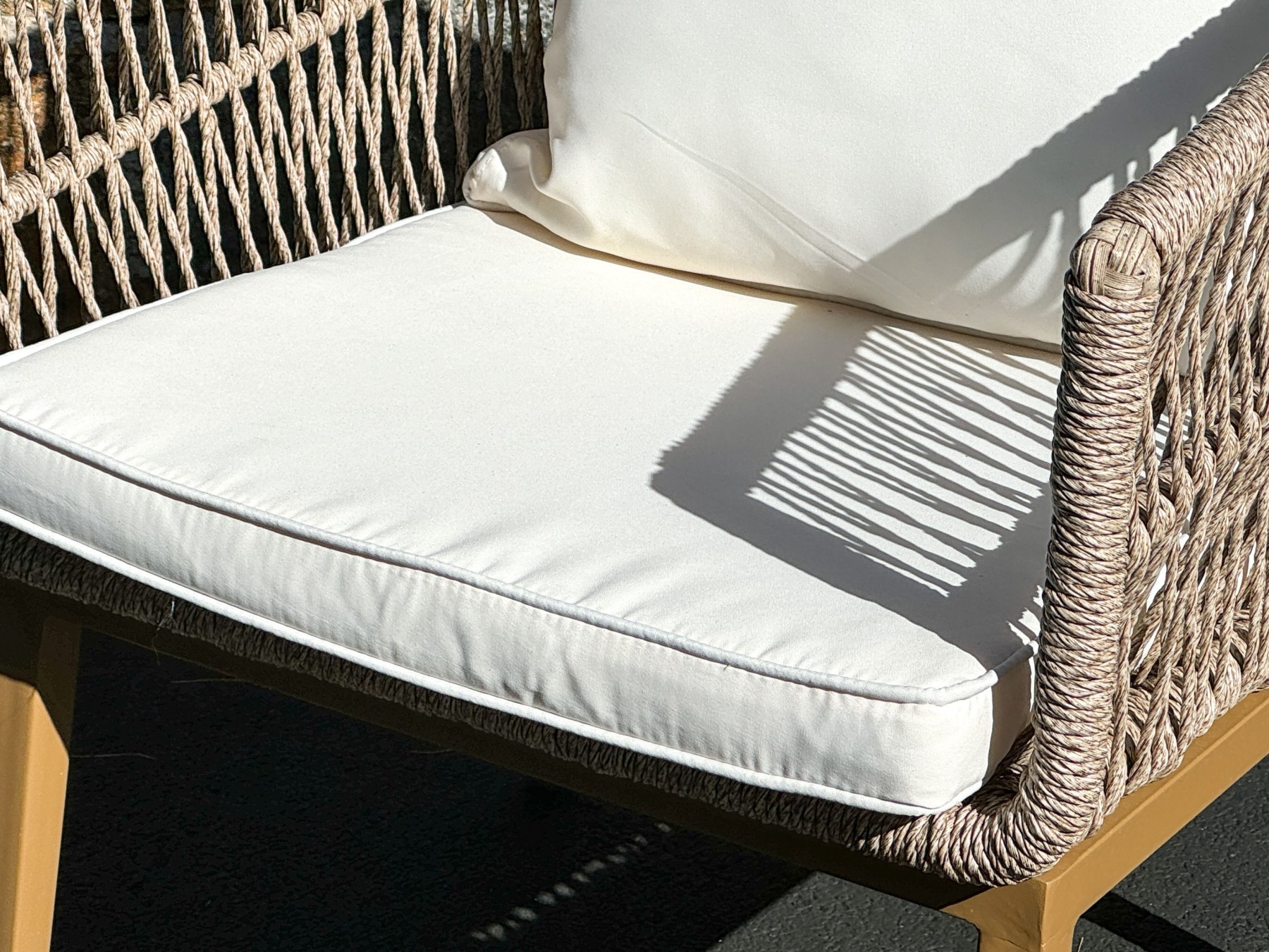 A stylish armchair with a wonderful natural boho appearance, showcasing a beige rope woven tub back with a wrapped border surrounding a loose back and seat cushion in clean white. Raised on a honeyed frame with simple tapered and angled legs.