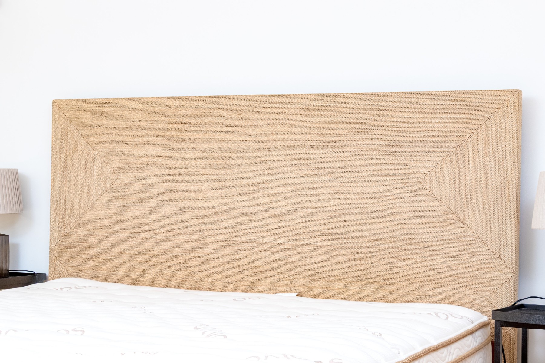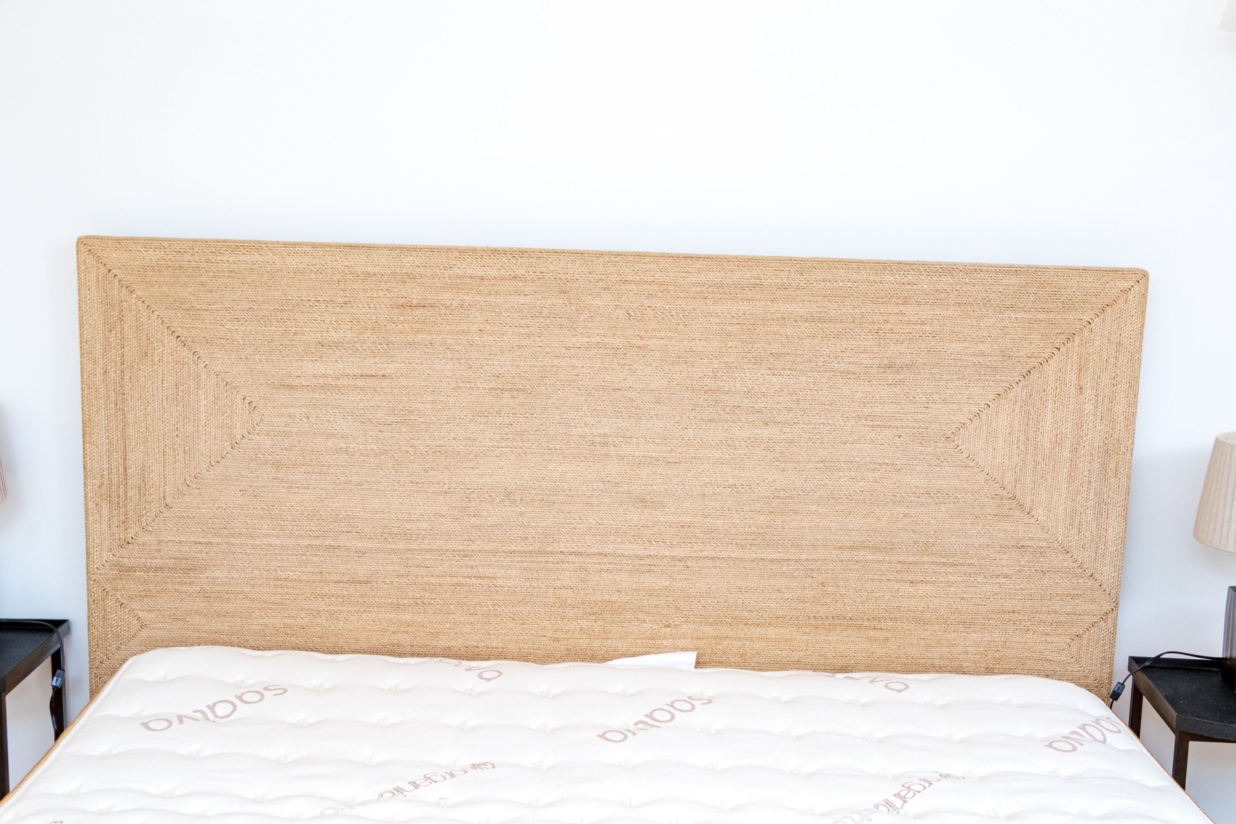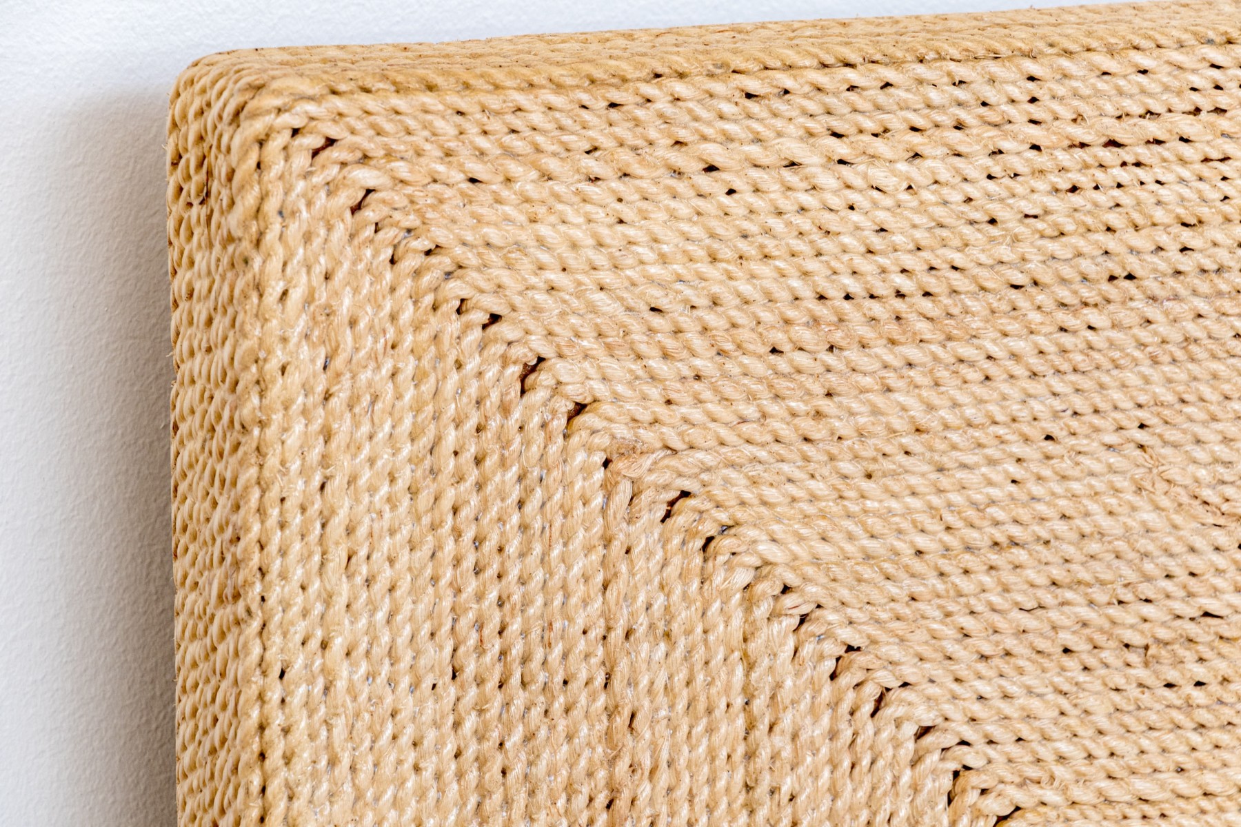A chic king size bedstead with great beachy and boho style for a relaxed yet stylish appearance. The bed frame sports a large, minimalist rectangular headboard wrapped in rope laid to create triangular motifs on the sides, echoing the design around the corners of bracket feet around the flush height side rails and footboard.