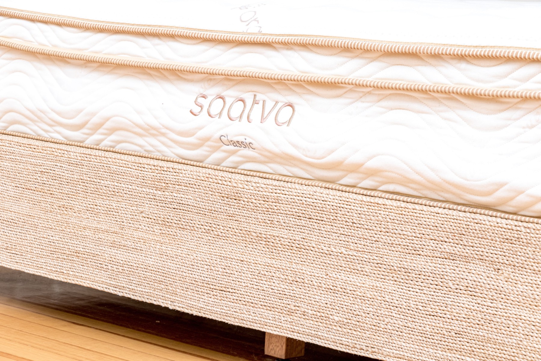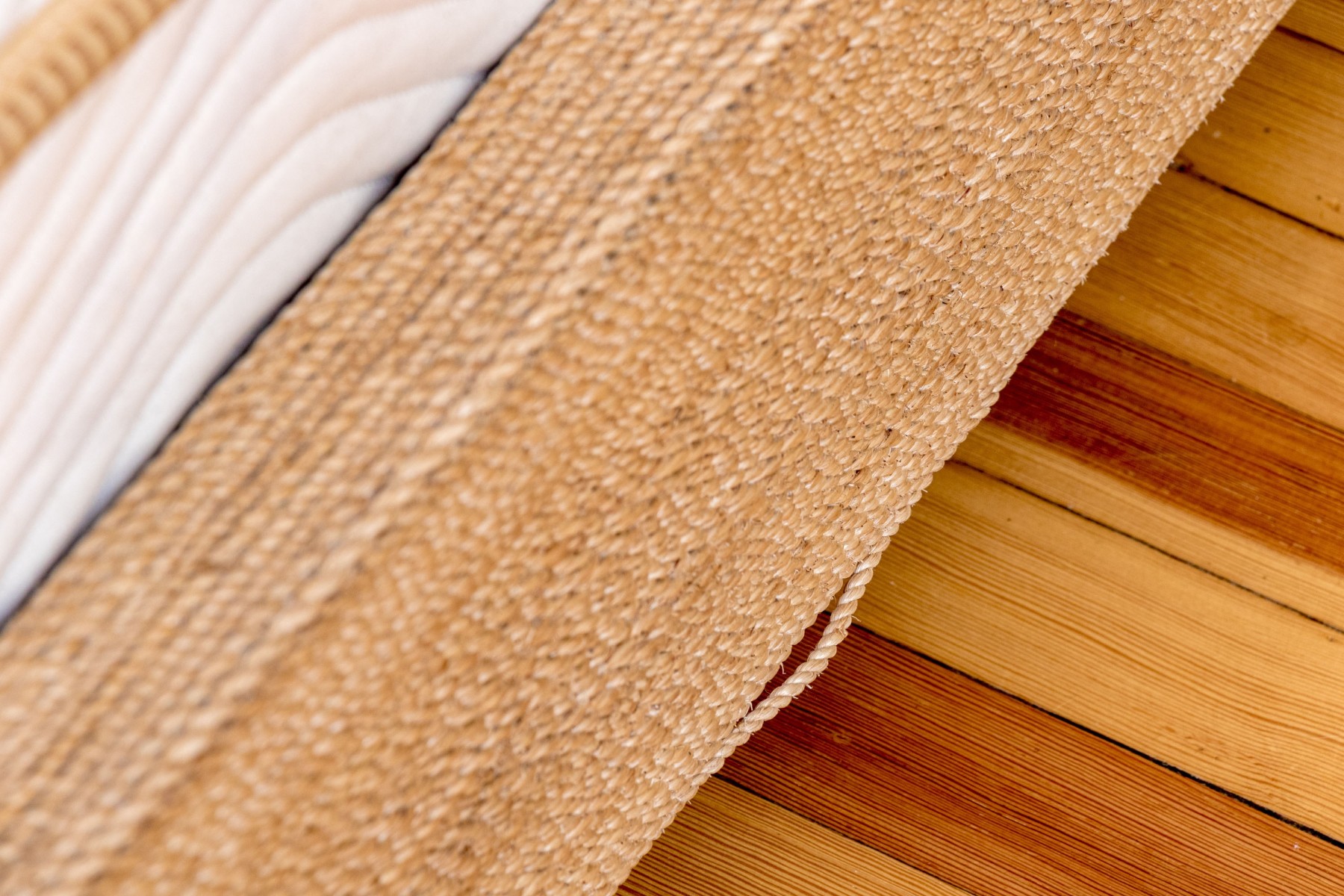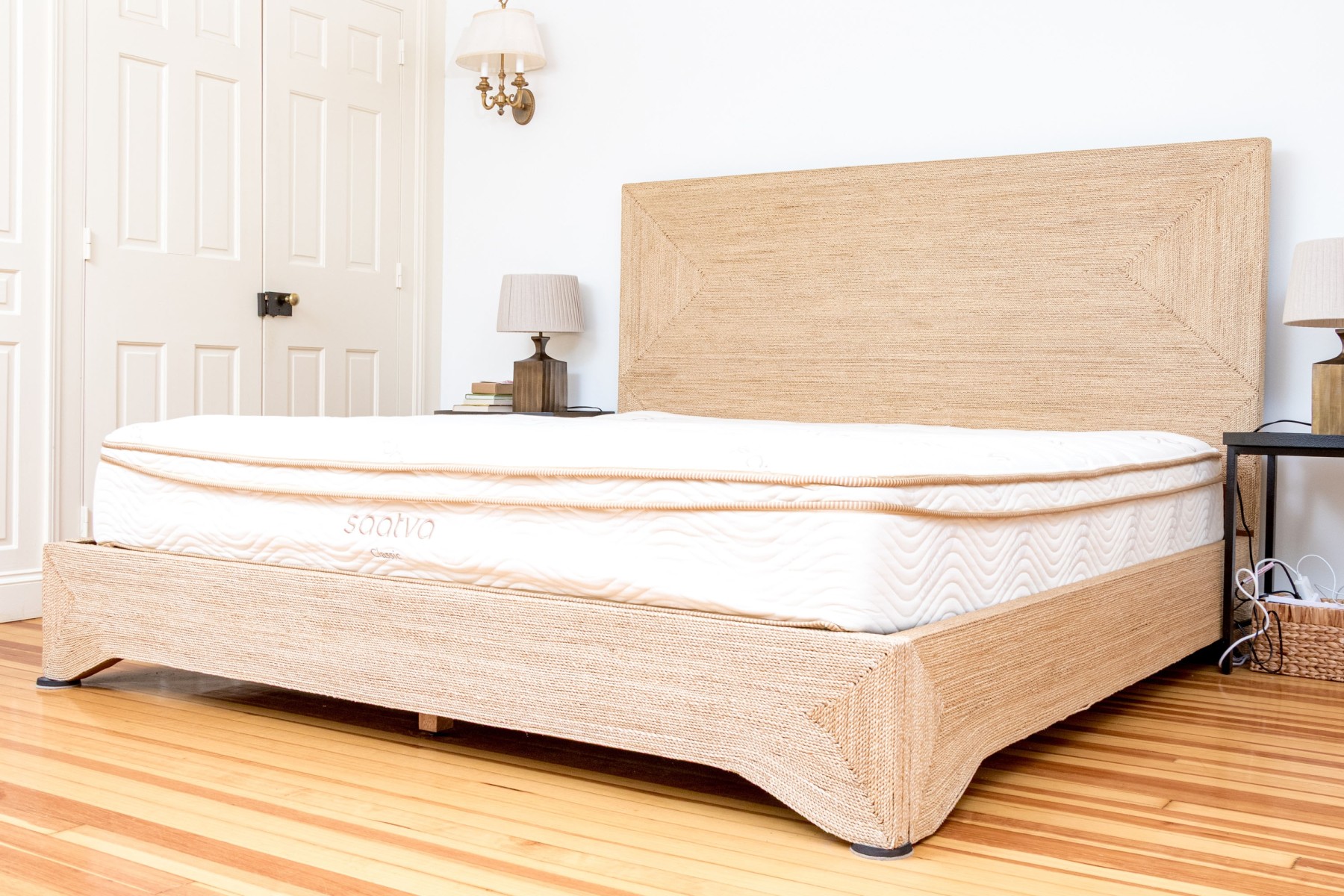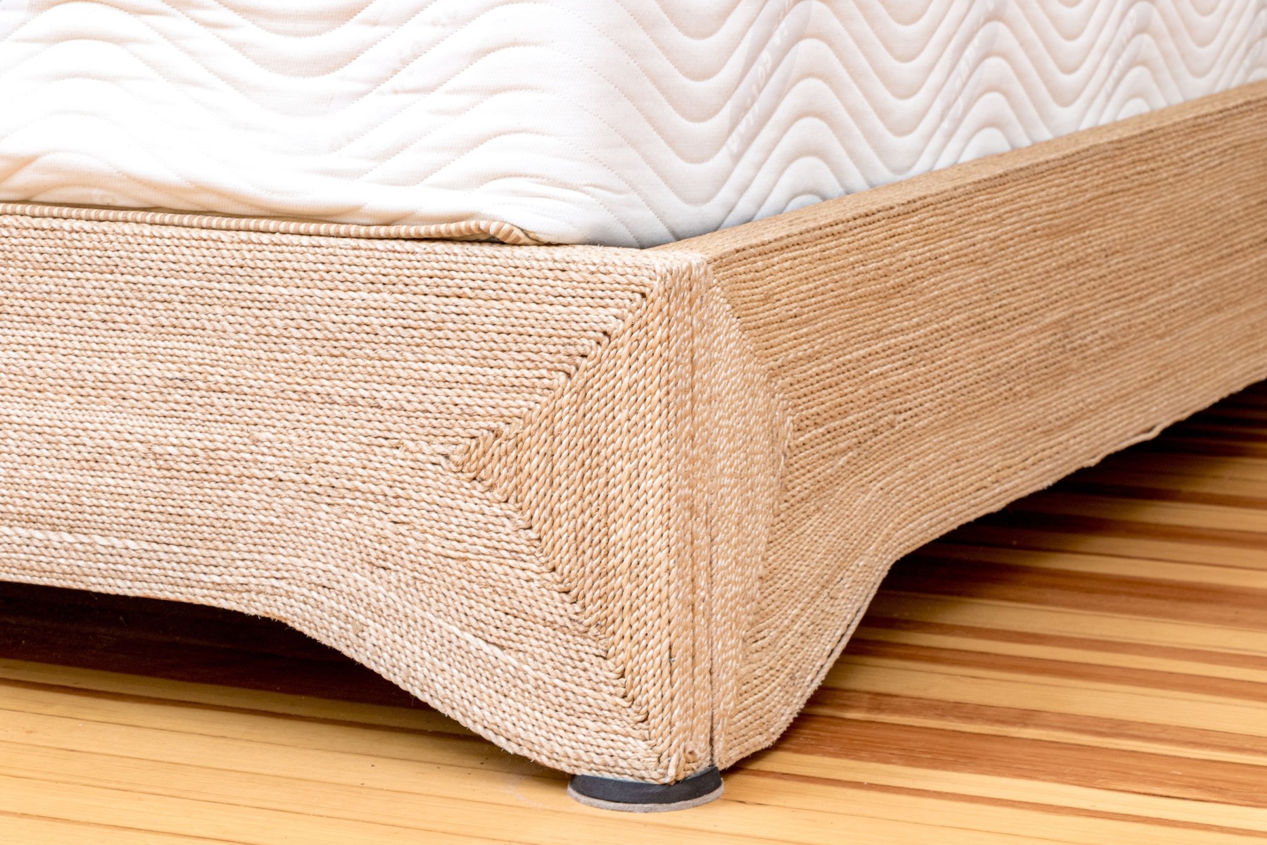 A chic king size bedstead with great beachy and boho style for a relaxed yet stylish appearance. The bed frame sports a large, minimalist rectangular headboard wrapped in rope laid to create triangular motifs on the sides, echoing the design around the corners of bracket feet around the flush height side rails and footboard.