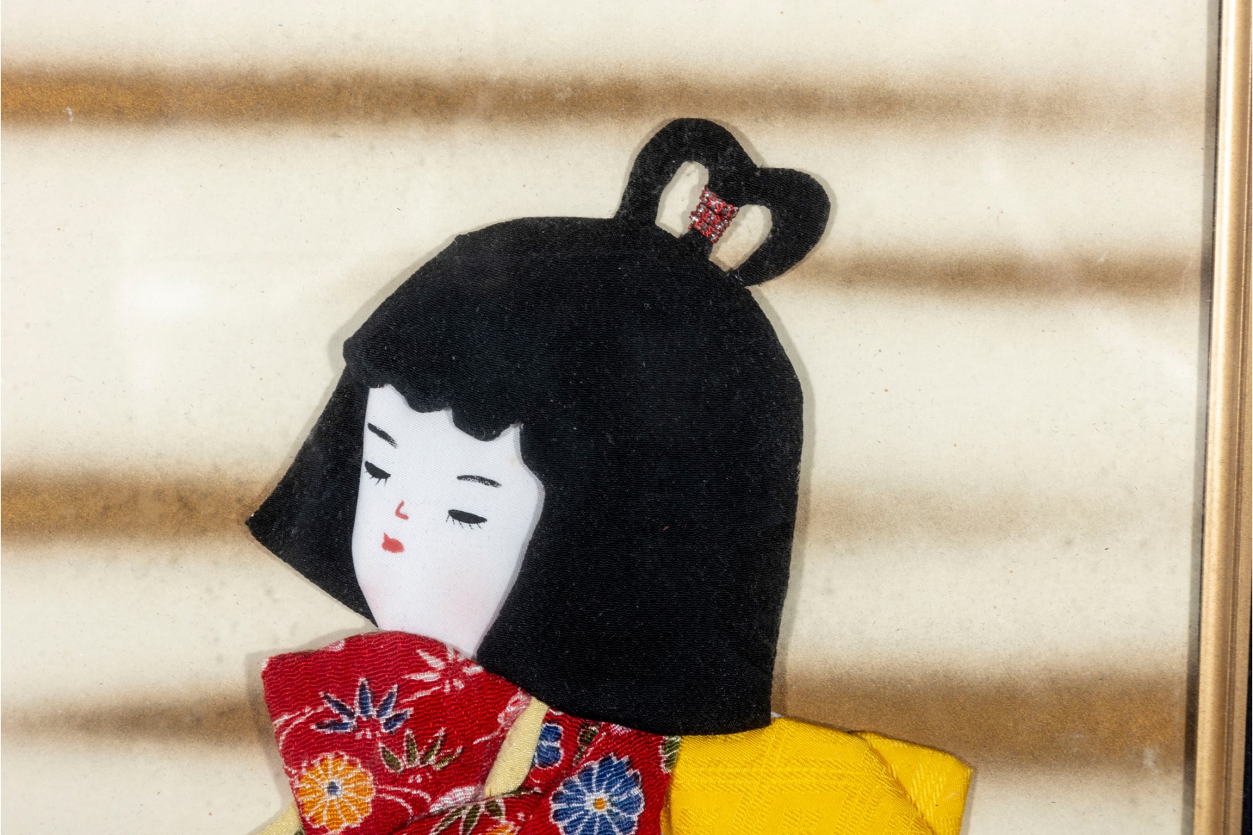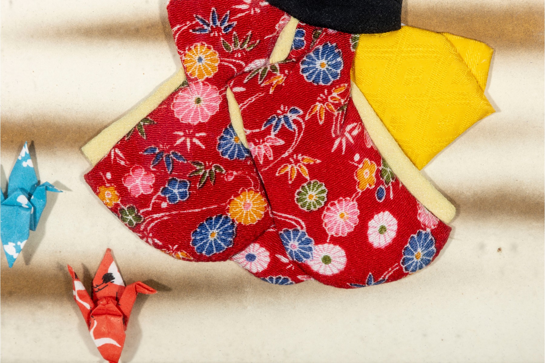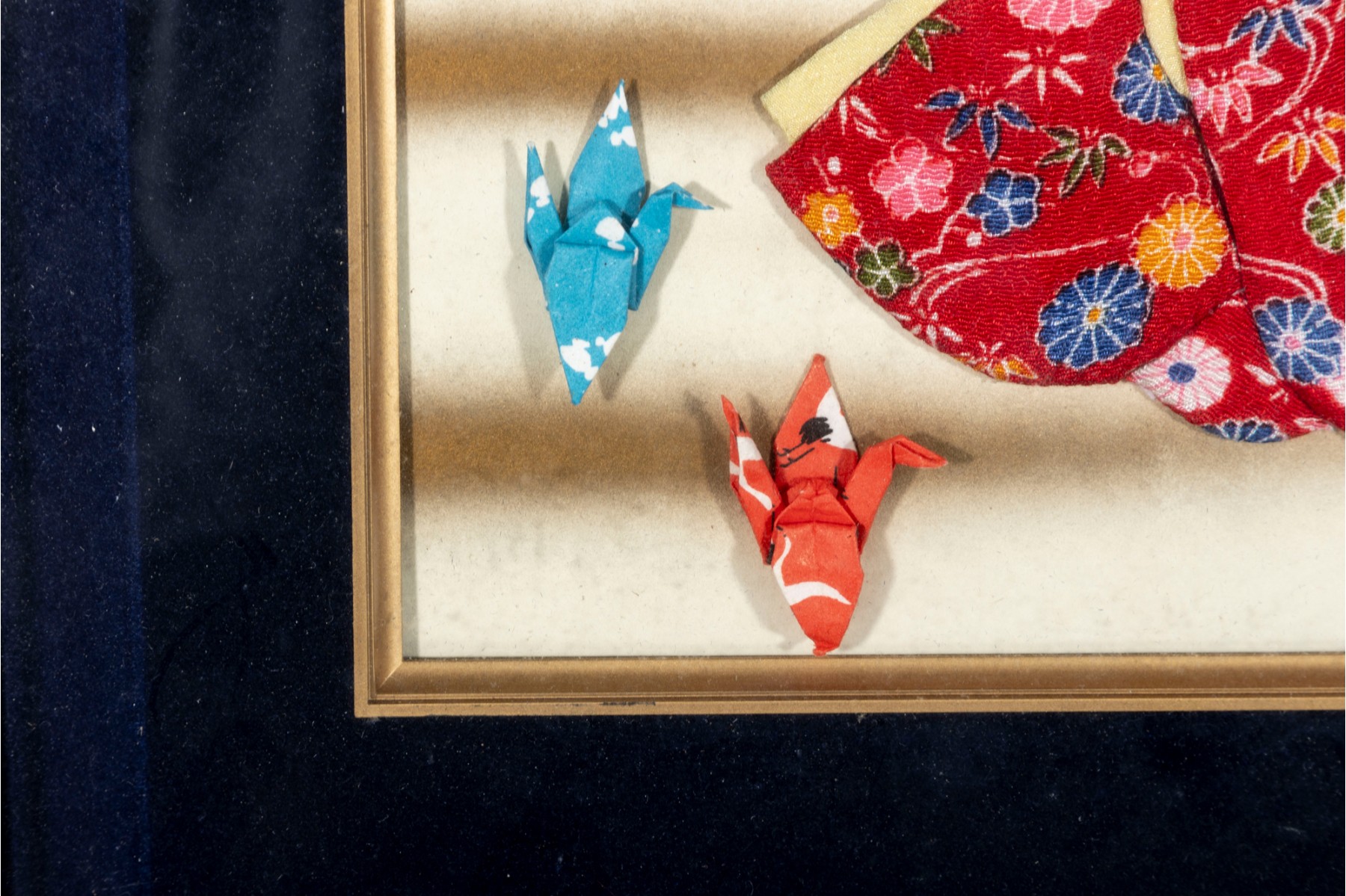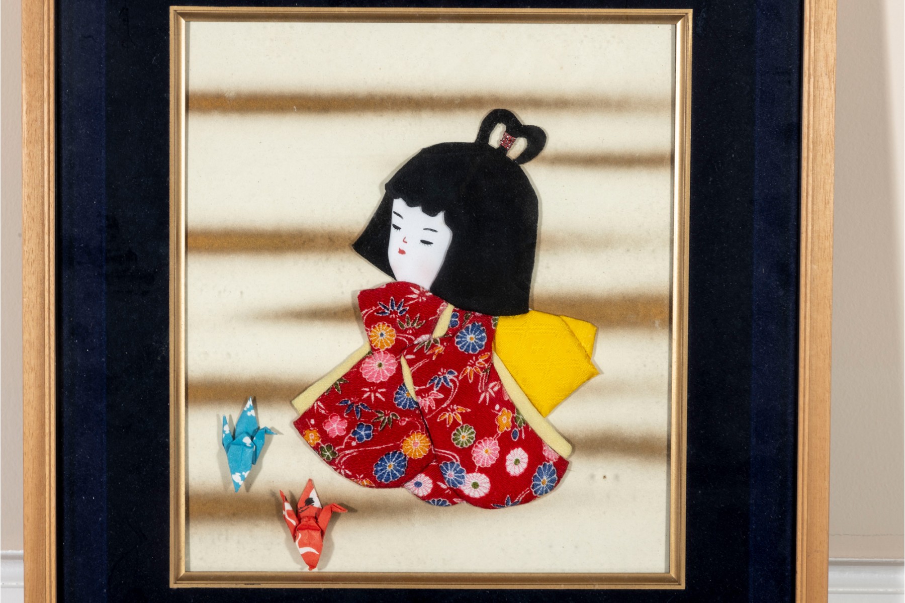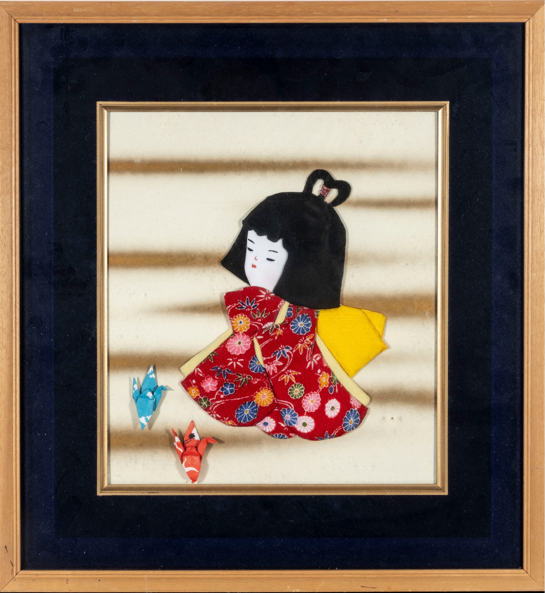 A traditional Japanese Oshie (Oshi-e), a form of Japanese handicraft originating from the Edo period. Built in layers, each piece is wrapped in beautiful kimono fabric or paper, padded with cotton in between, and is nailed/glued together to create a three-dimensional work of art. Beside the girl are two origami cranes fastened in place. The artwork is unsigned and presented in a wood shadow-box frame with a glass facing.