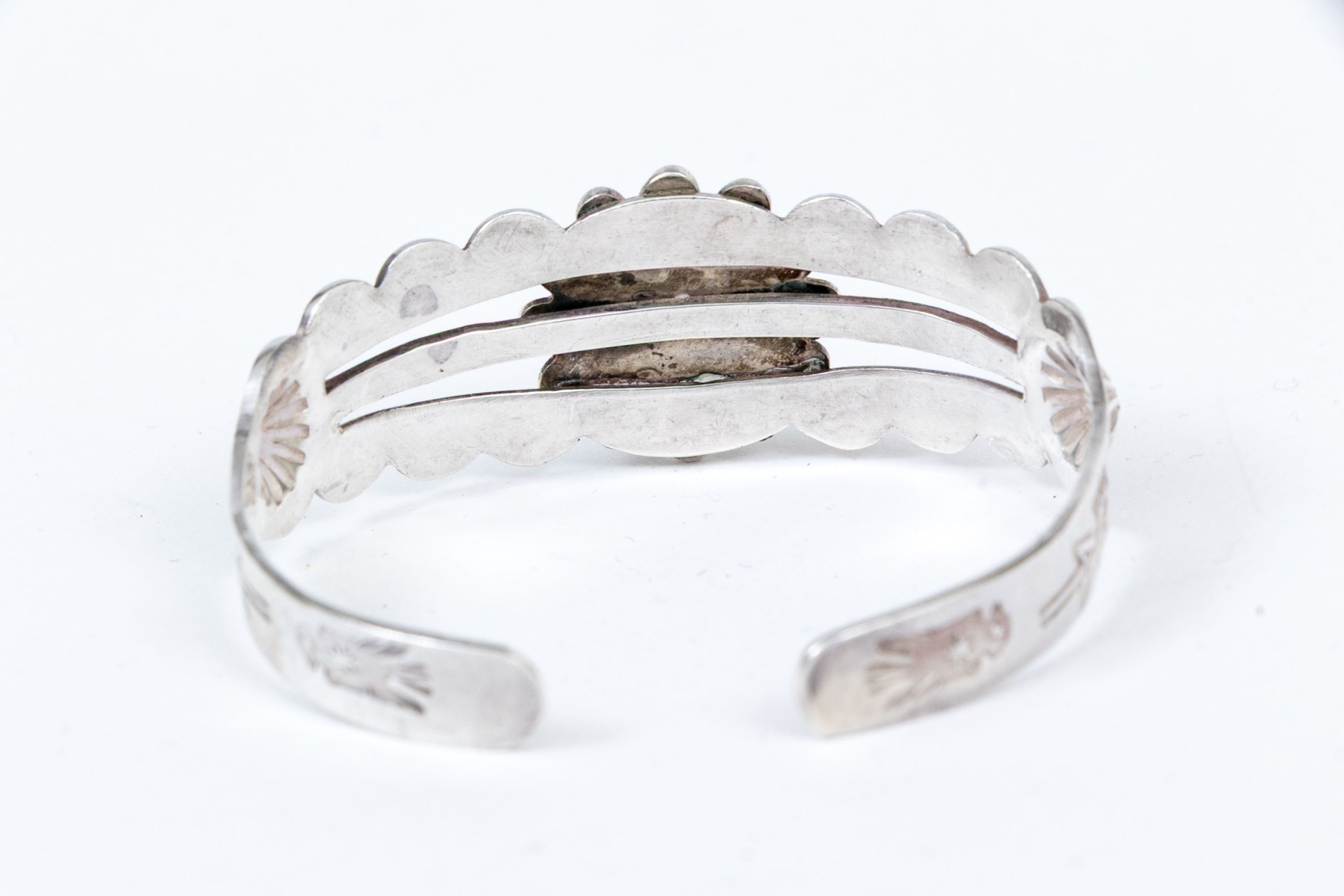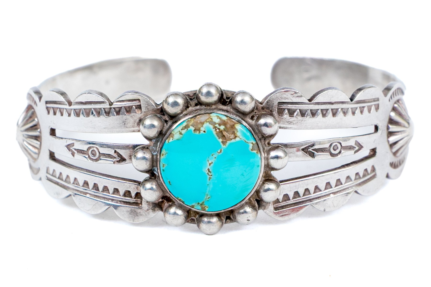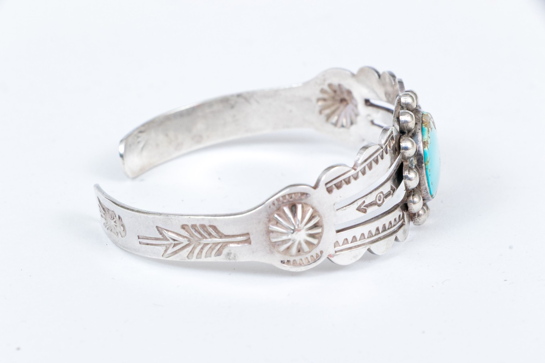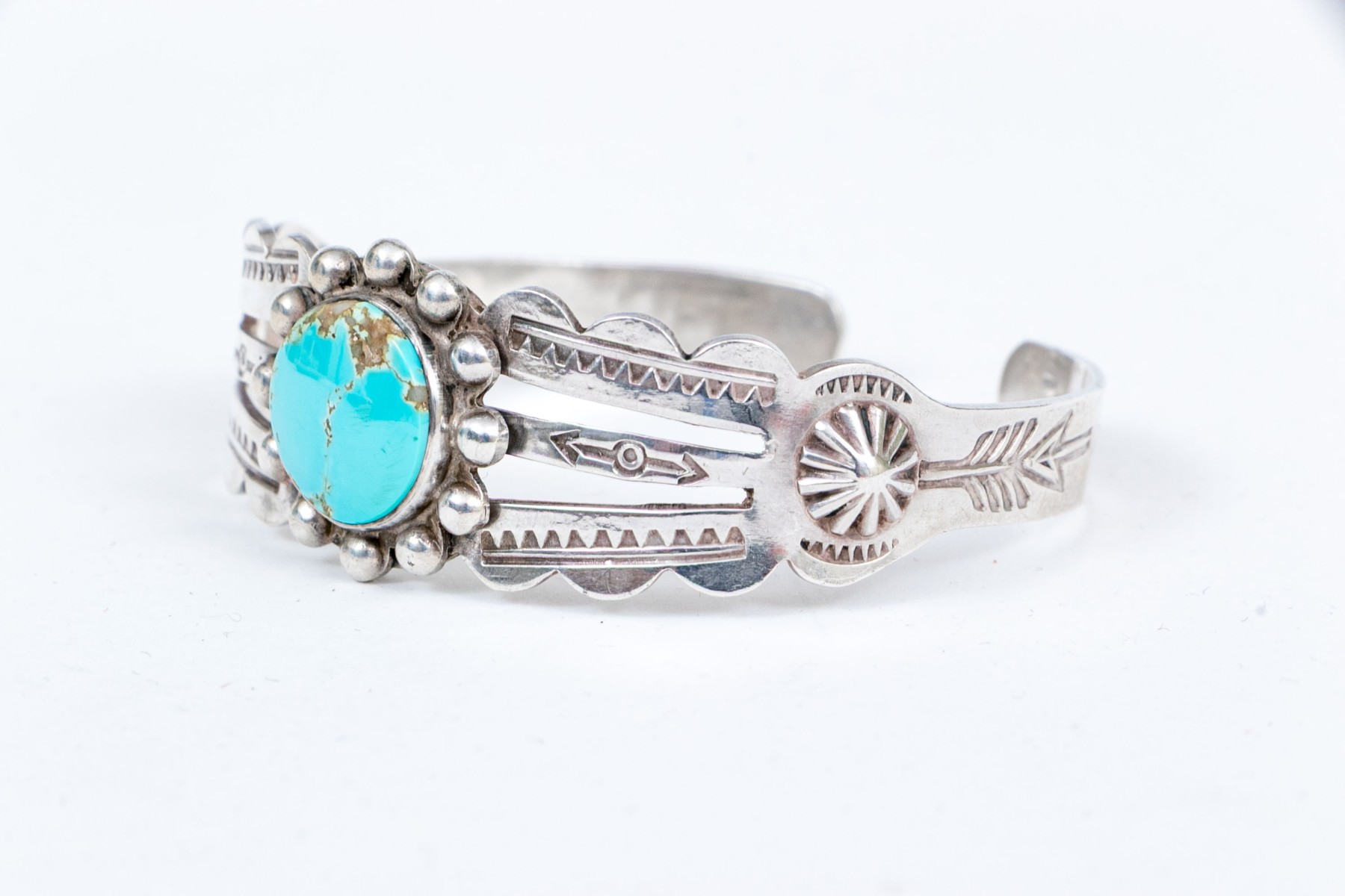 A delightful child-sized sterling silver cuff bracelet showcasing a circular turquoise in a bezel setting surrounded by a large beaded trim at the center of a pierced and scalloped band with geometric motifs. Unmarked or with the mark worn away, tested sterling.