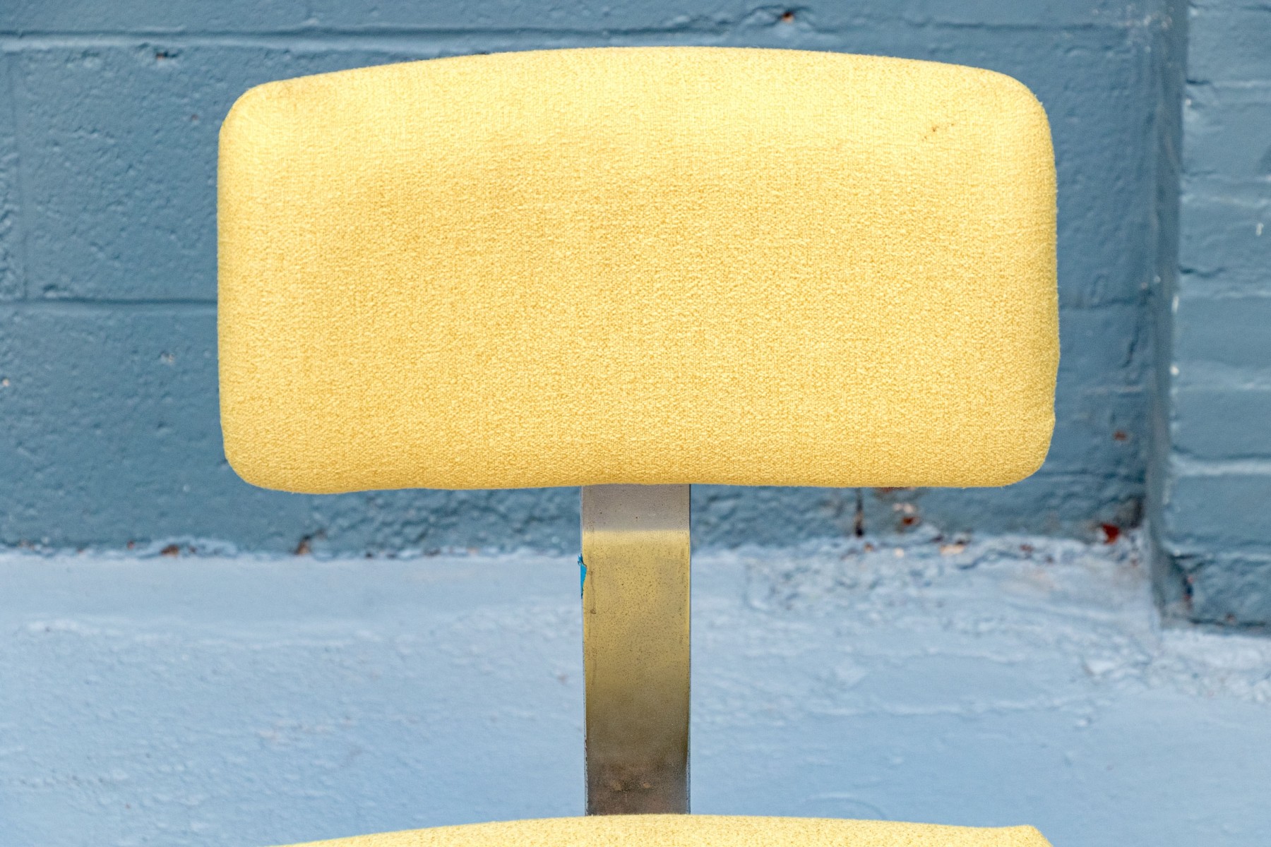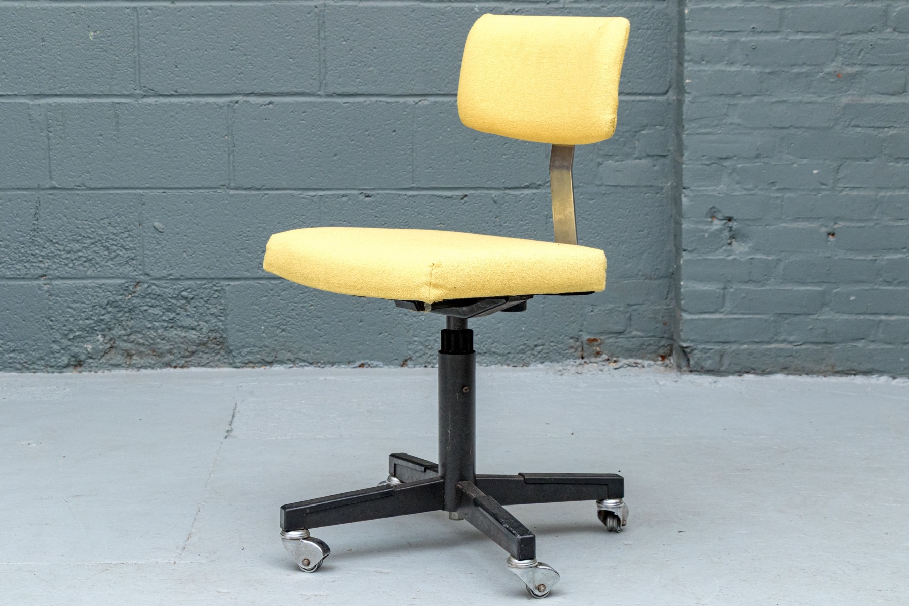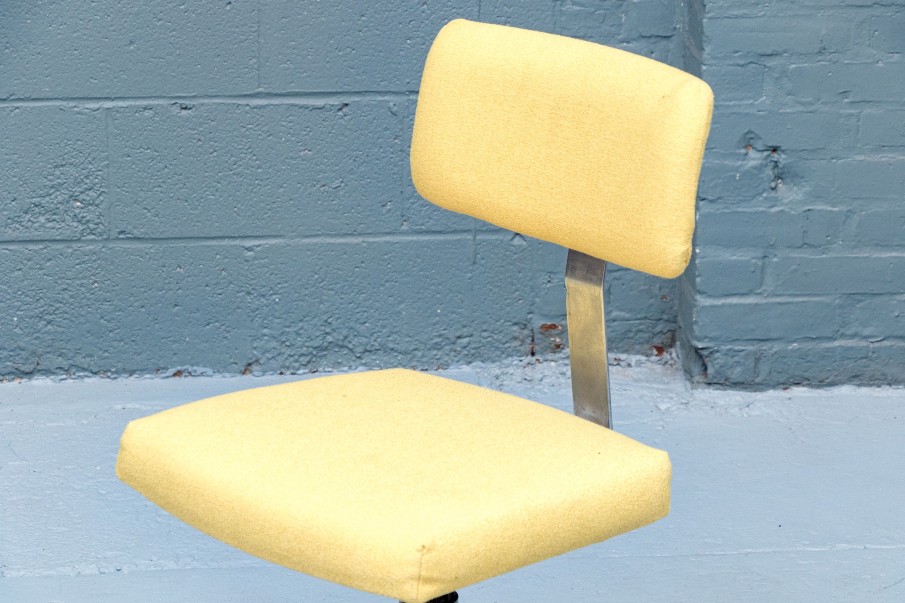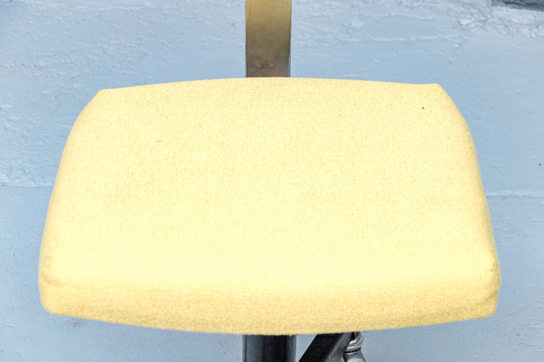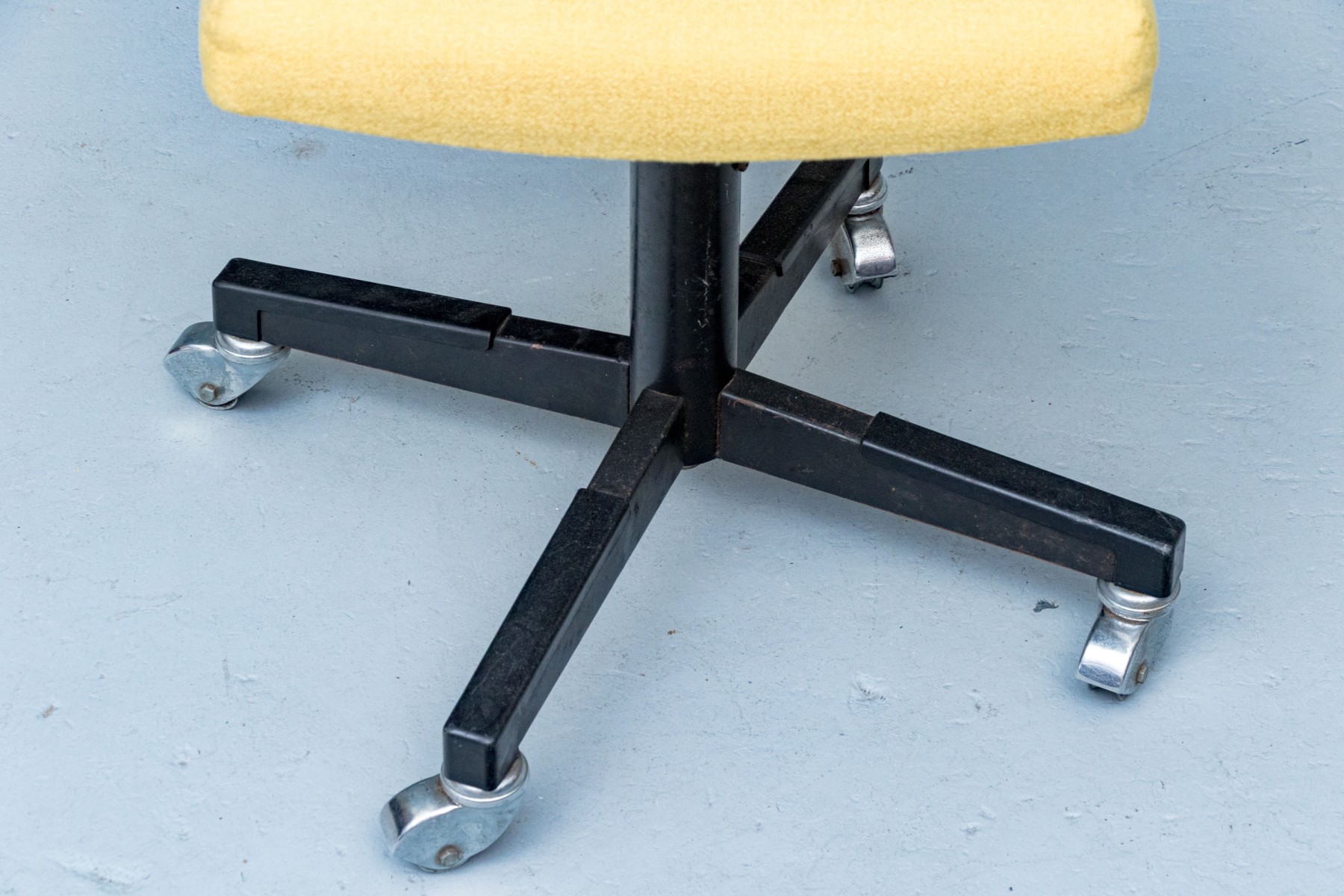 On black finished four spoked base with casters to each spoke with swivel action yellow upholstered seat cushion and seat back cushion.