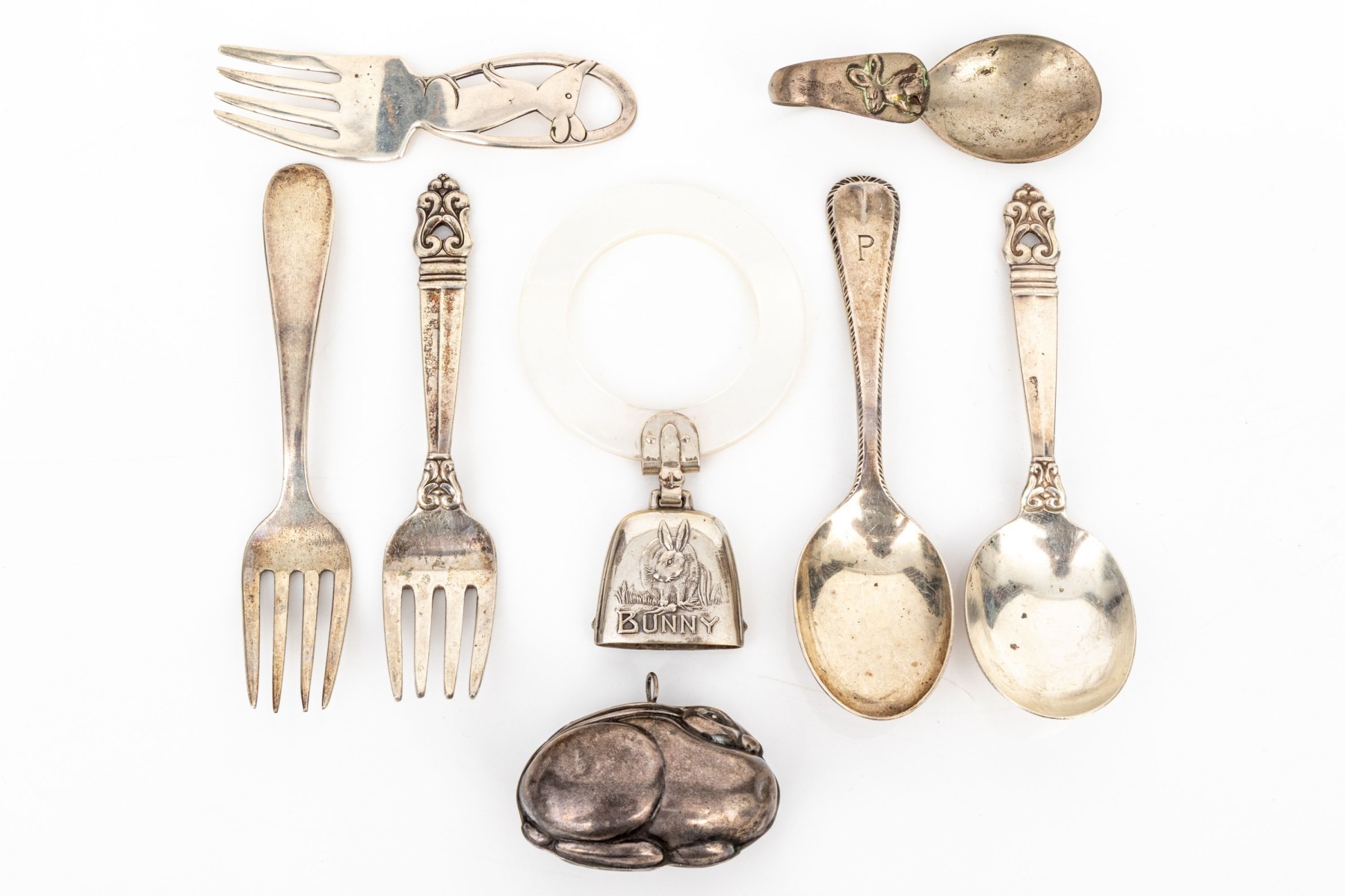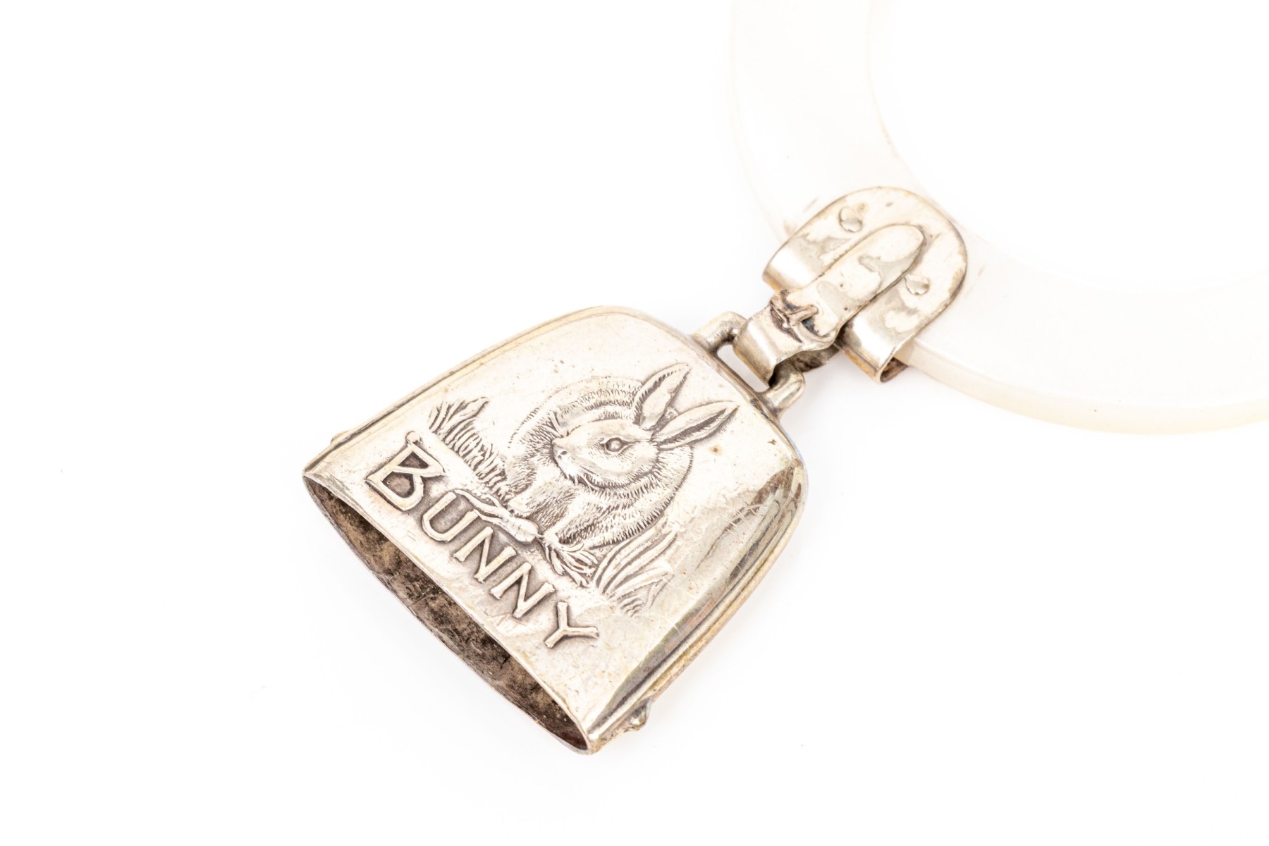 a plastic teething ring with sterling bell with Bunny motif, scratches