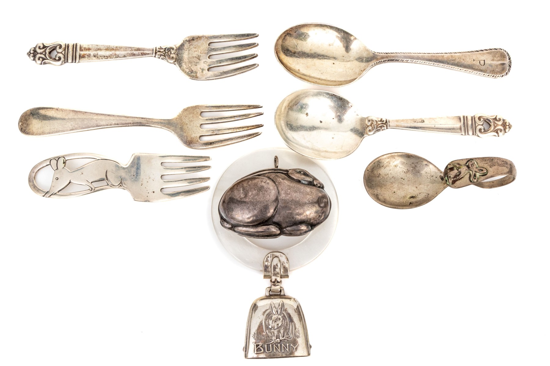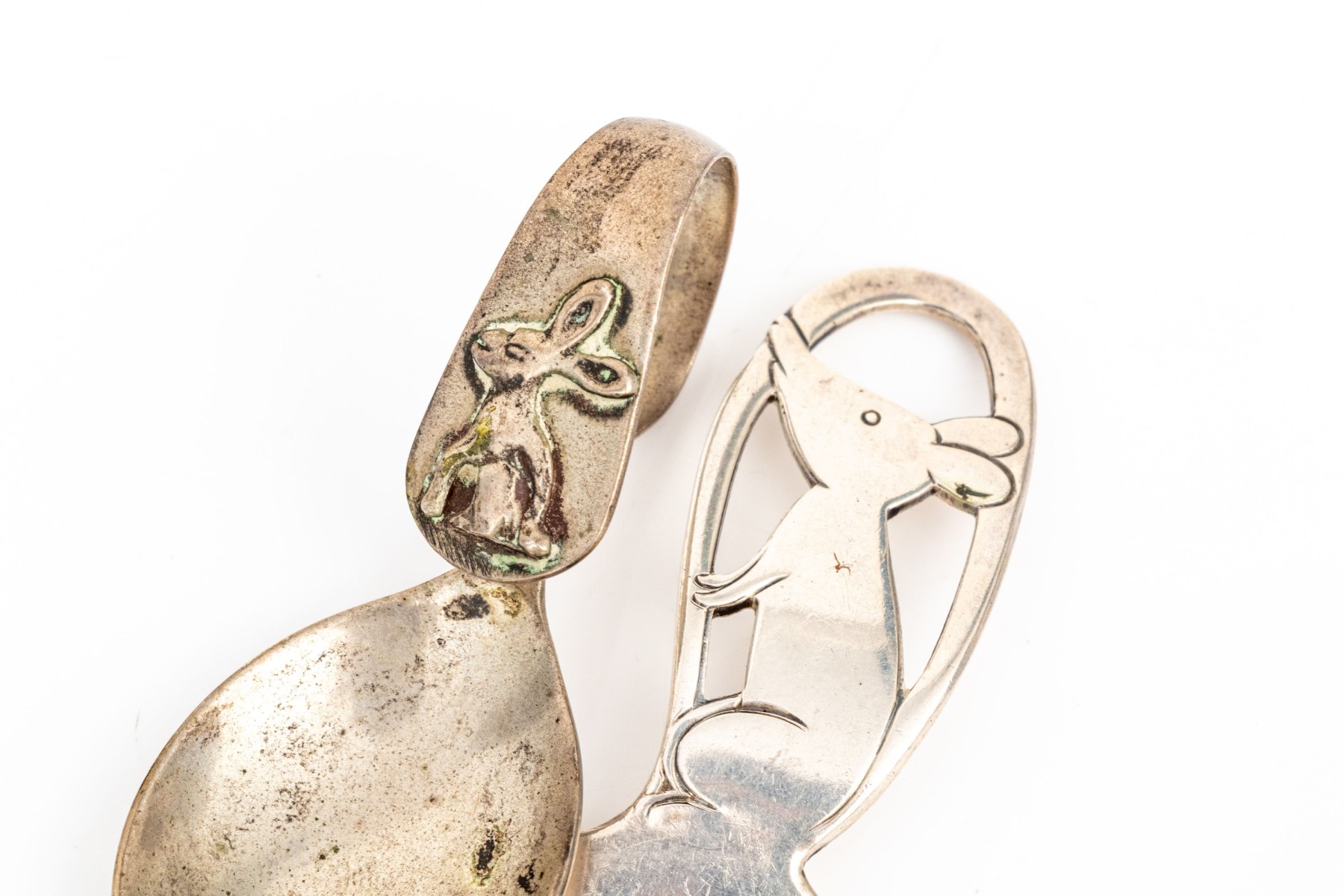 a sweet loop handled spoon with rabbit motif, tarnished