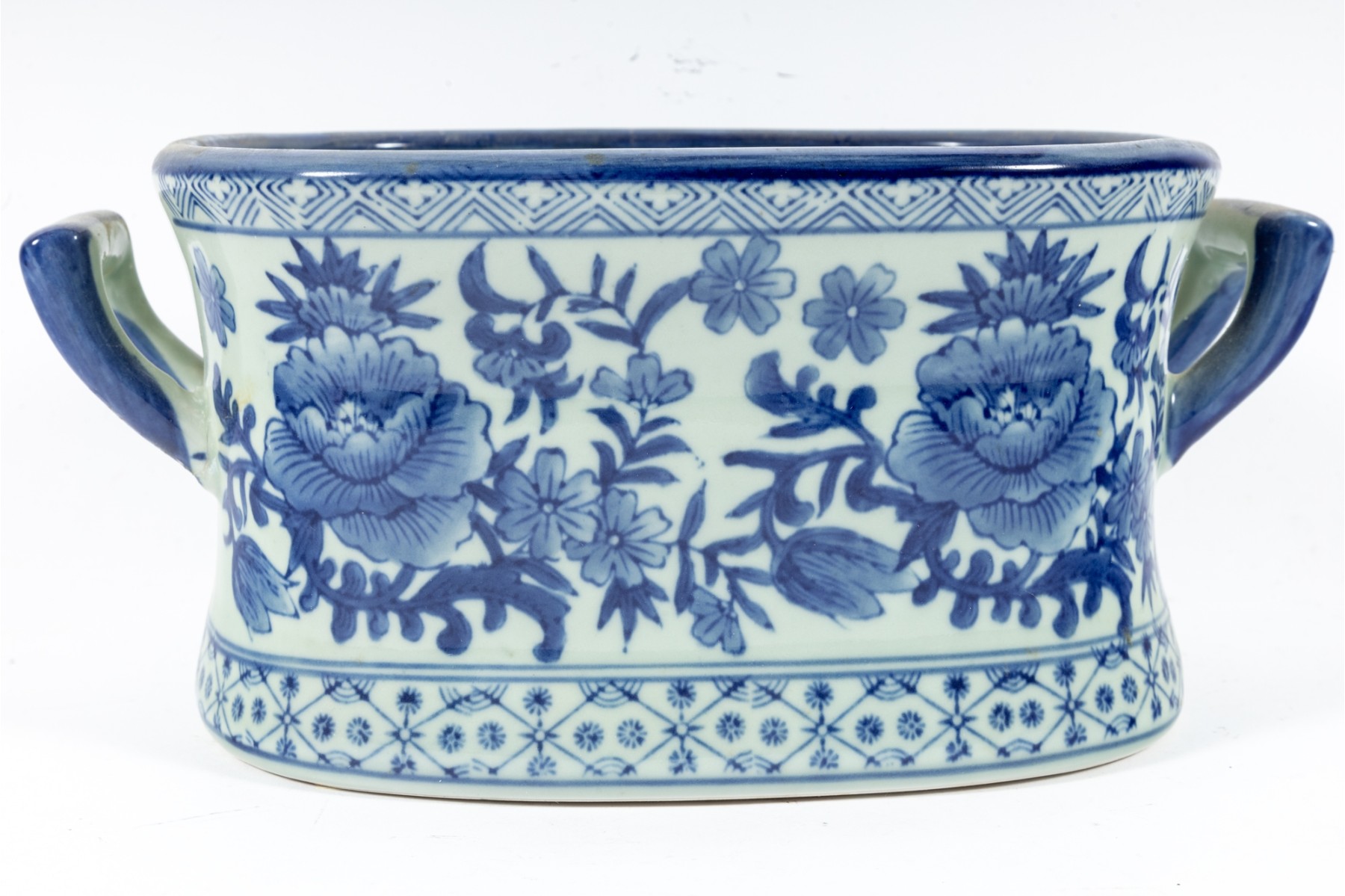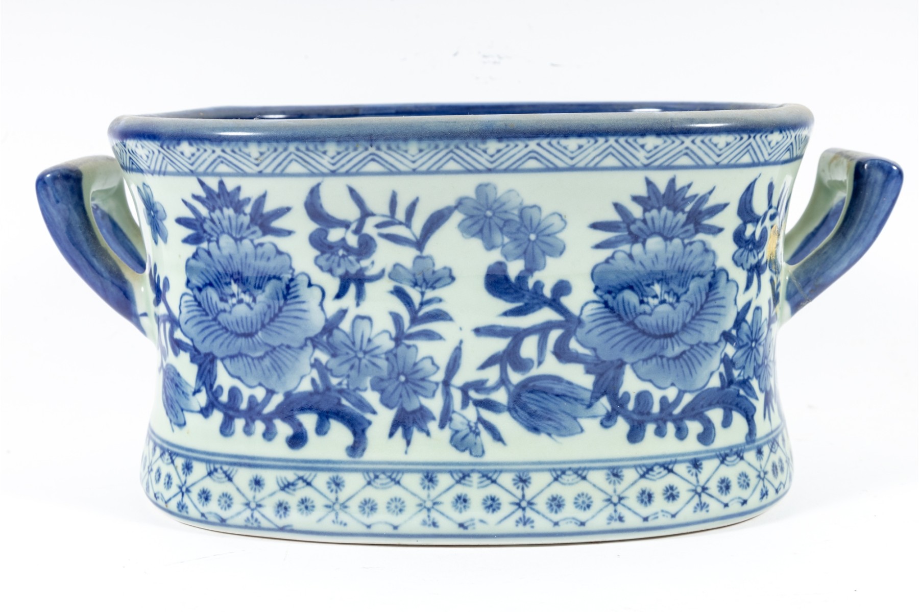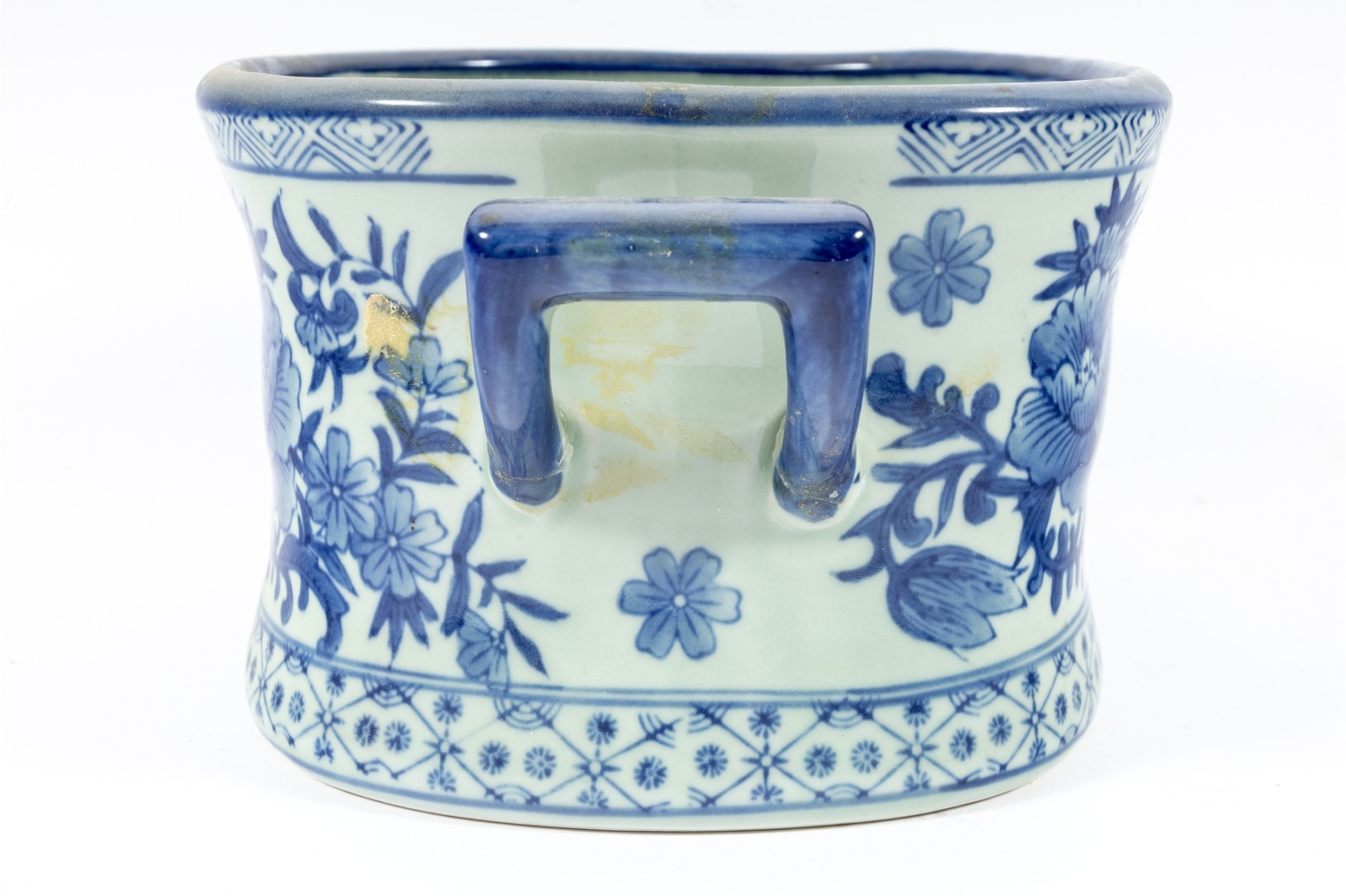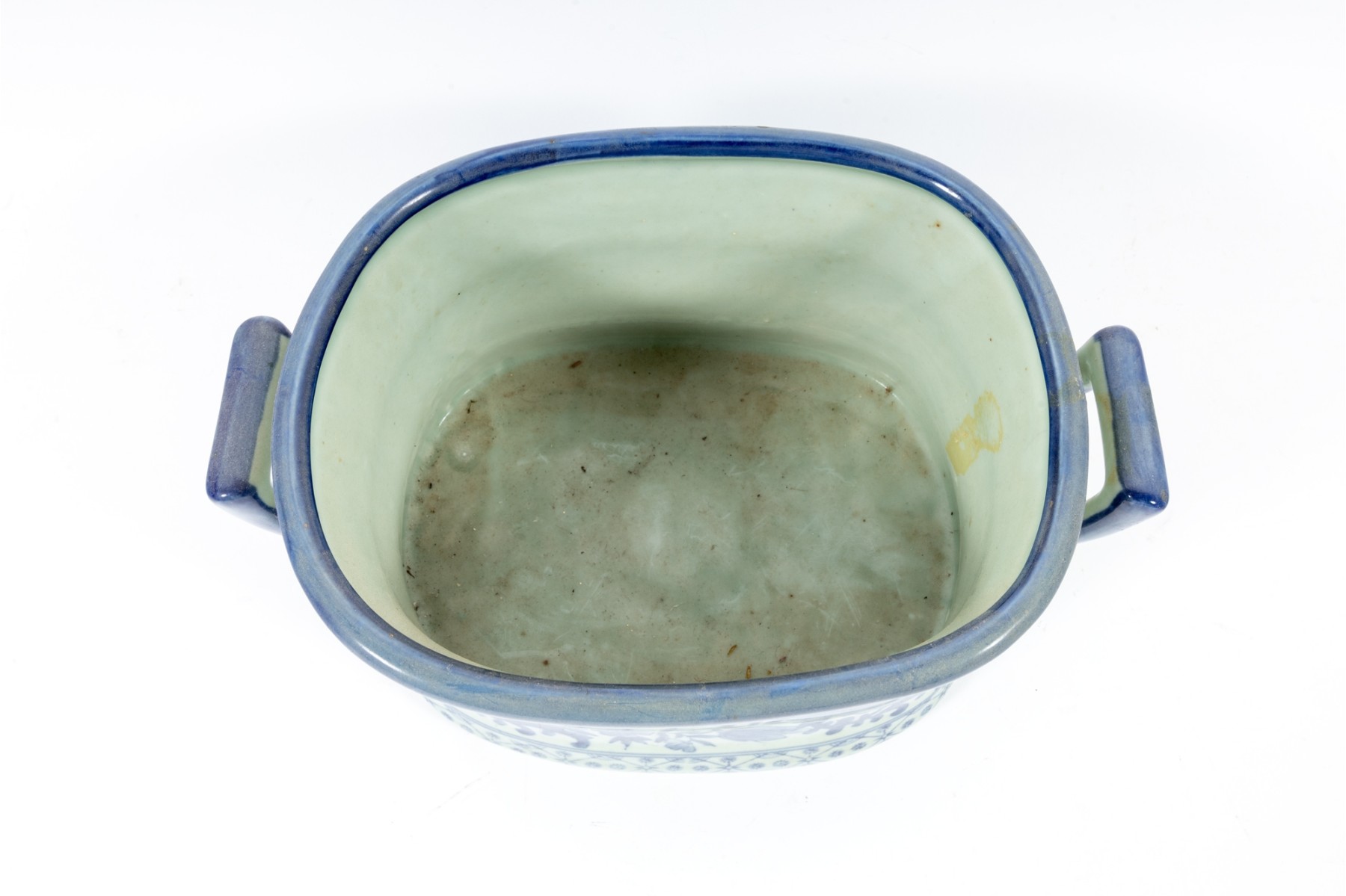 A 20th century Chinese foot bath style planter showcasing an aged mint-colored glaze with hand-painted blue designs enveloping the exterior in floral motifs and patterns that compose the outer trim.