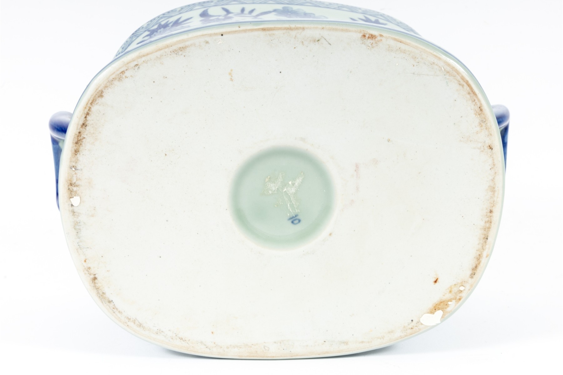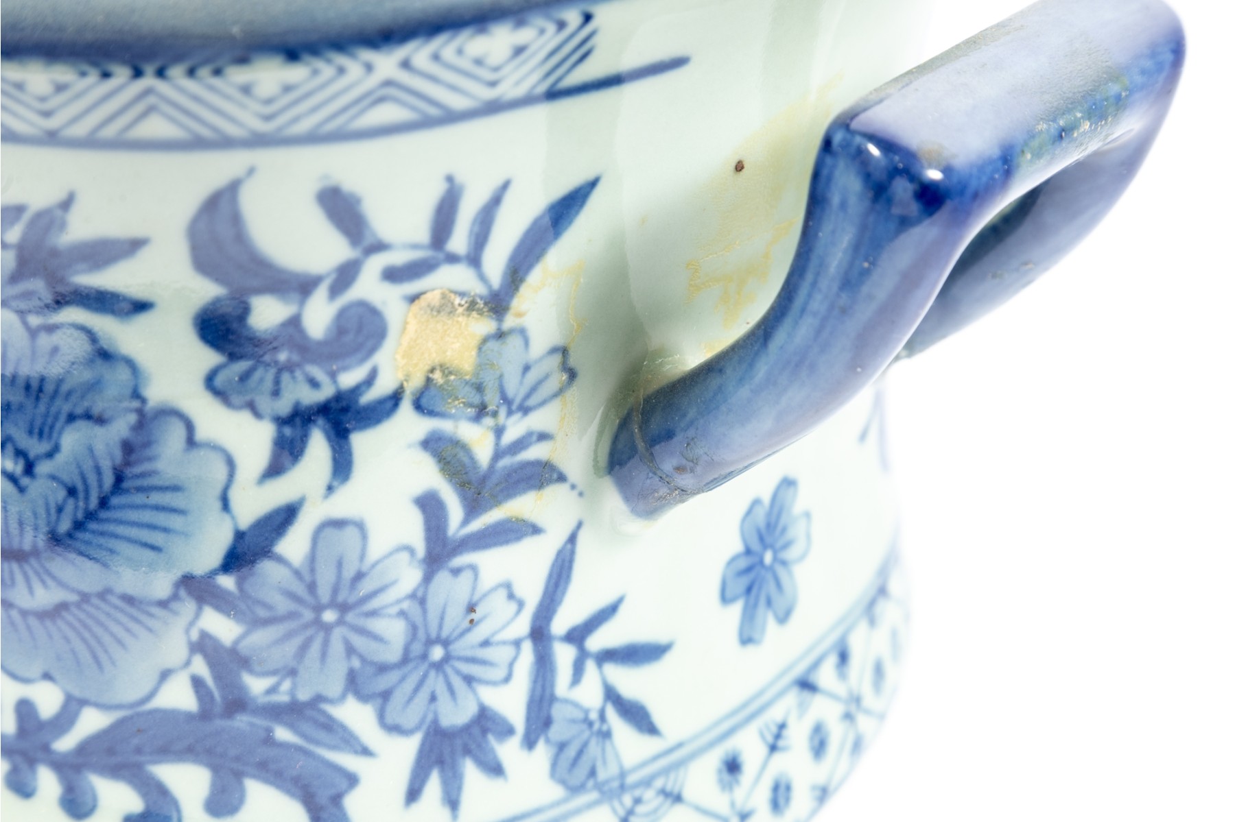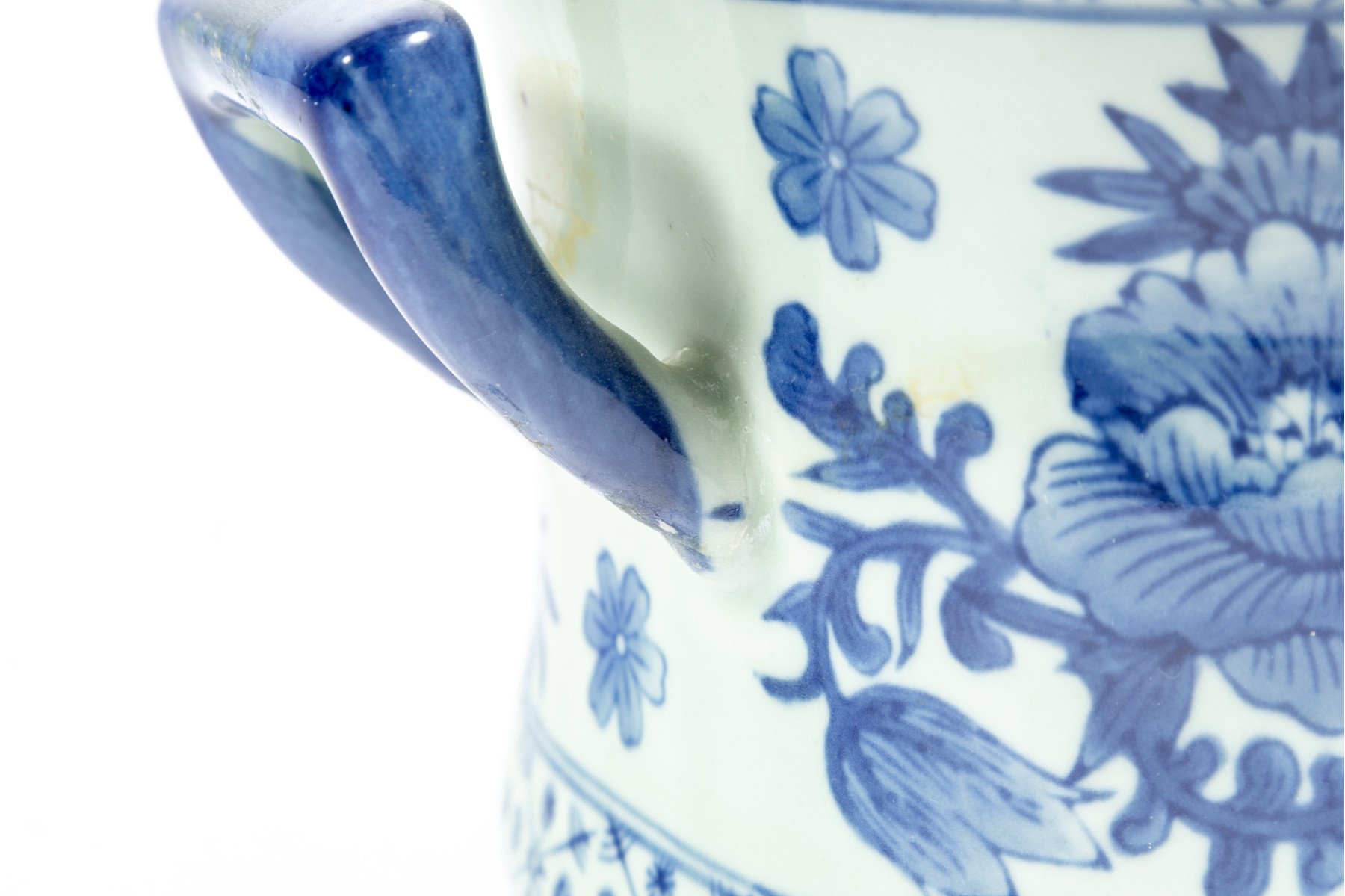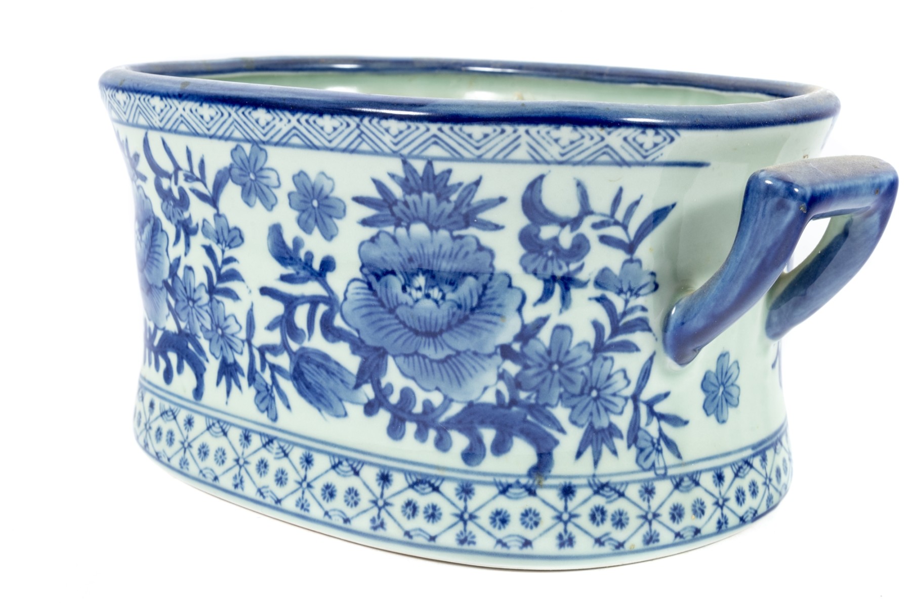 A 20th century Chinese foot bath style planter showcasing an aged mint-colored glaze with hand-painted blue designs enveloping the exterior in floral motifs and patterns that compose the outer trim.