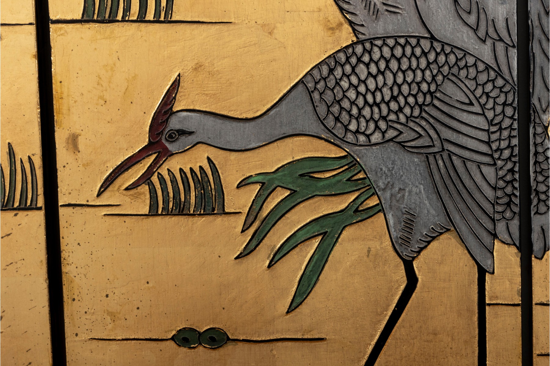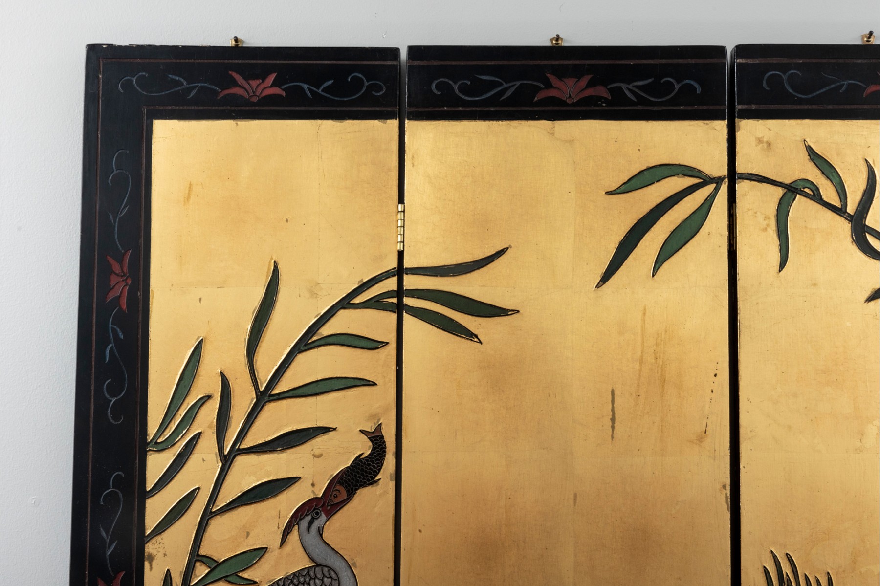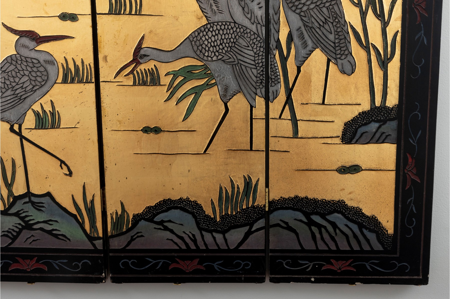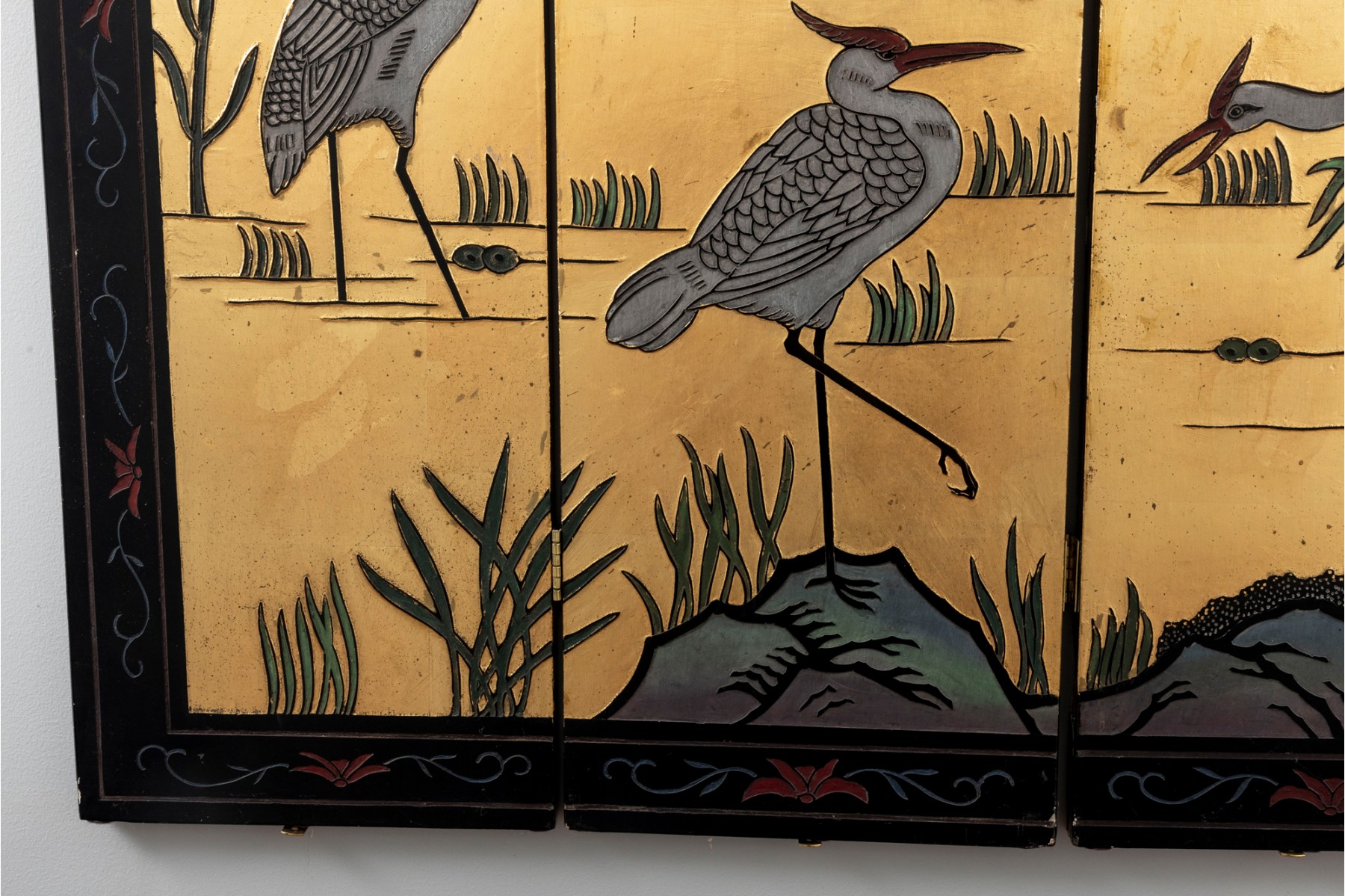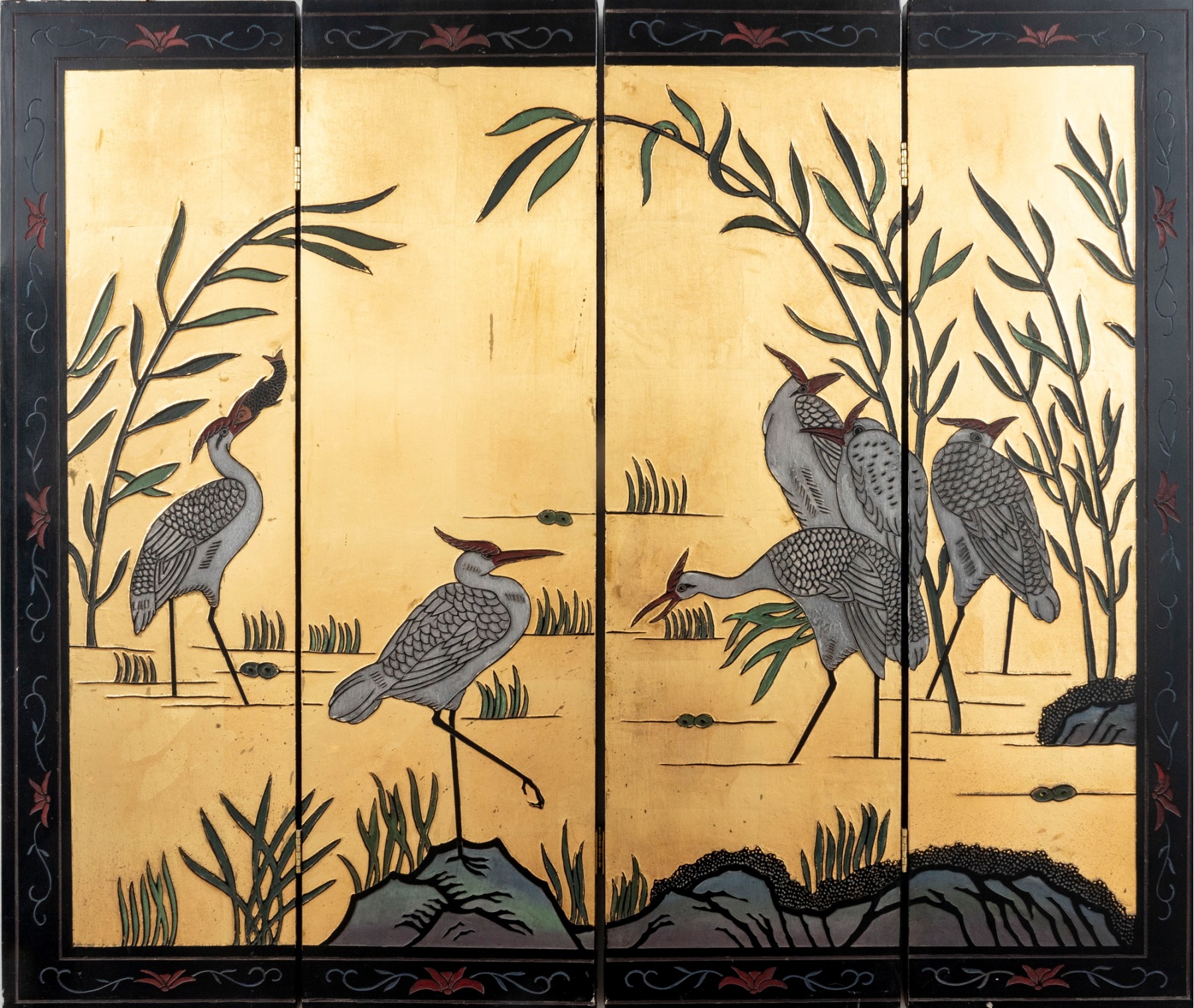 A lovely Chinese export lacquered four-panel coromandel wood screen featuring a serene flora and fauna waterscape with stylized sandhill cranes.