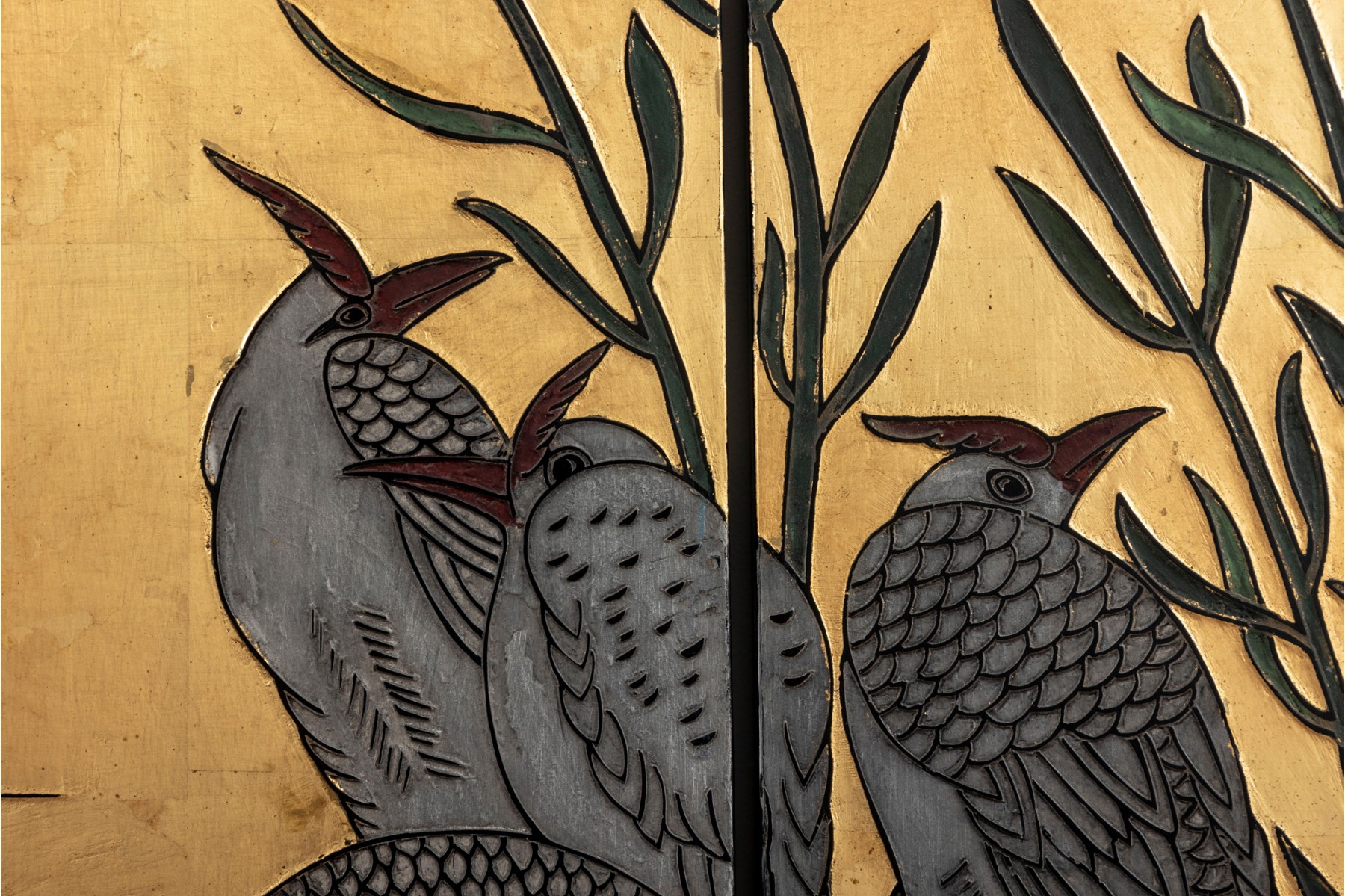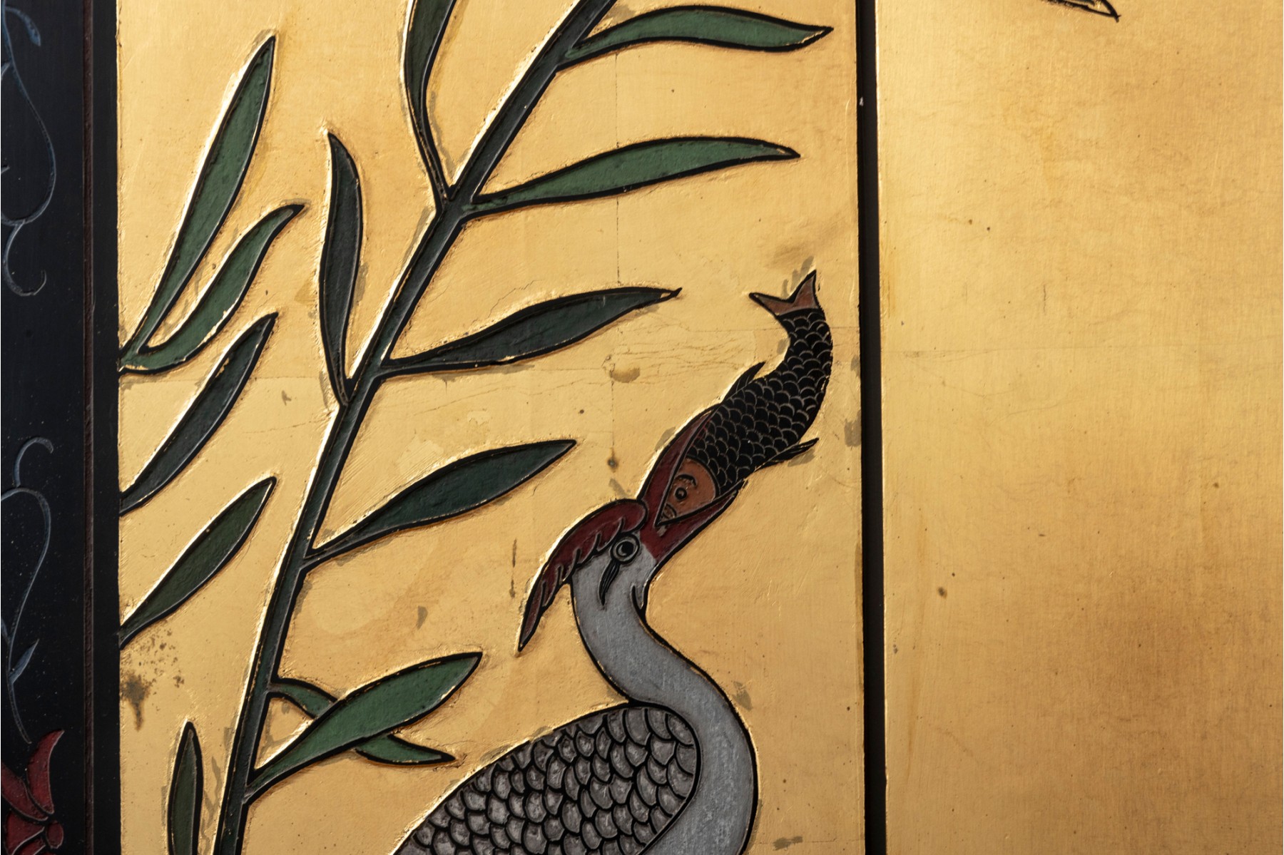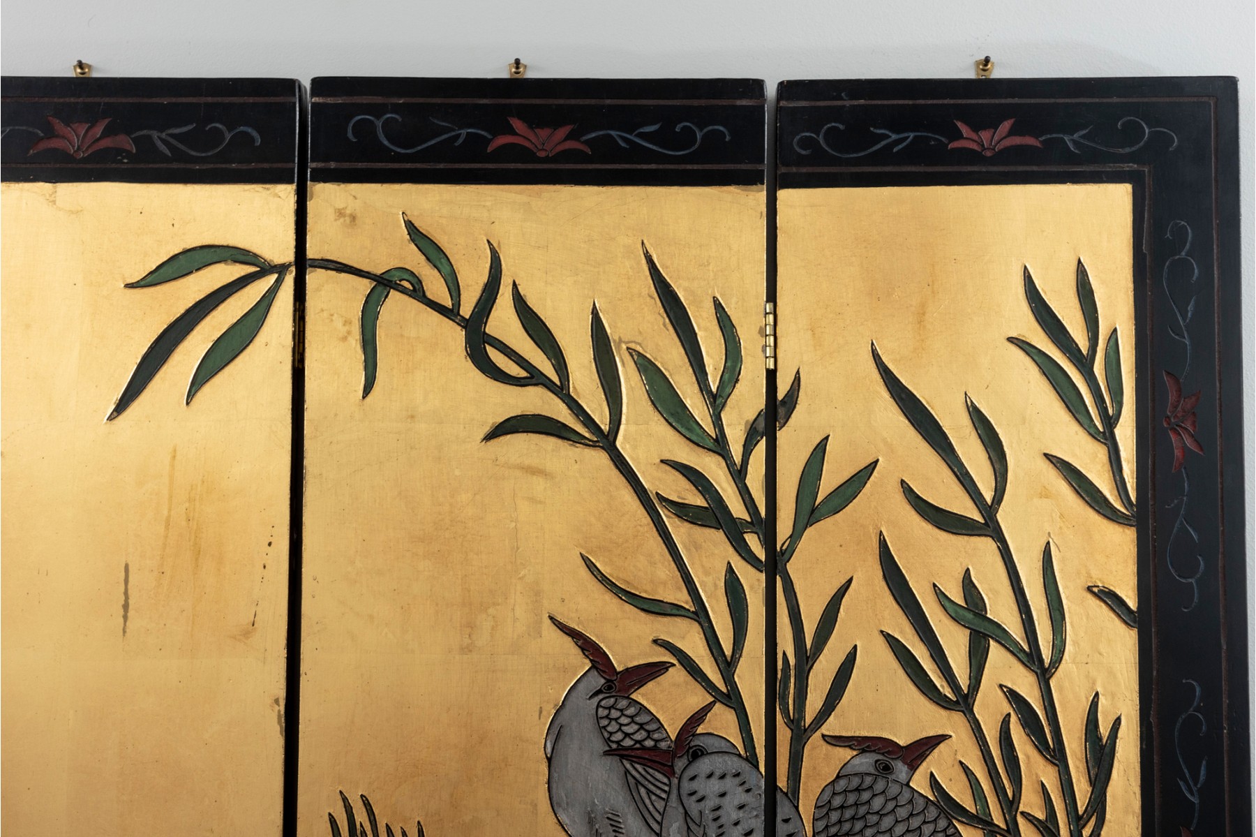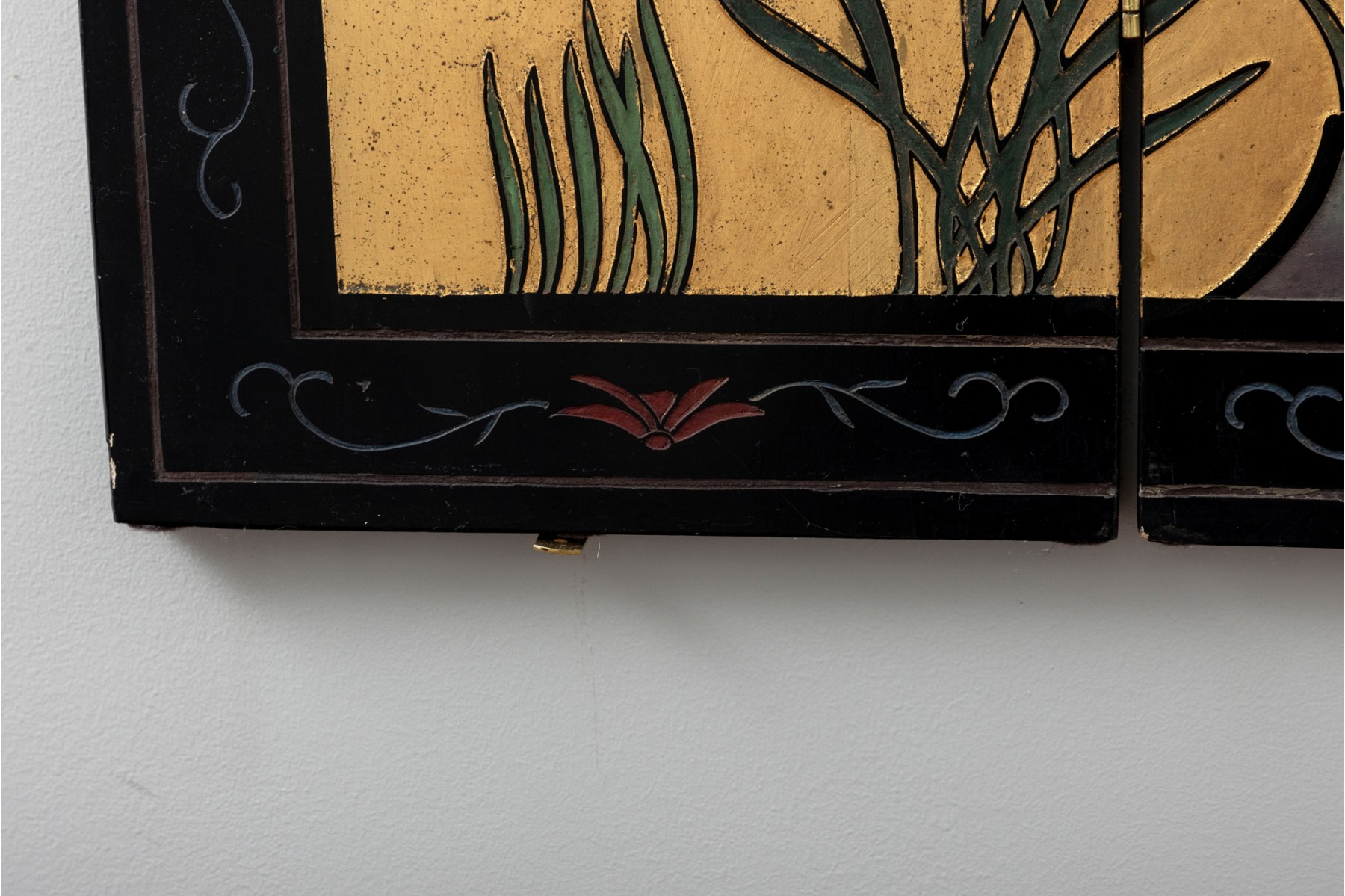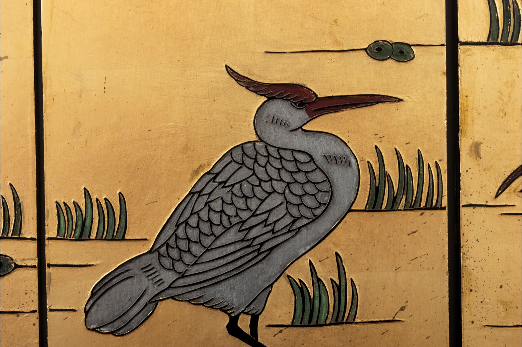 A lovely Chinese export lacquered four-panel coromandel wood screen featuring a serene flora and fauna waterscape with stylized sandhill cranes.