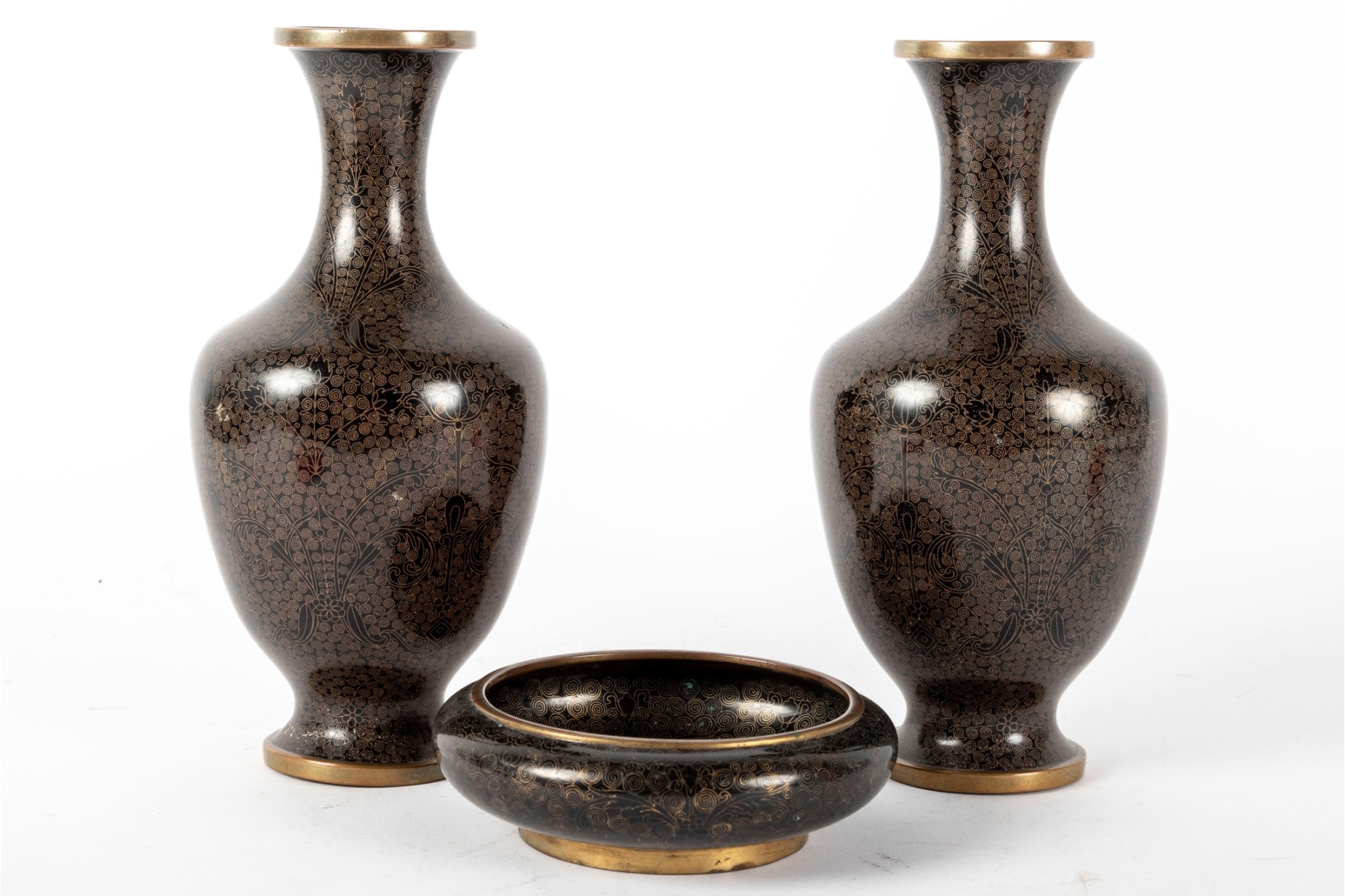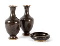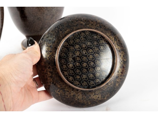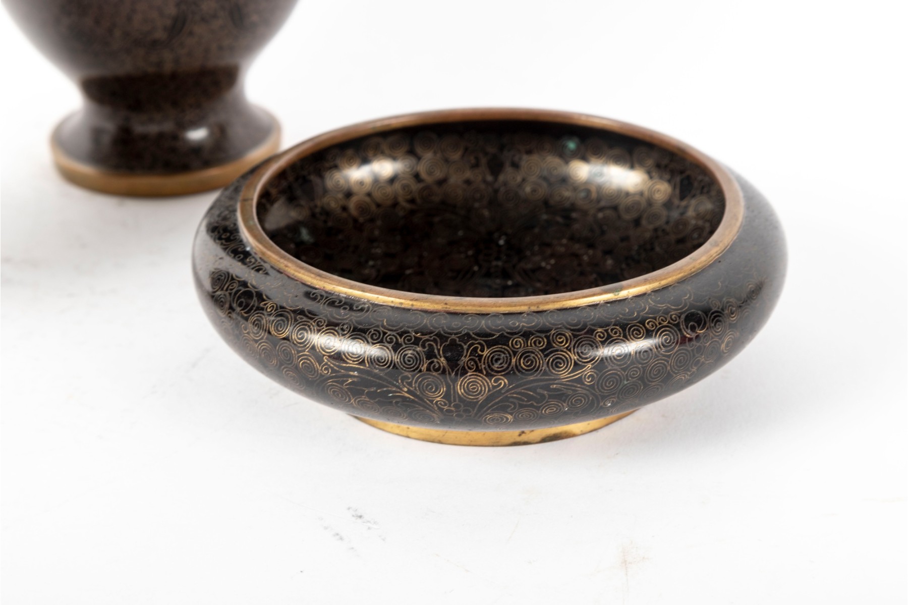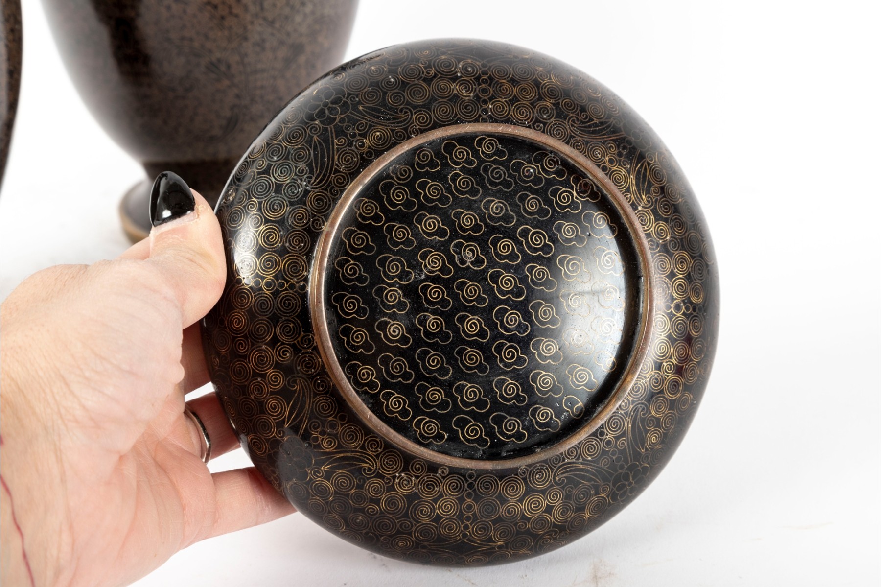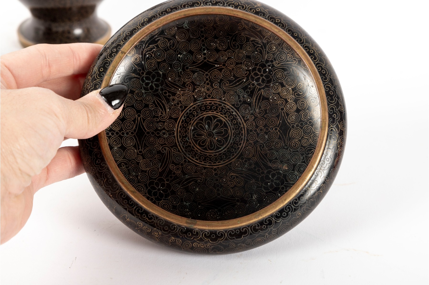 Decorated with copper wire reserves in scrolling and flowing lotus patterns, this set of Chinese cloisonne items showcase a reserve patio and an amazing attention to detail. Circa 1920's.
