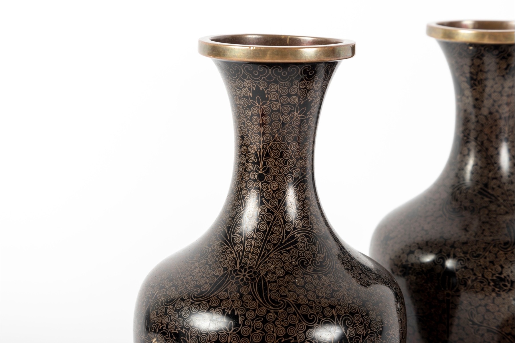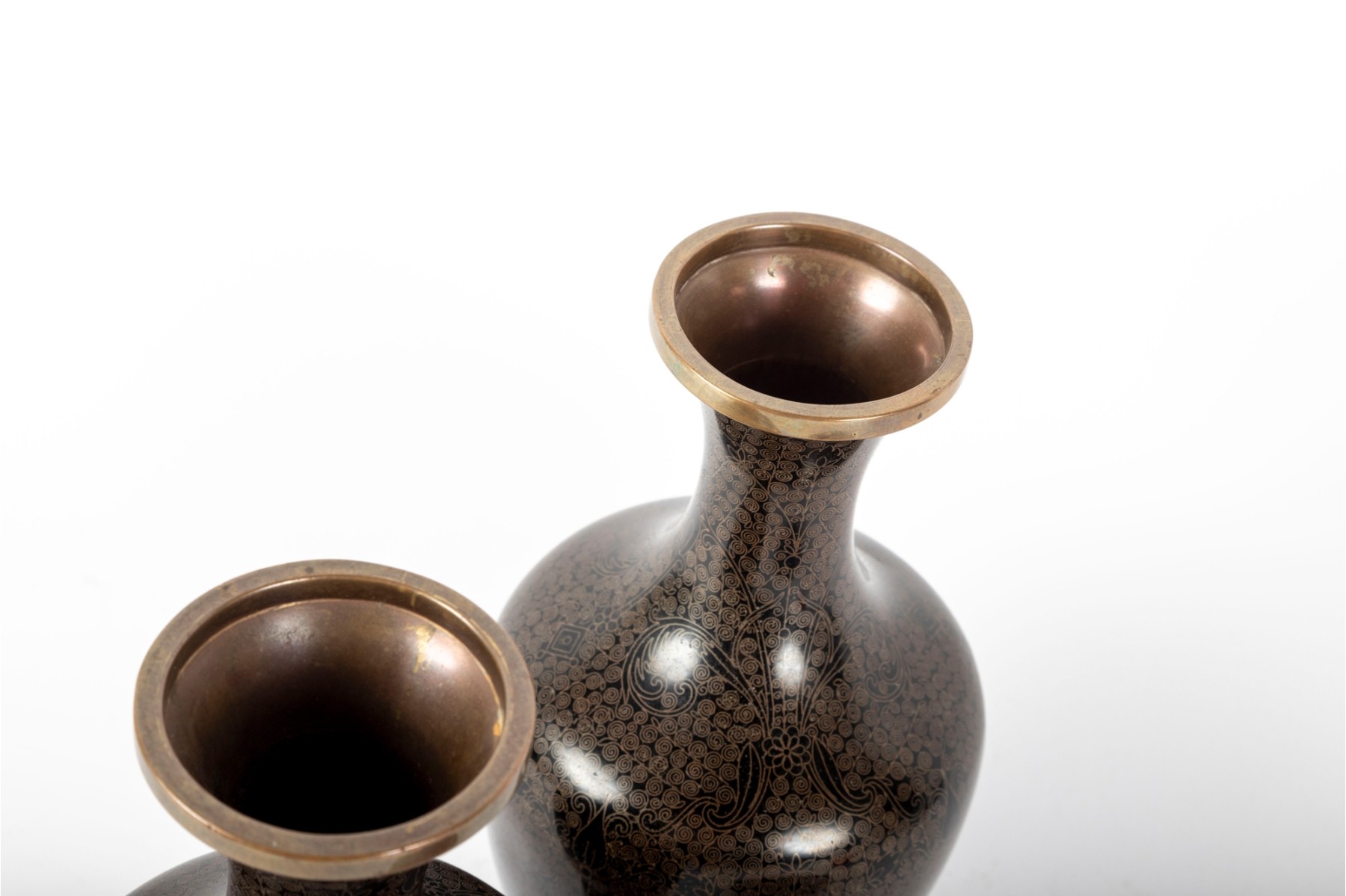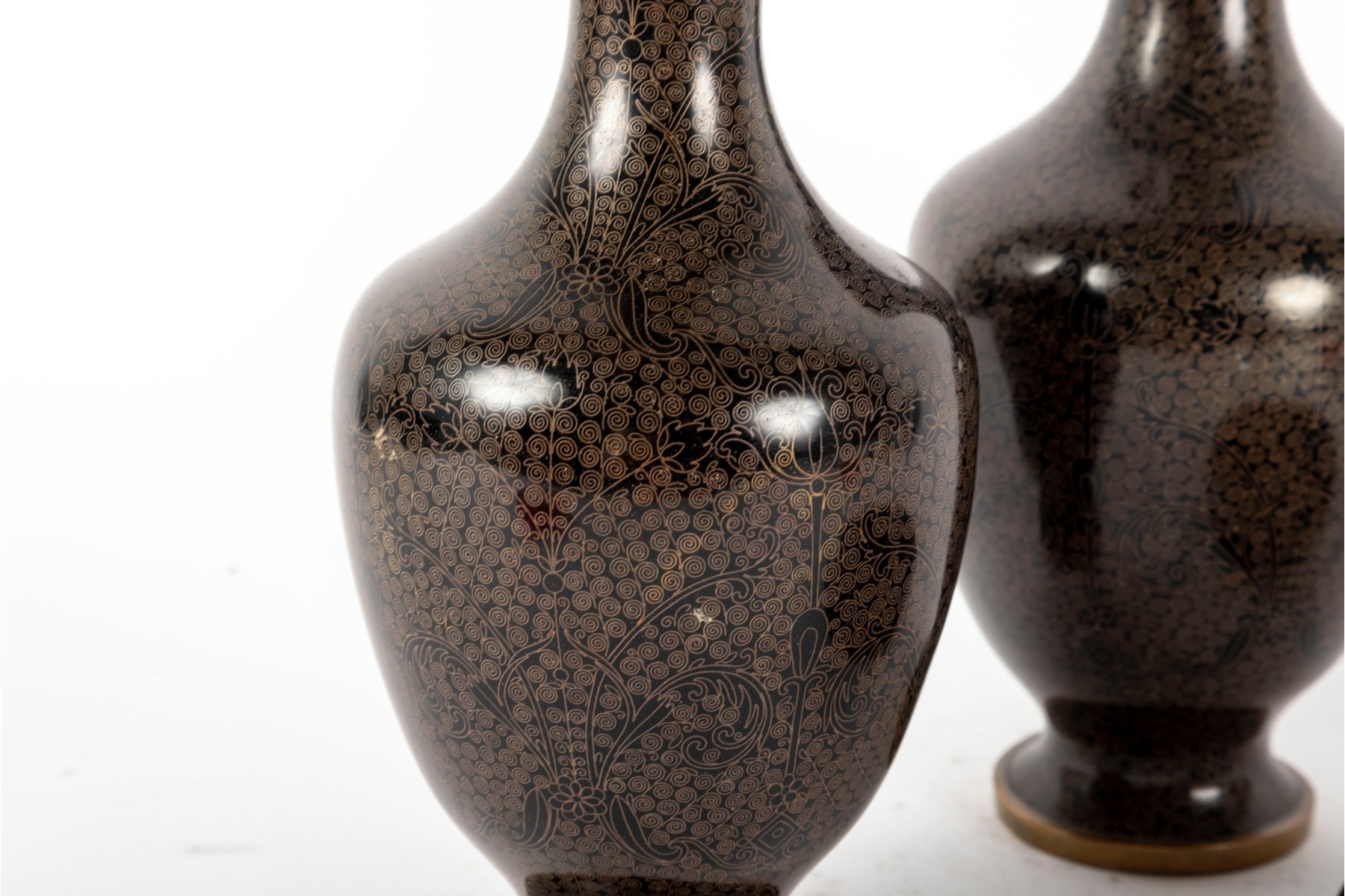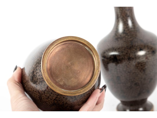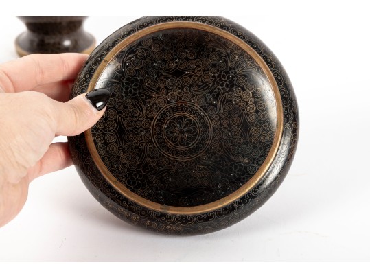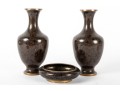 Decorated with copper wire reserves in scrolling and flowing lotus patterns, this set of Chinese cloisonne items showcase a reserve patio and an amazing attention to detail. Circa 1920's.