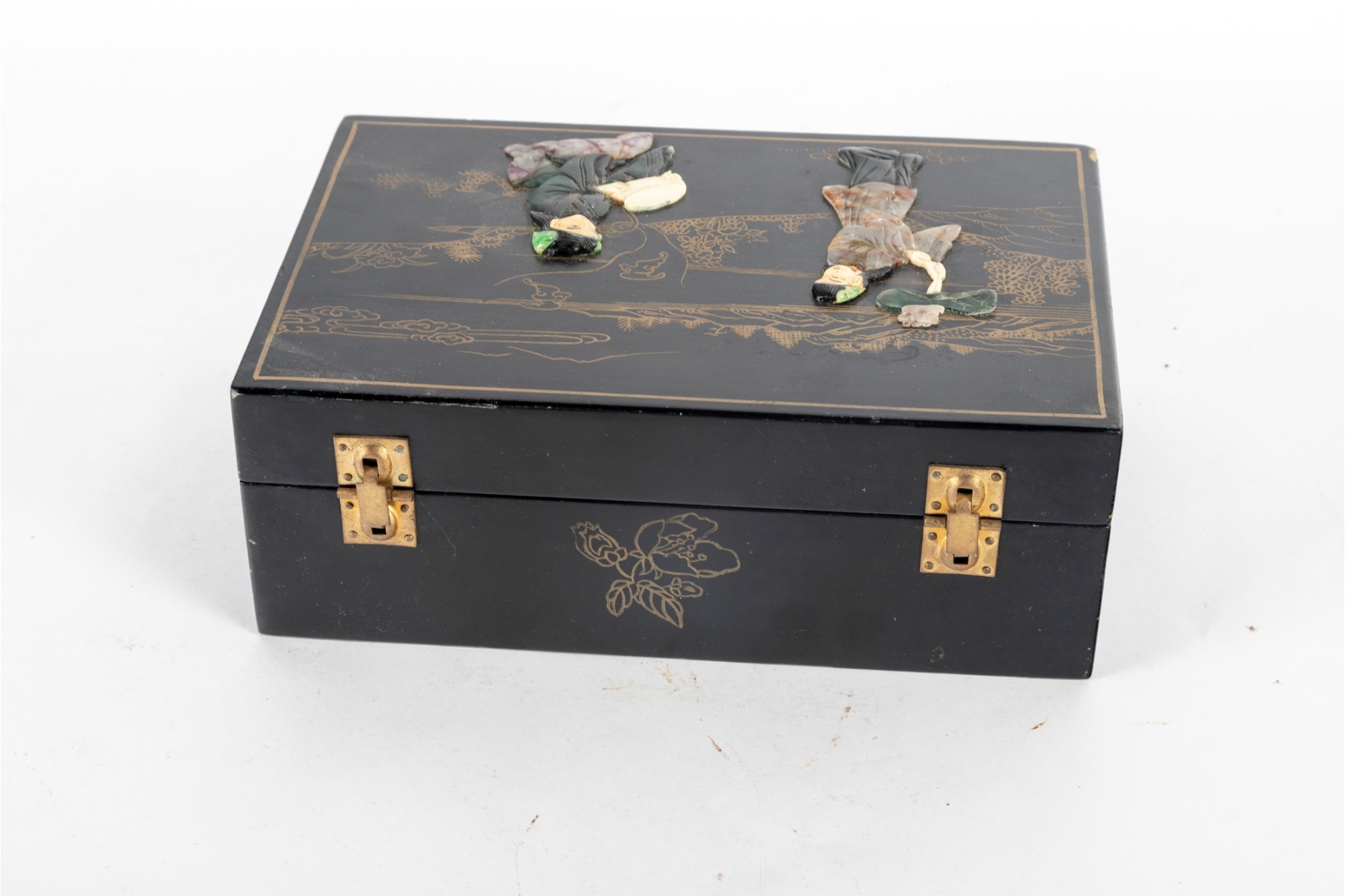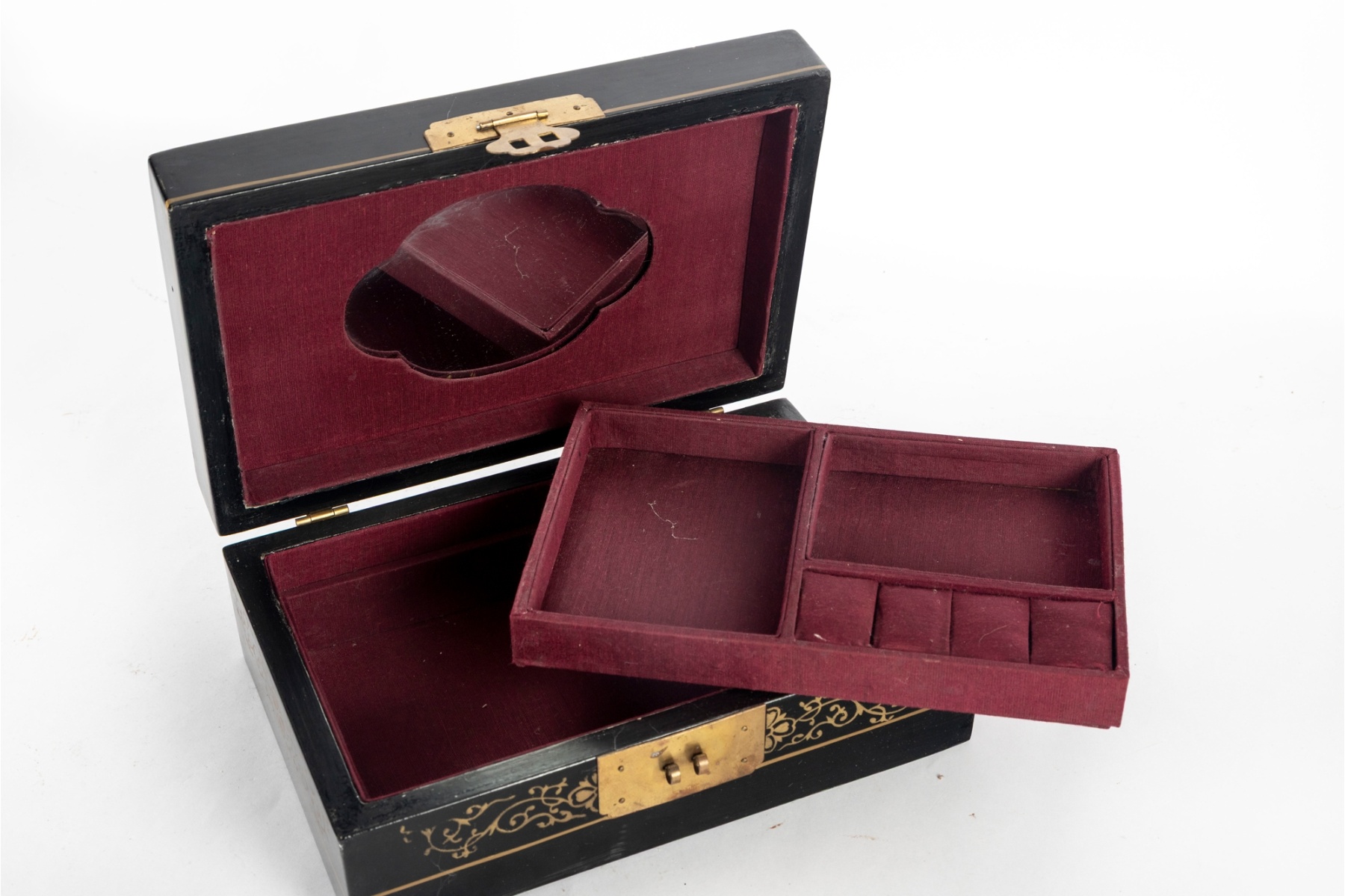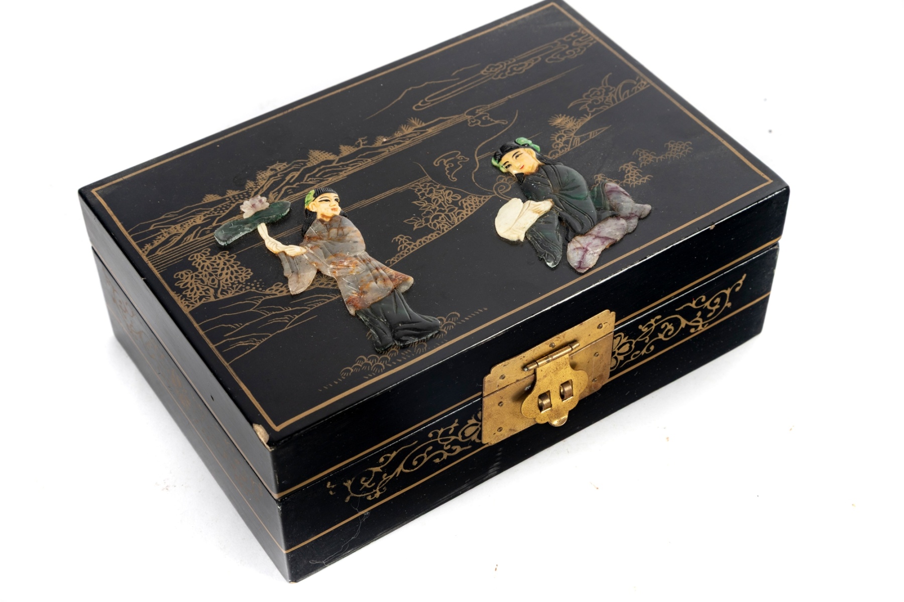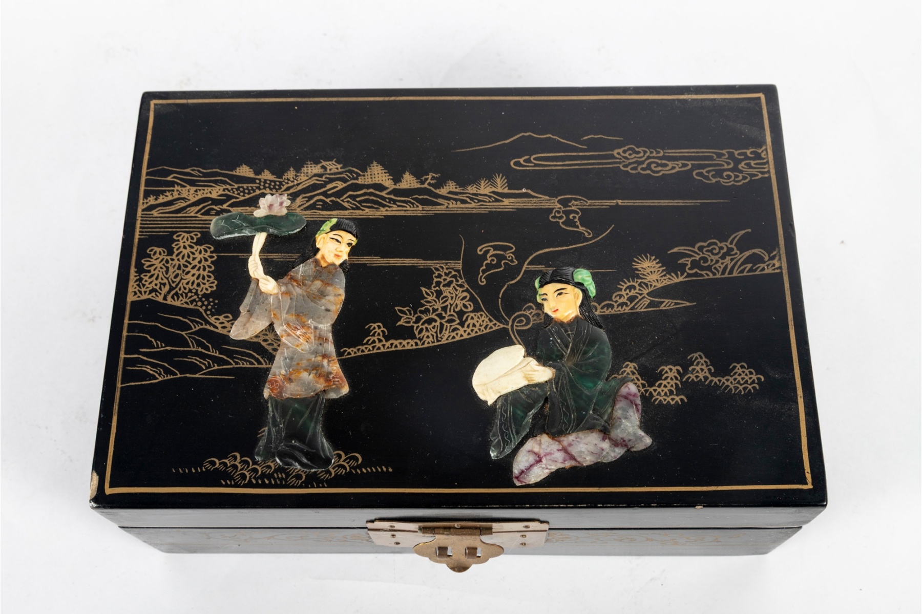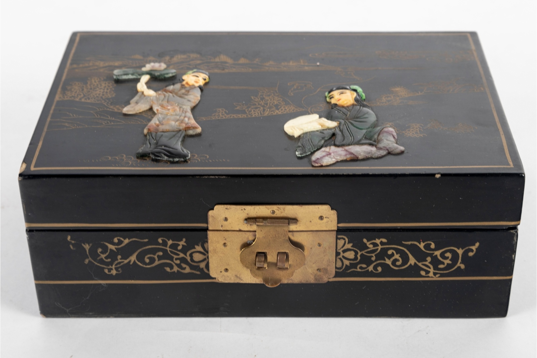 Elegant black lacquer jewelry box featuring applied hardstone figures on the lid, depicting two traditional Chinese figures in scenic surroundings with hand-painted gilt landscape detailing. The box is accented with brass hardware and decorative gilt scrollwork along the edges. The interior is lined in deep burgundy velvet with a removable tray for additional storage and an inset mirror inside the lid.