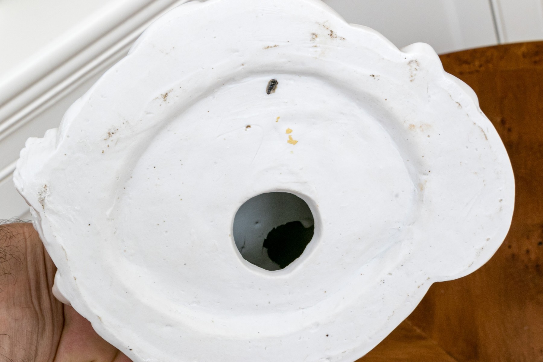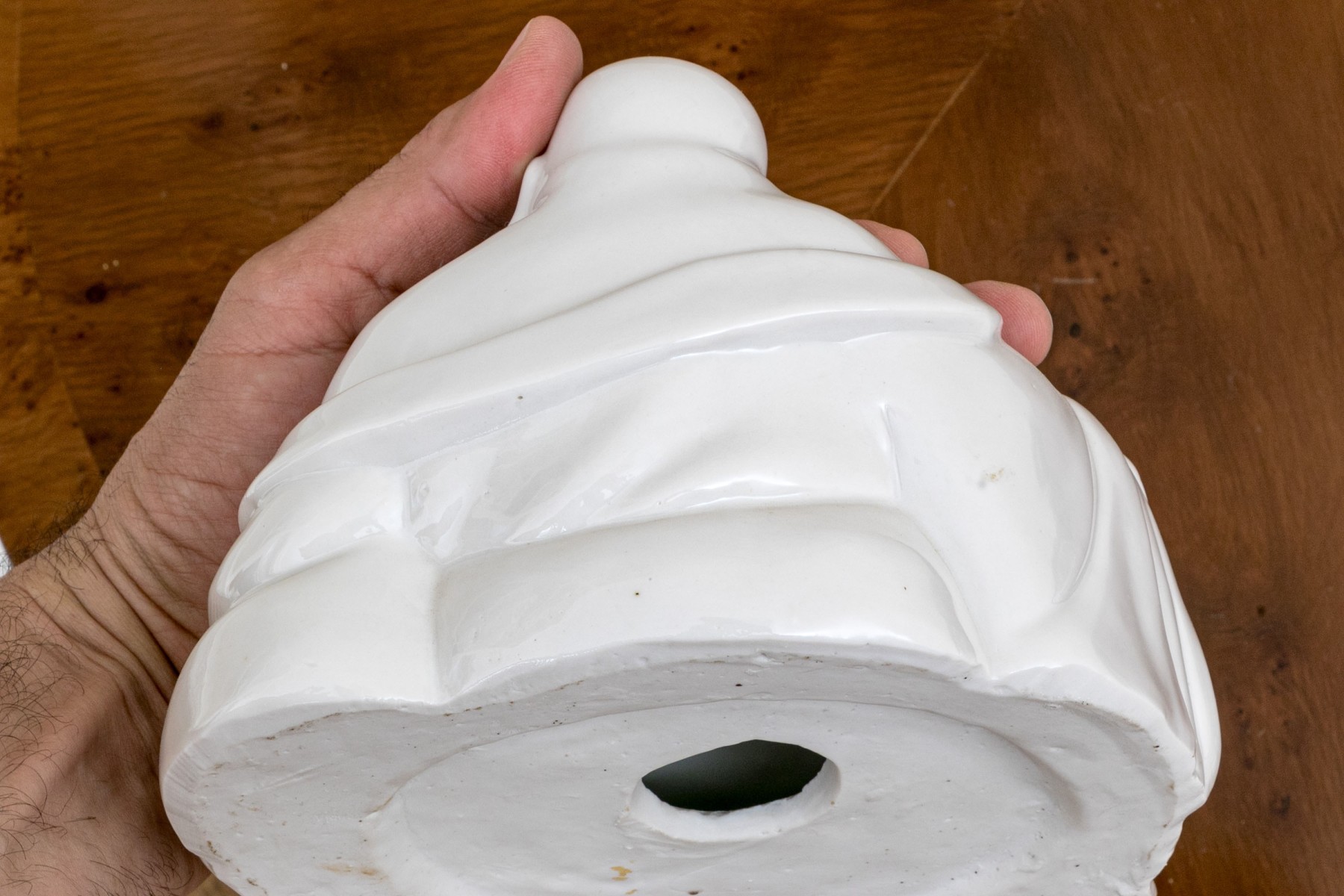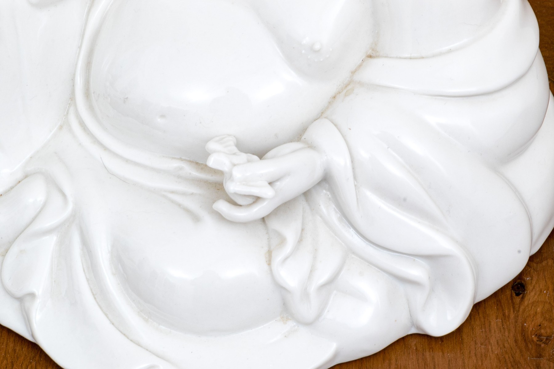 Tiny chip to the object in his left hand with slight roughage to the fingers. Please review the photos as they are part of the condition report.