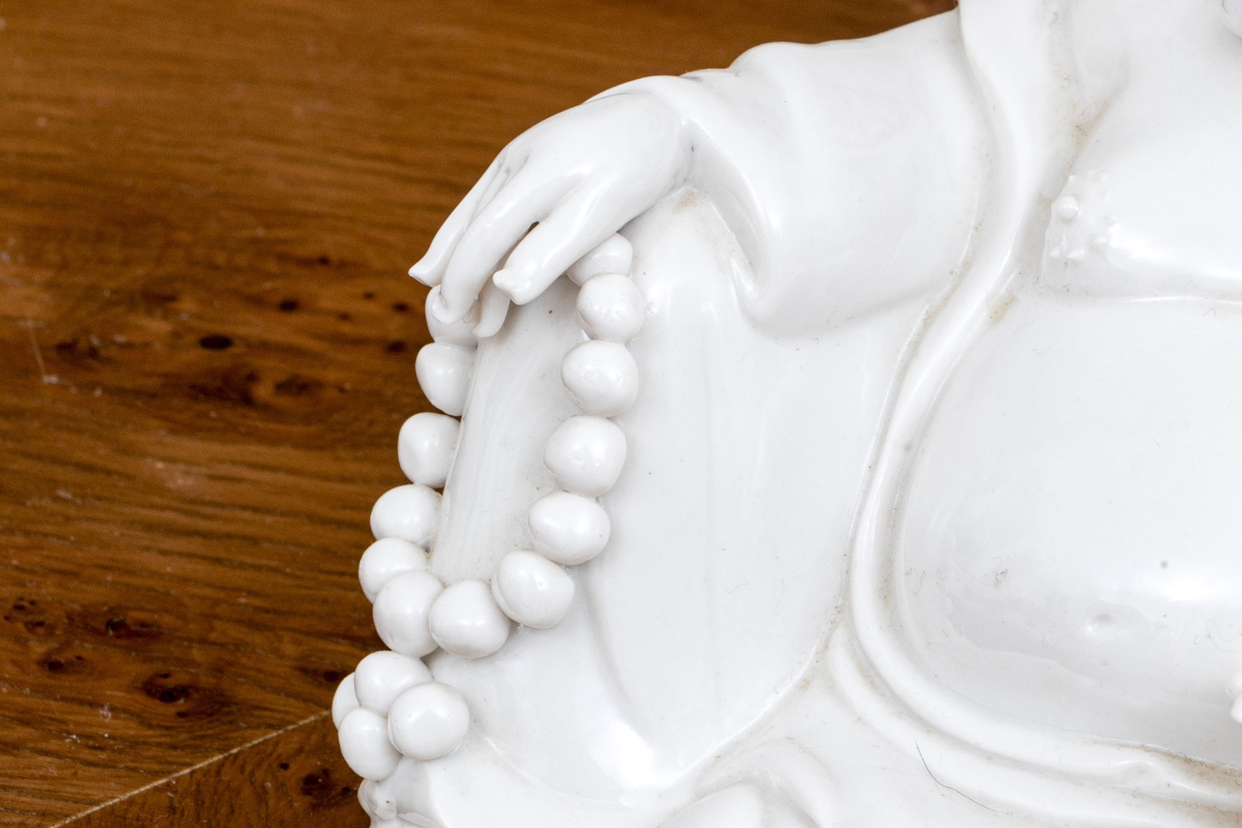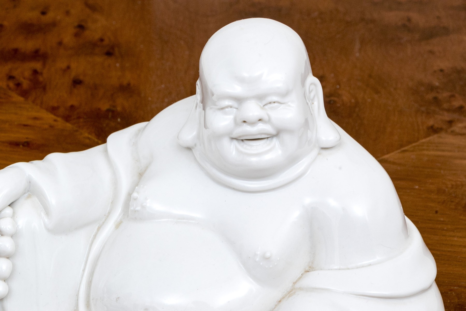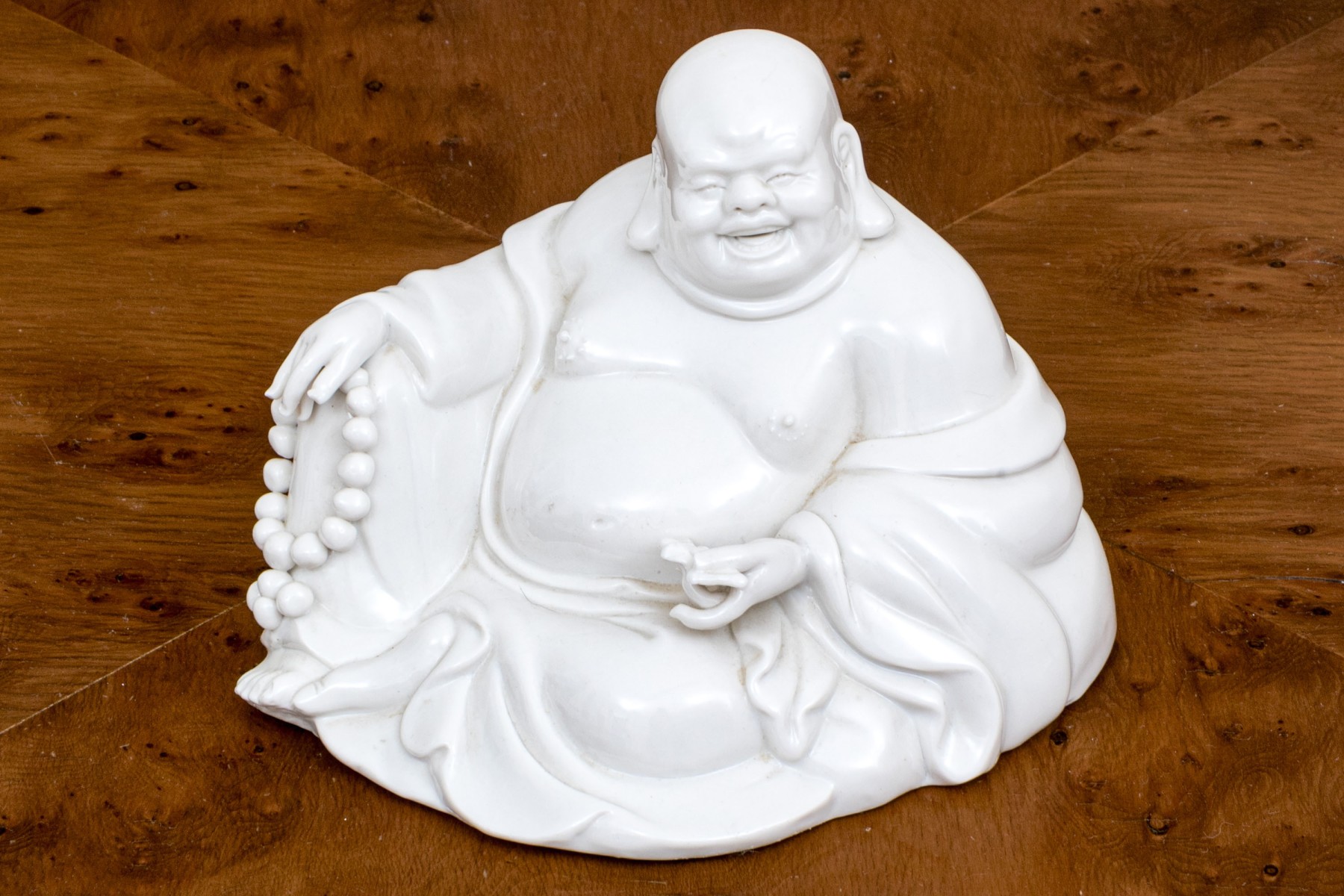 A handsomely formed and white glazed, blanc de chine porcelain figure of Hotei, known as the fat, happy, laughing Buddha.