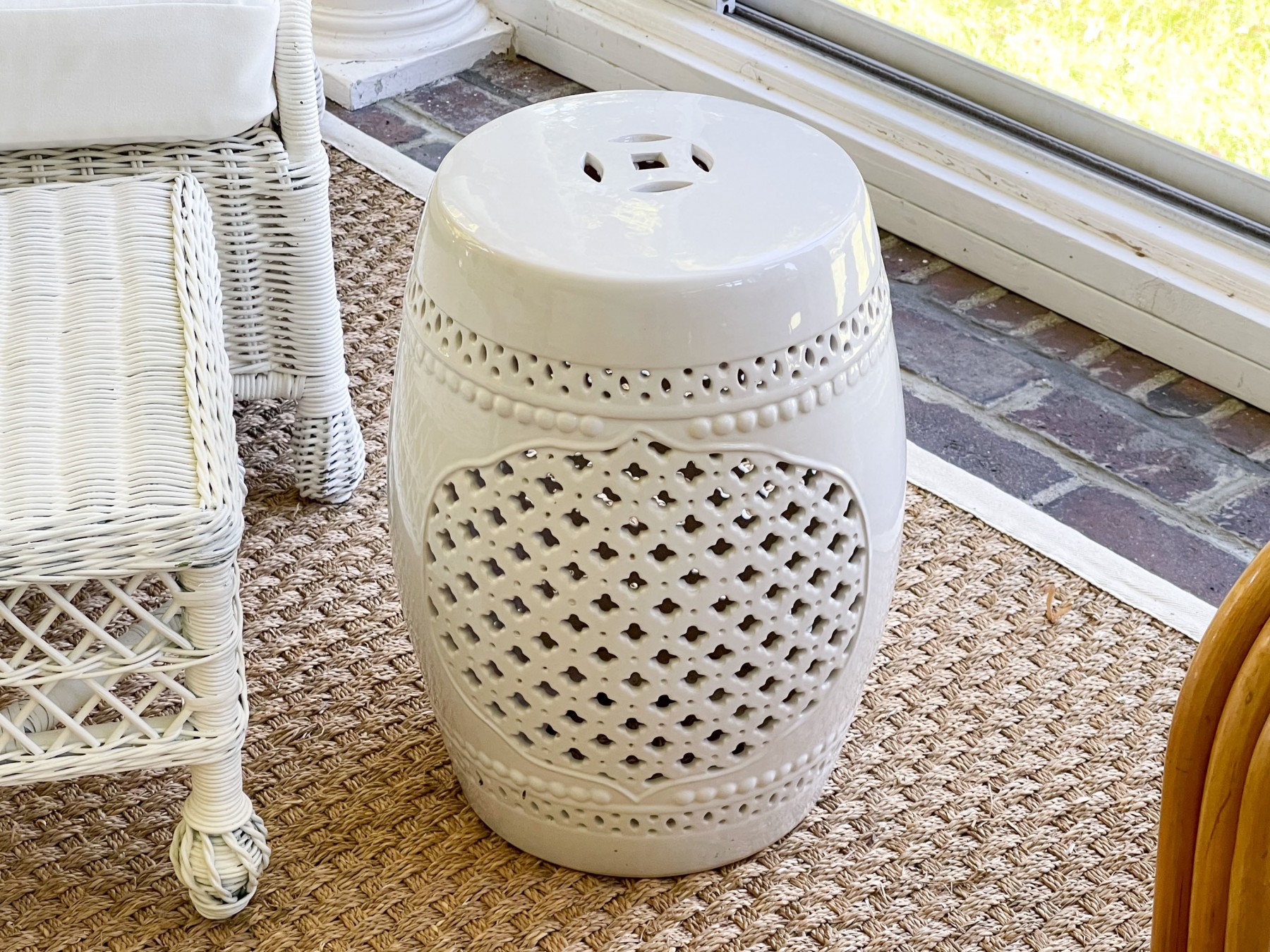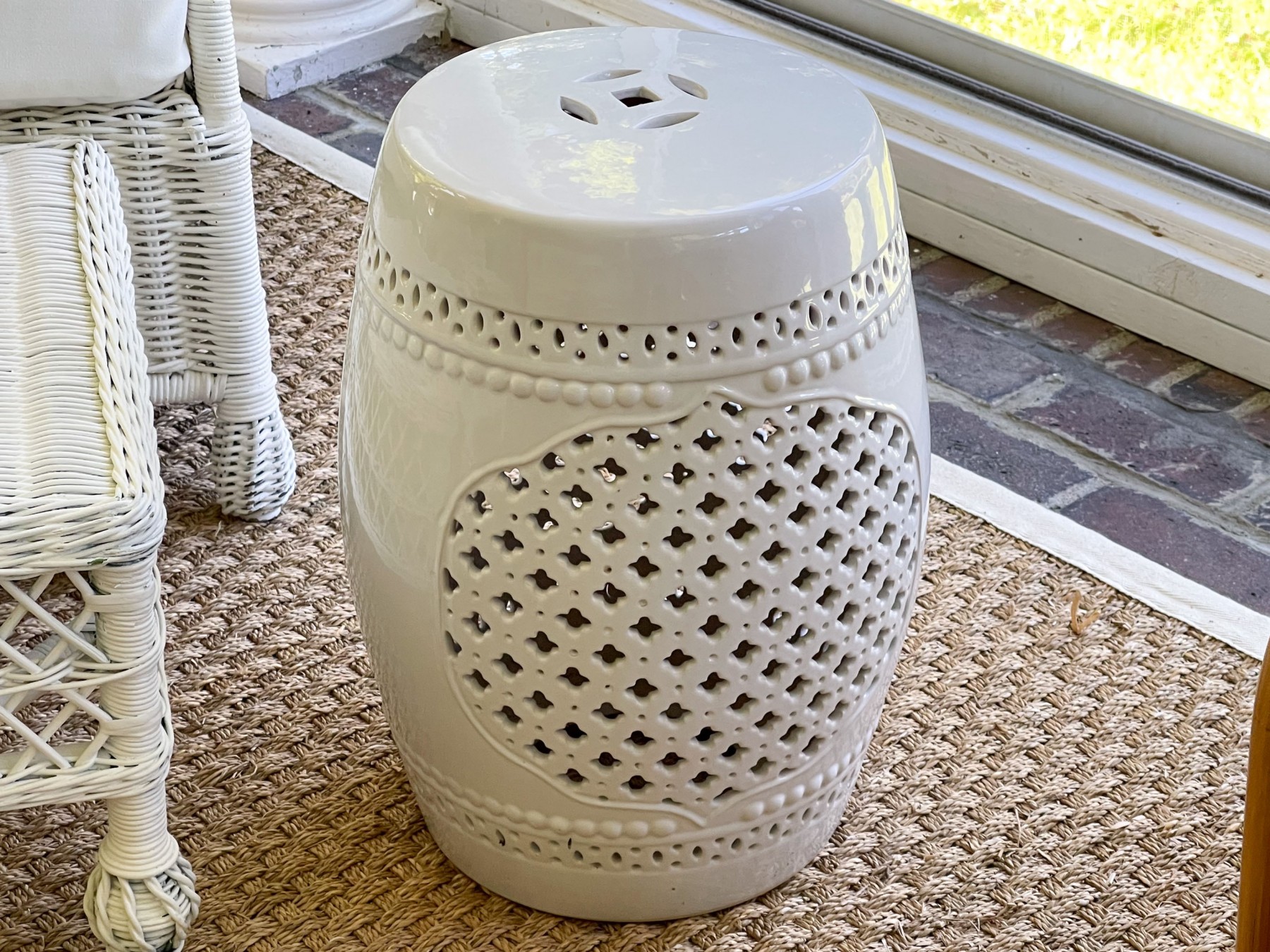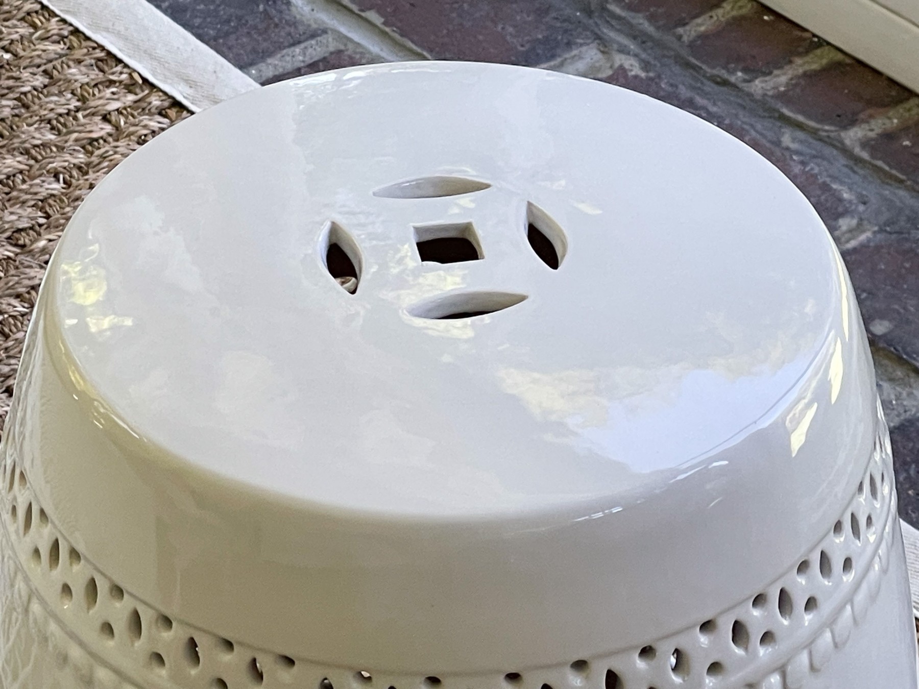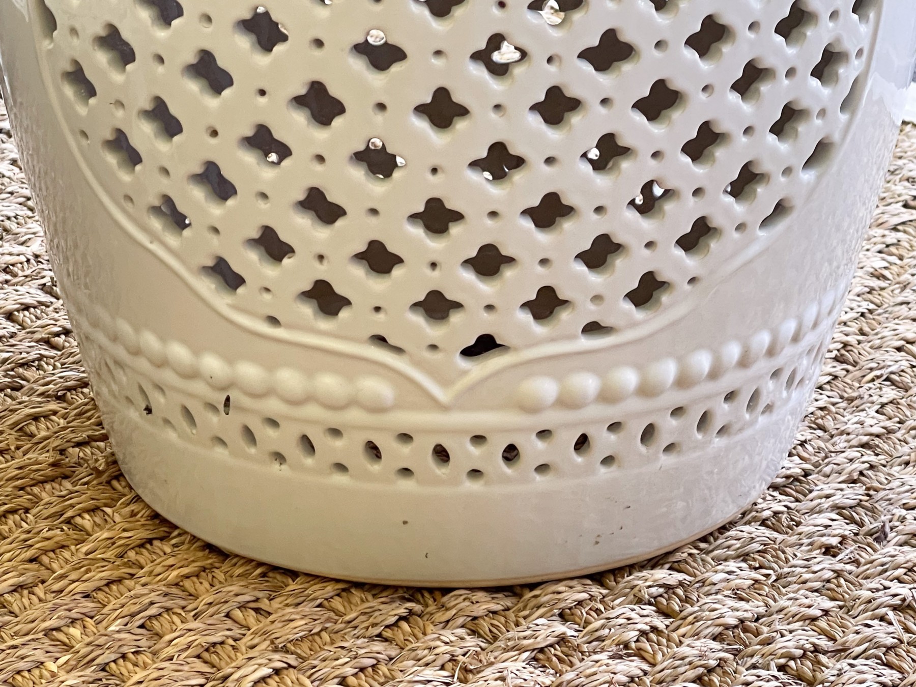 Chinese blanc de chine porcelain garden seat with fabulous pierced openwork decorative motif.