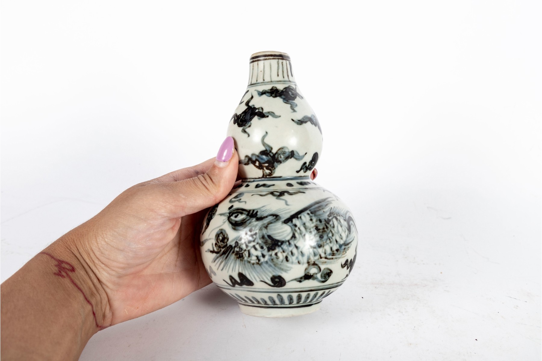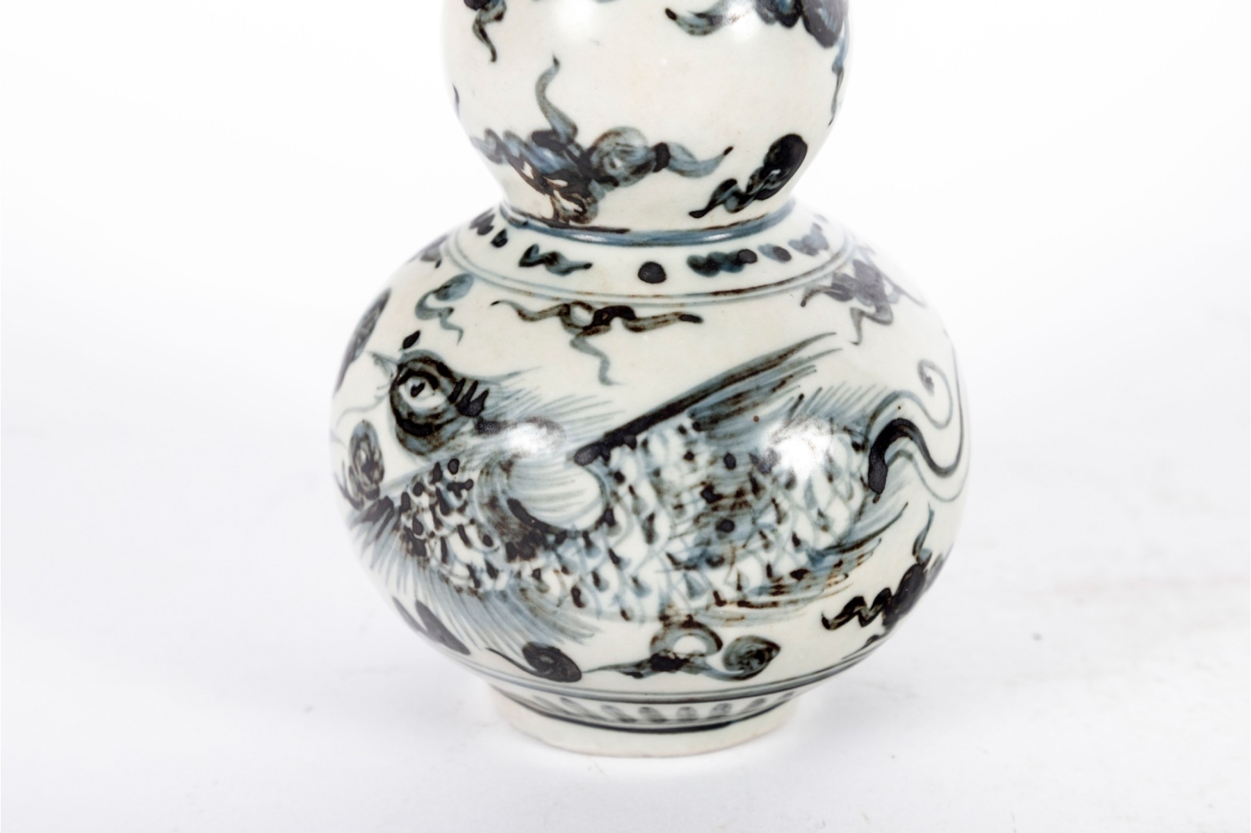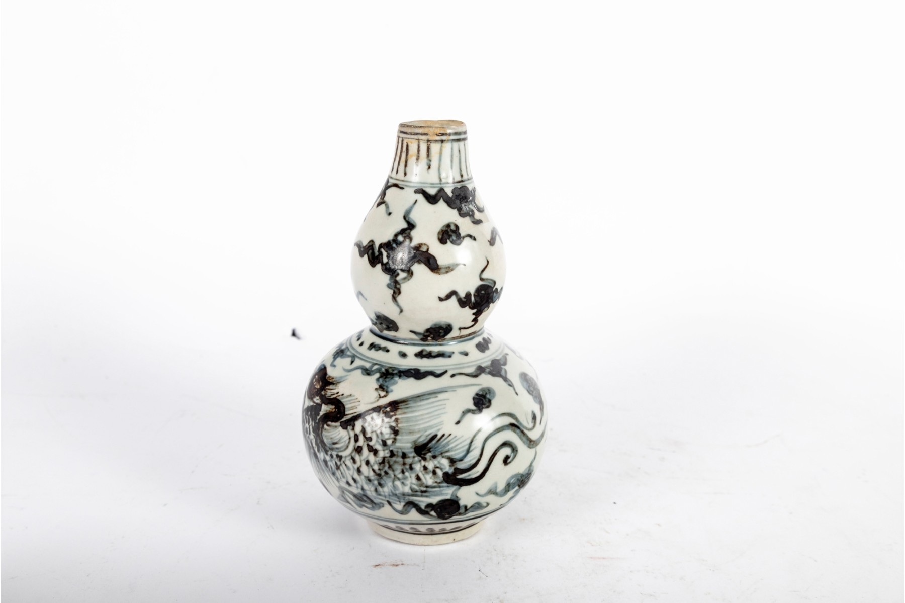 A small 6" tall, elegant Chinese blue and white porcelain vase in a classic double gourd form, finely decorated with hand-painted koi fish swimming among flowing aquatic plants and swirling waves.