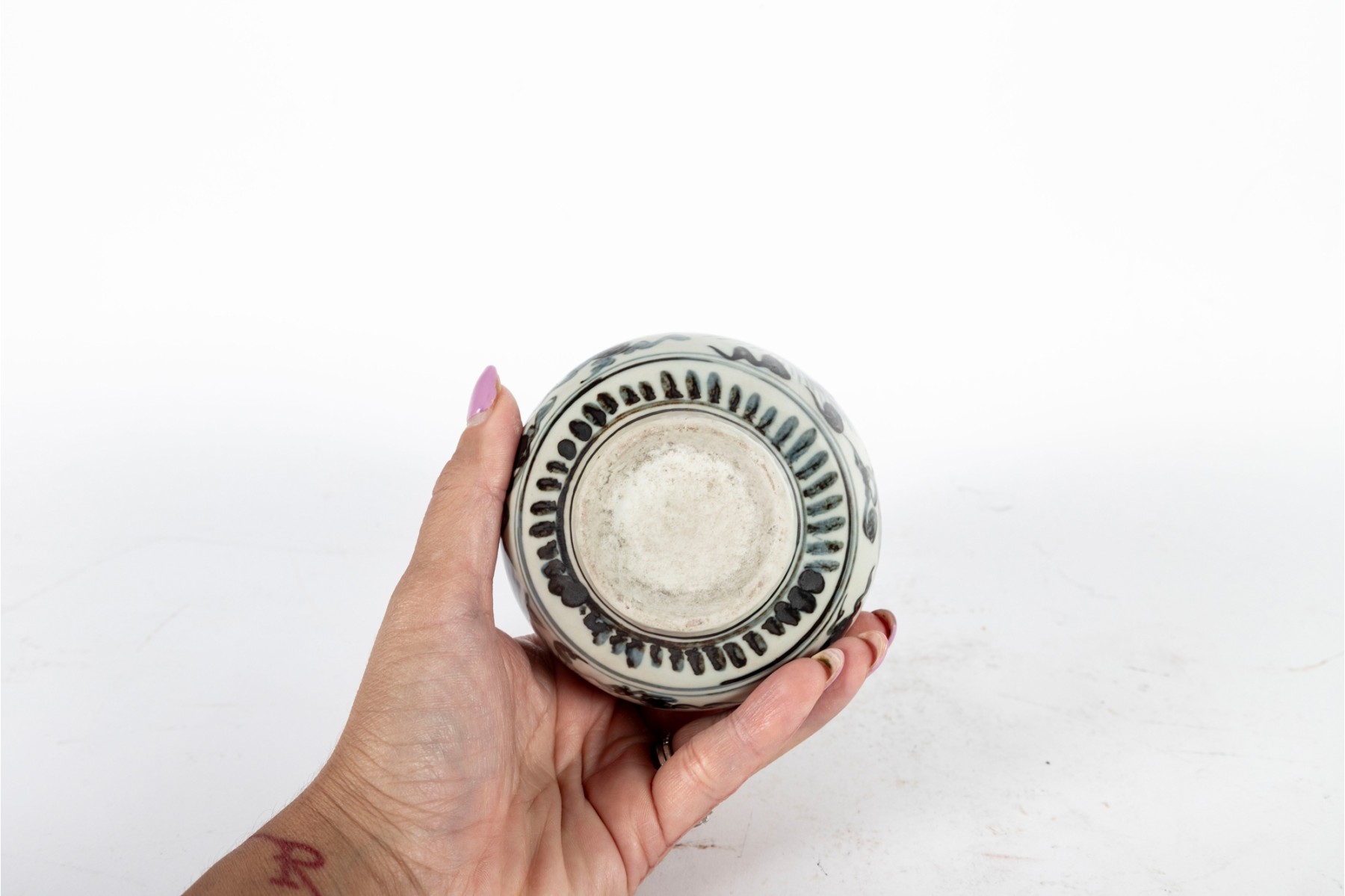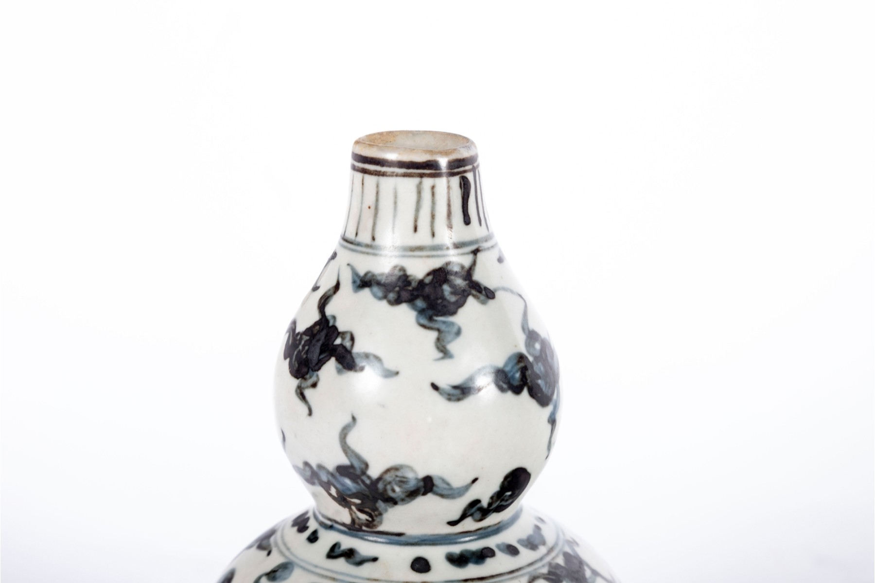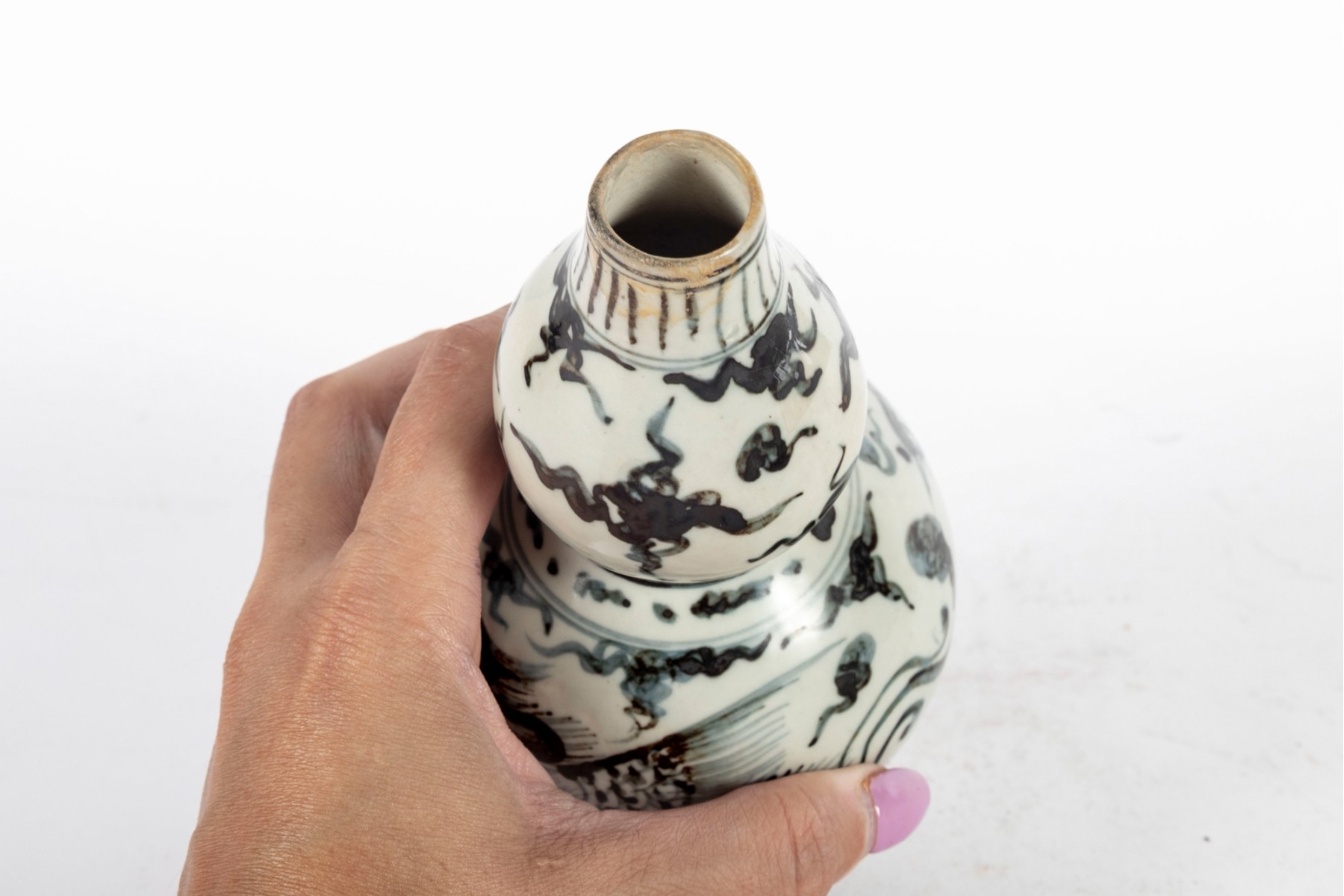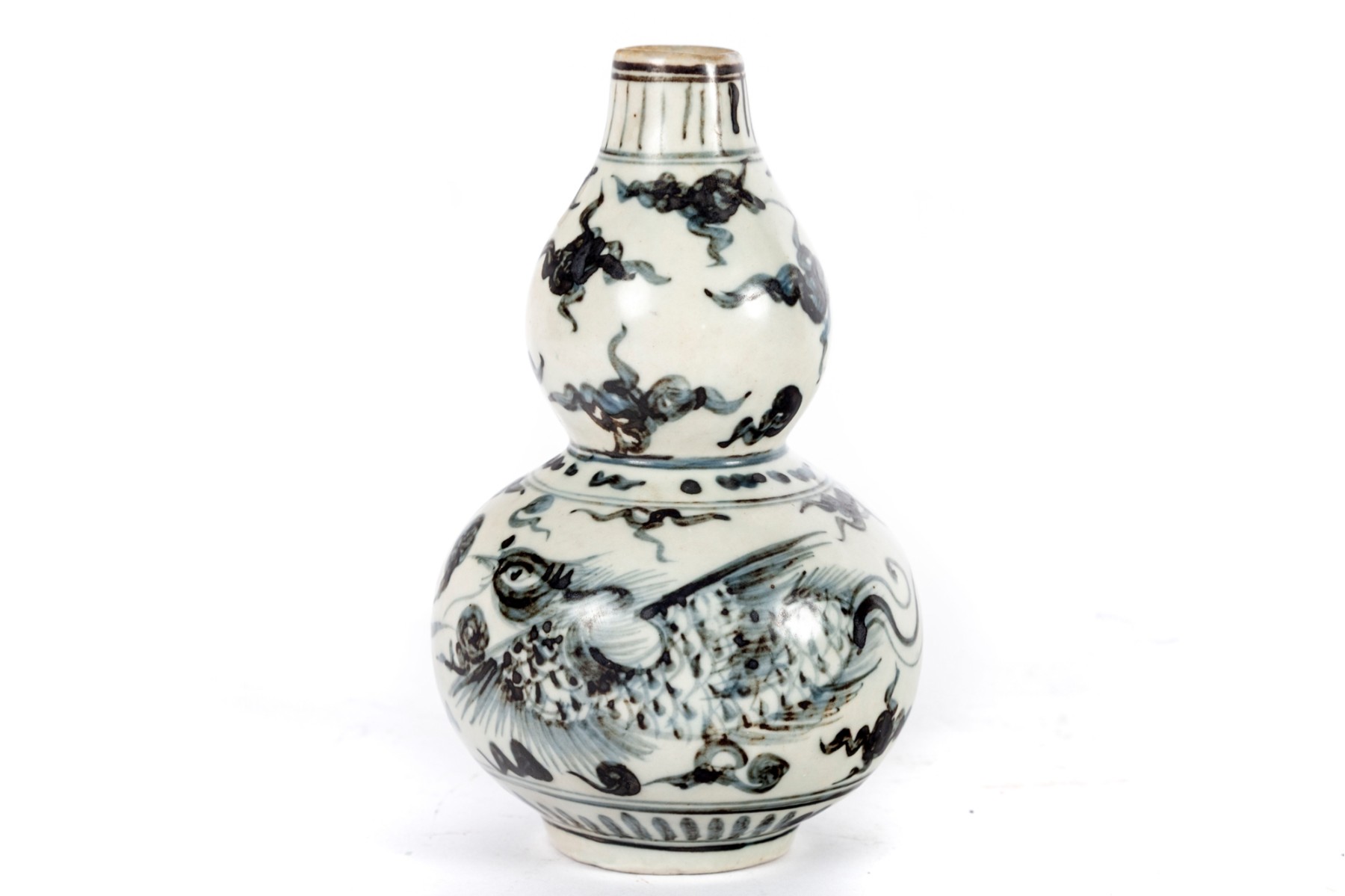 A small 6" tall, elegant Chinese blue and white porcelain vase in a classic double gourd form, finely decorated with hand-painted koi fish swimming among flowing aquatic plants and swirling waves.