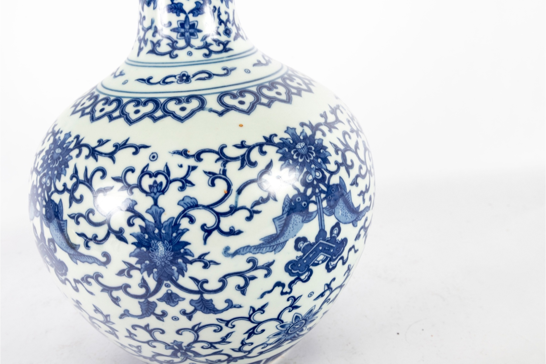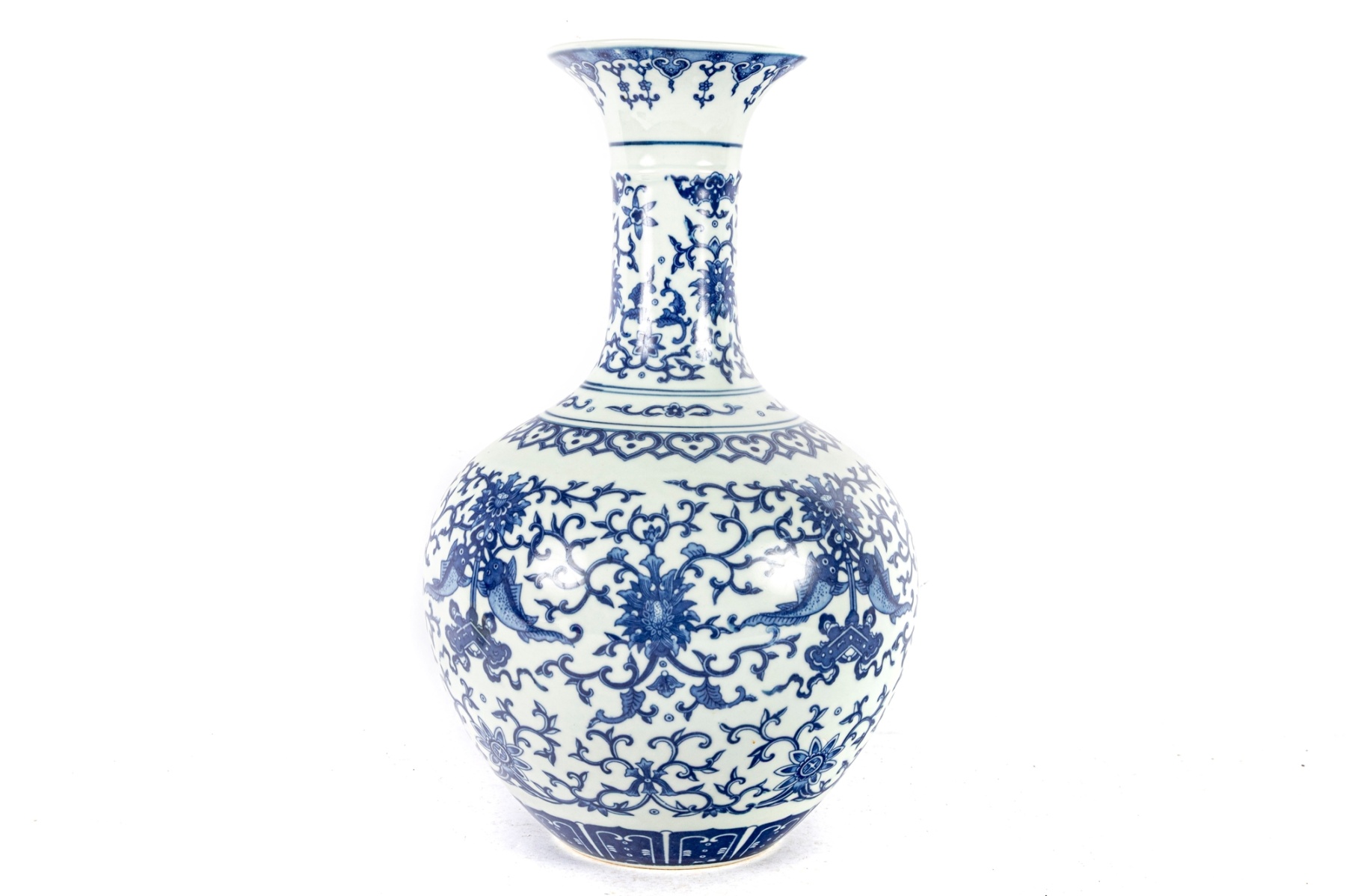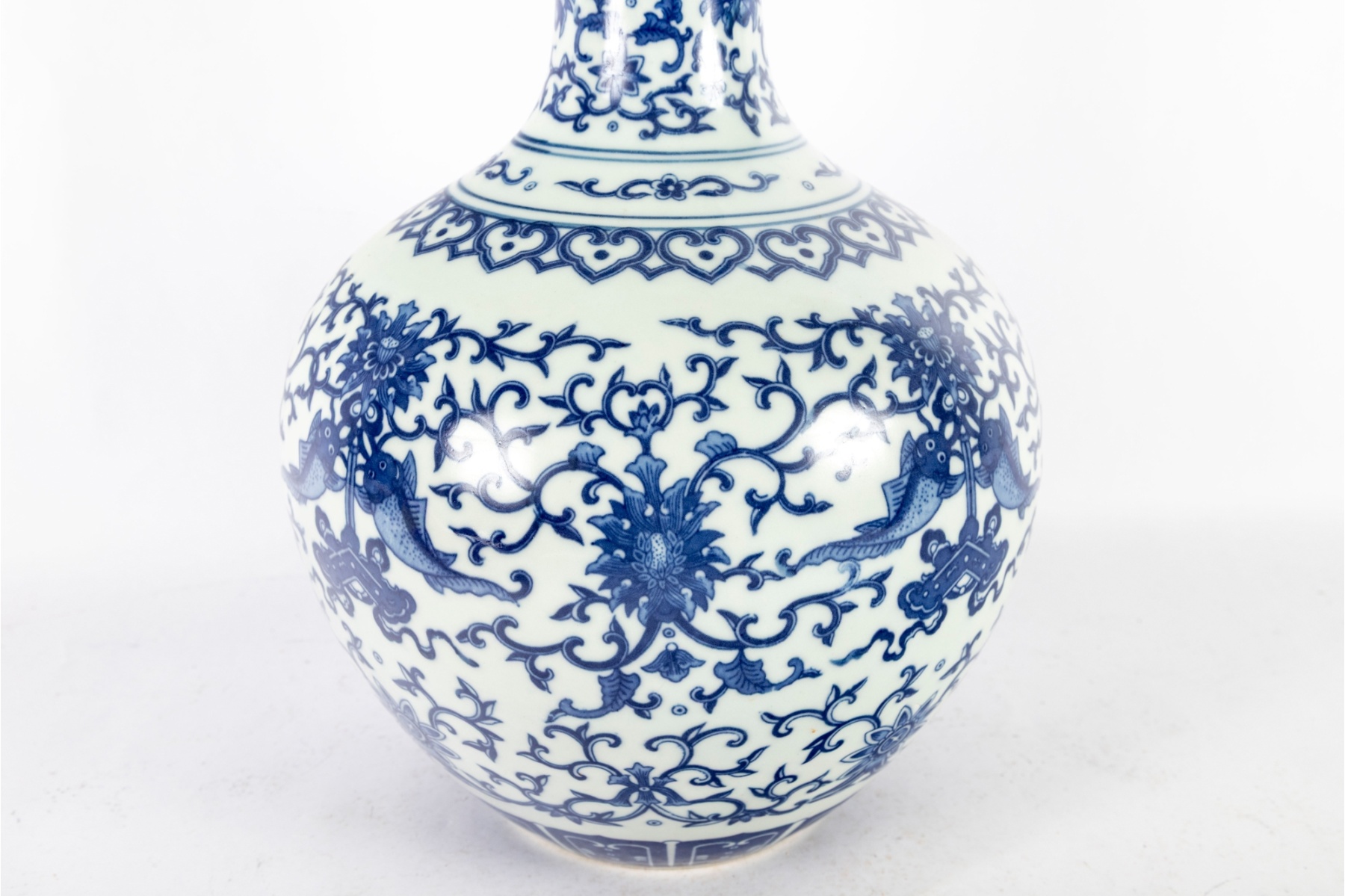 Elegant Chinese blue and white porcelain bottle vase, featuring a beautifully detailed floral and foliate scroll design throughout. The intricate cobalt blue decoration showcases stylized blossoms and scrolling vines, with fish and auspicious symbols integrated into the pattern. The flared rim and long neck are decorated with matching motifs.
