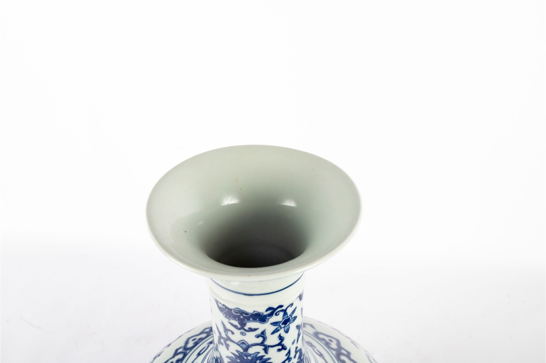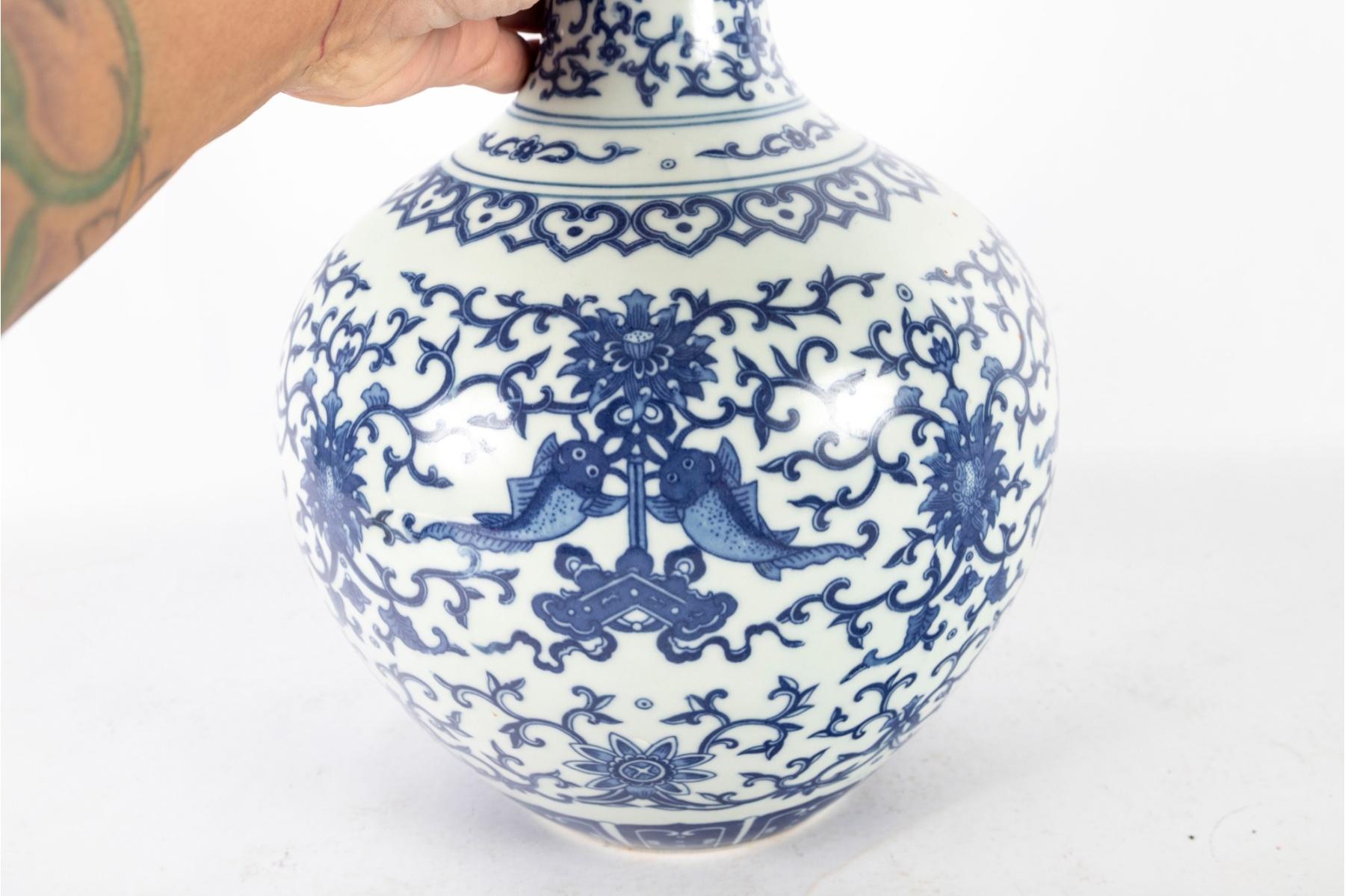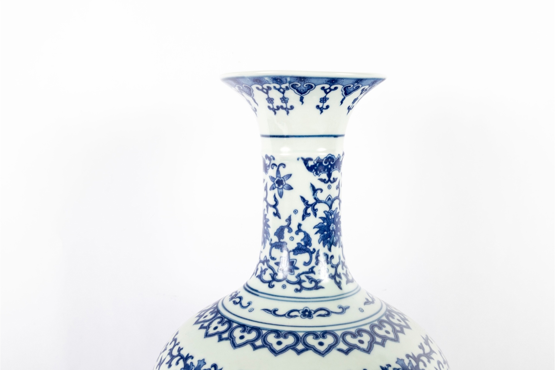 Elegant Chinese blue and white porcelain bottle vase, featuring a beautifully detailed floral and foliate scroll design throughout. The intricate cobalt blue decoration showcases stylized blossoms and scrolling vines, with fish and auspicious symbols integrated into the pattern. The flared rim and long neck are decorated with matching motifs.