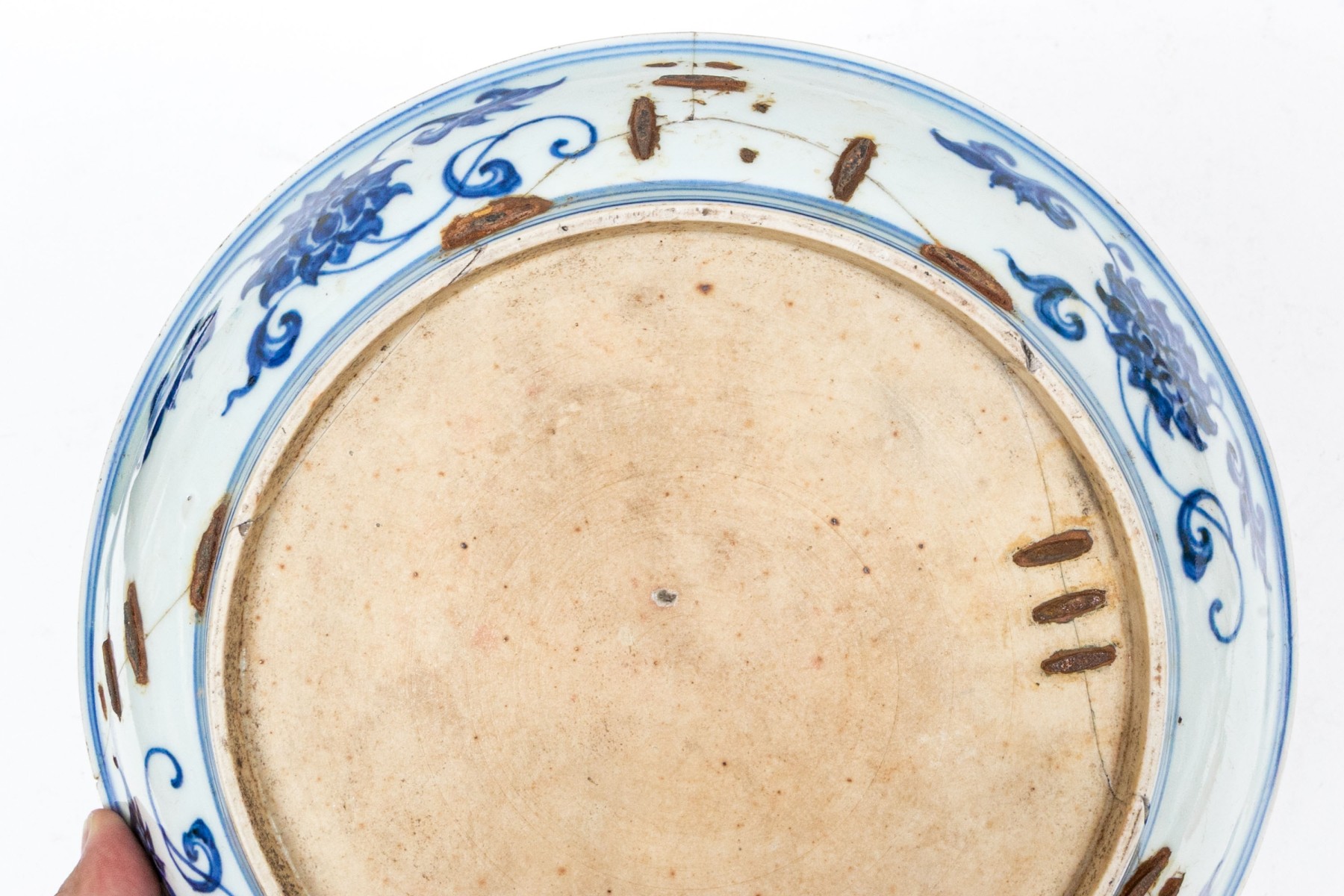 A Chinese blue and white porcelain bowl with central reserve depicting magnolia tree branches with blossoms and large foliate. The central reserve within double circles. Branch and foliate sprays around the interior rim with double blue line to the interior mouth rim. Exterior decorated with lotus sprays.