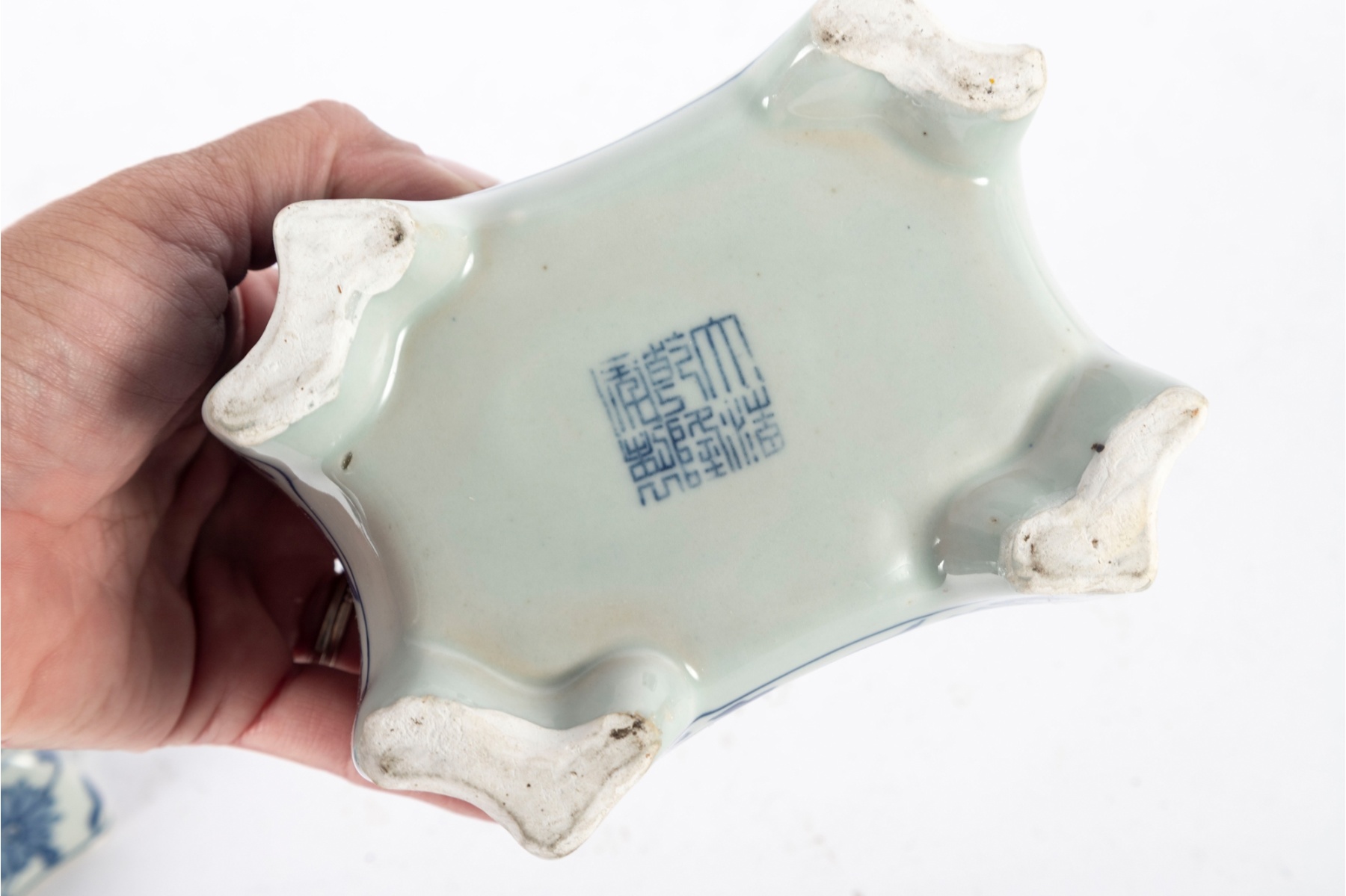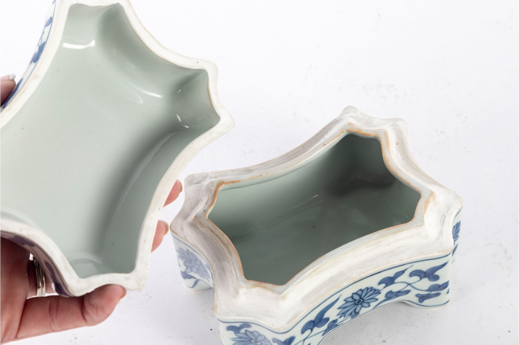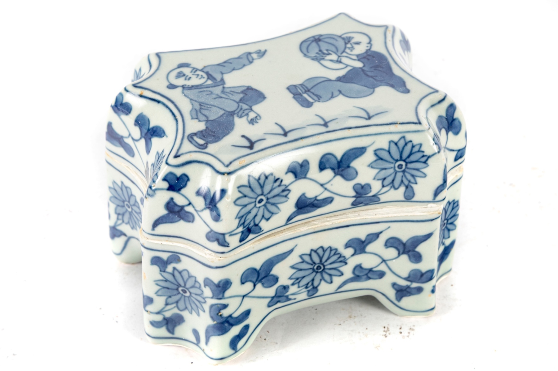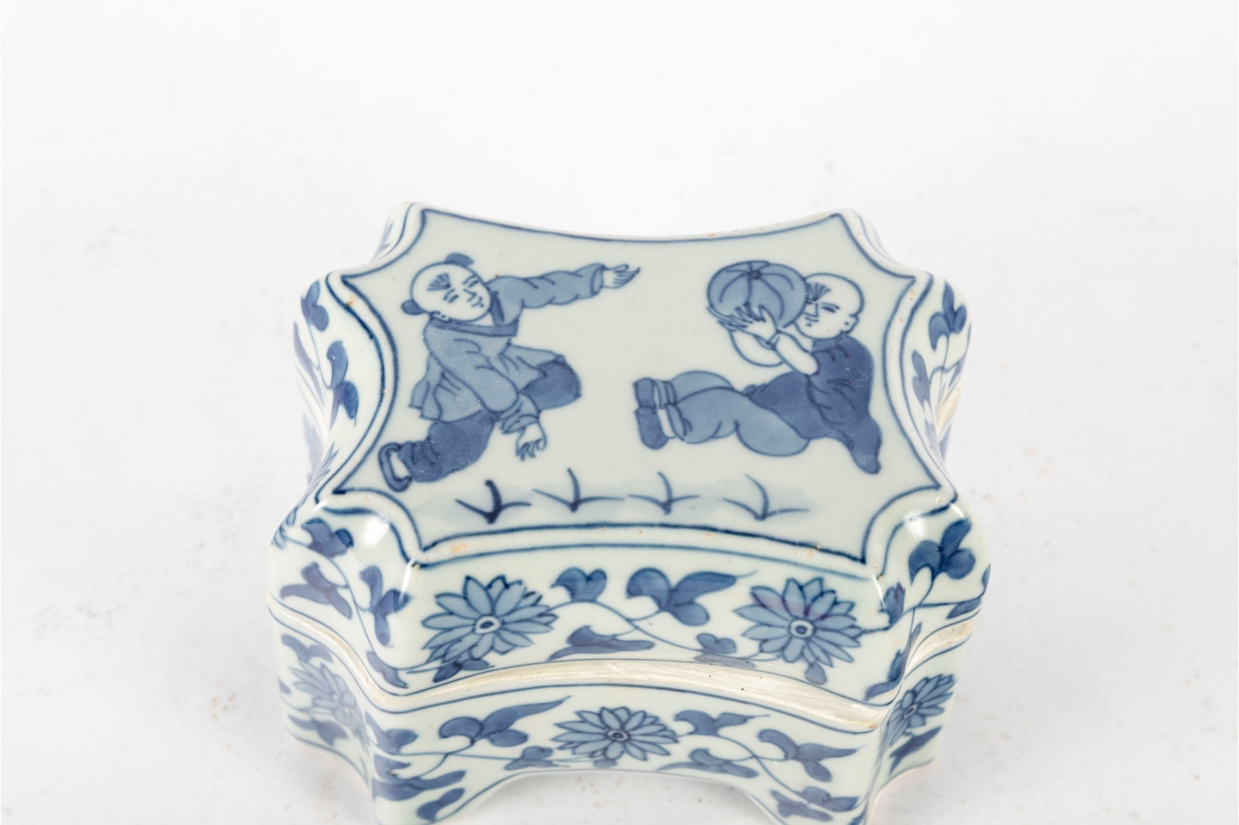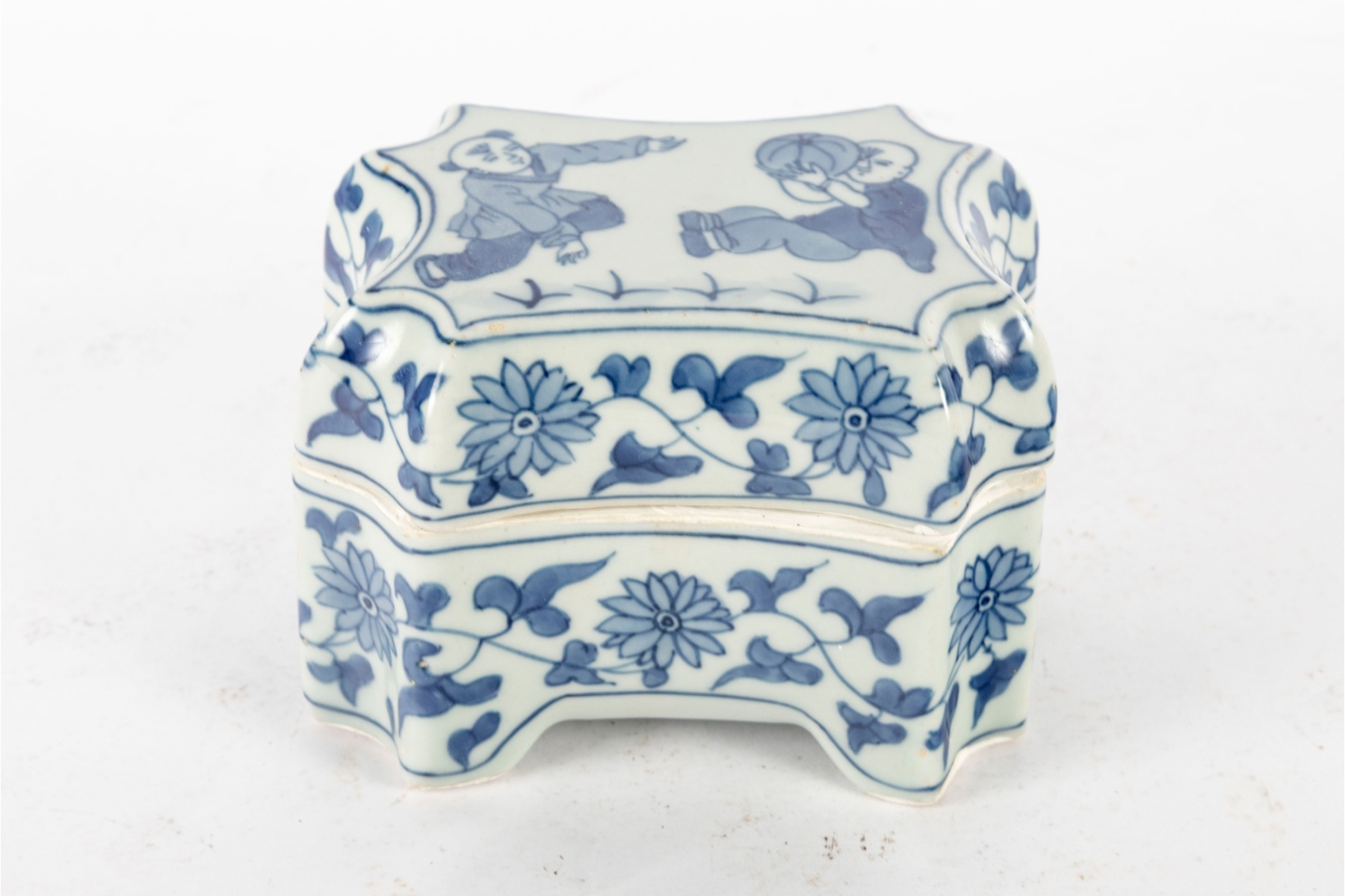 A charming blue and white porcelain covered box of quatrefoil form, finely decorated with floral motifs along the sides and a playful scene of two children at play on the lid. The design features traditional cobalt blue underglaze painting on a pale celadon-toned ground, with a six-character mark to the base.