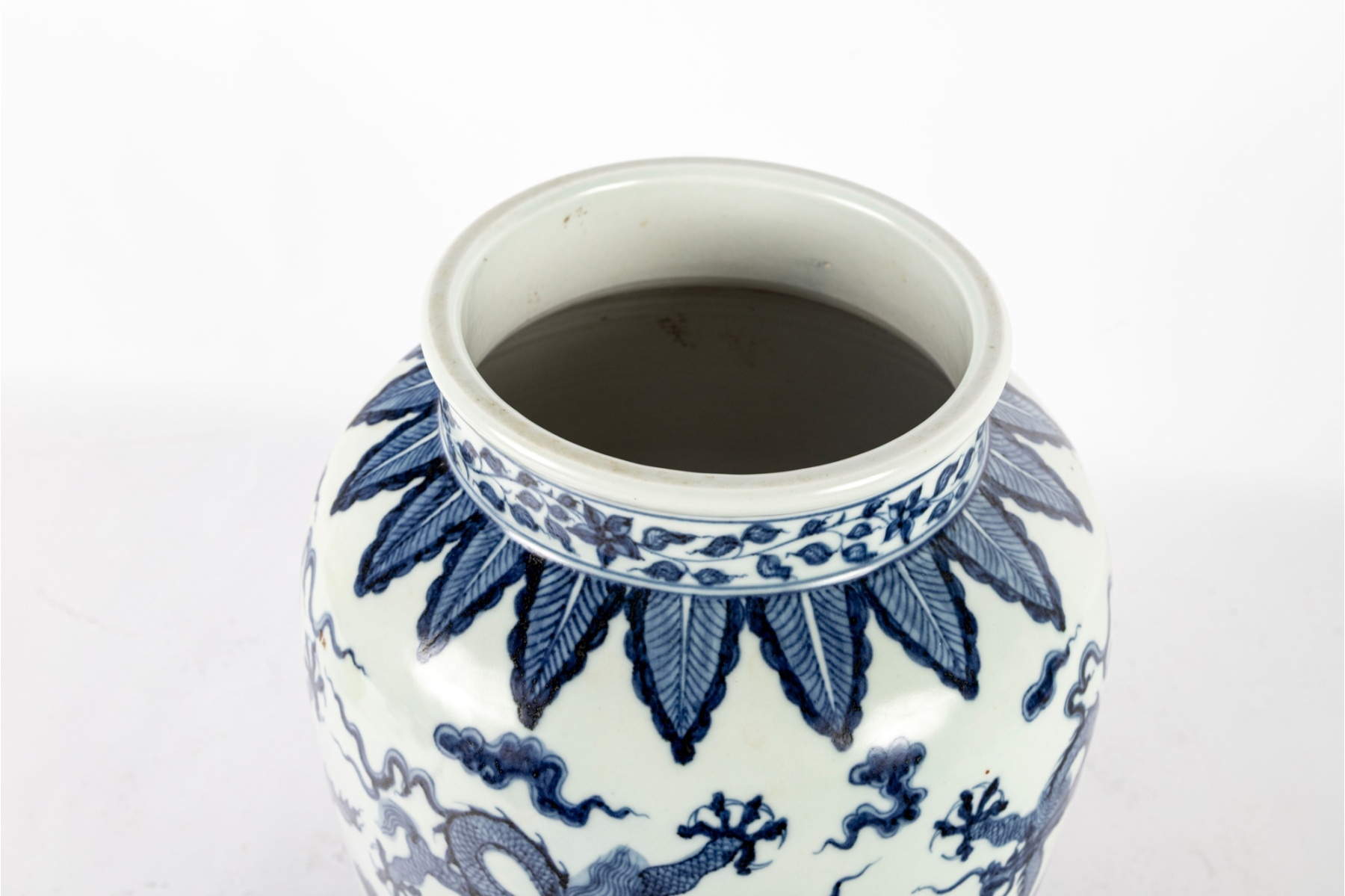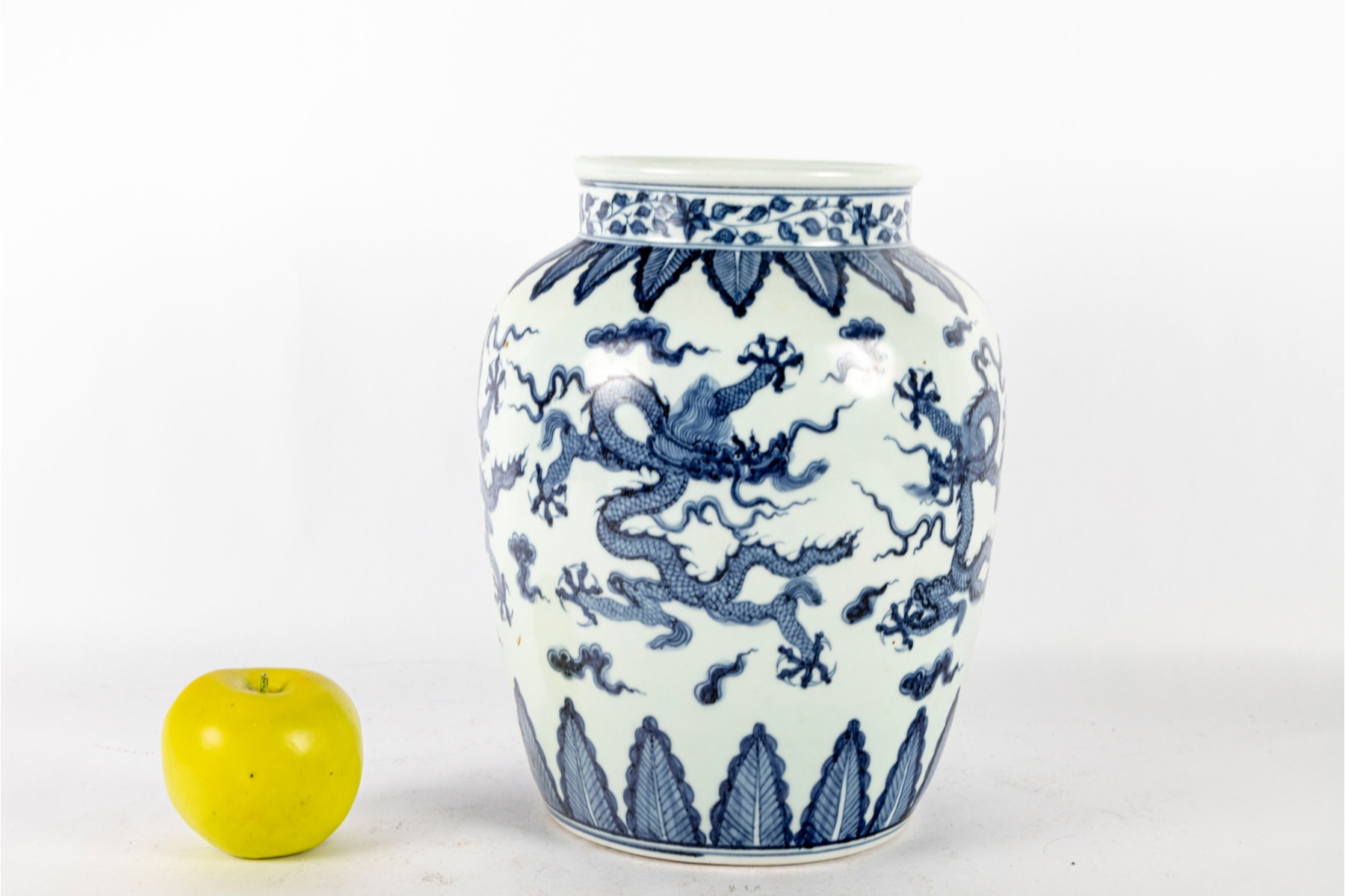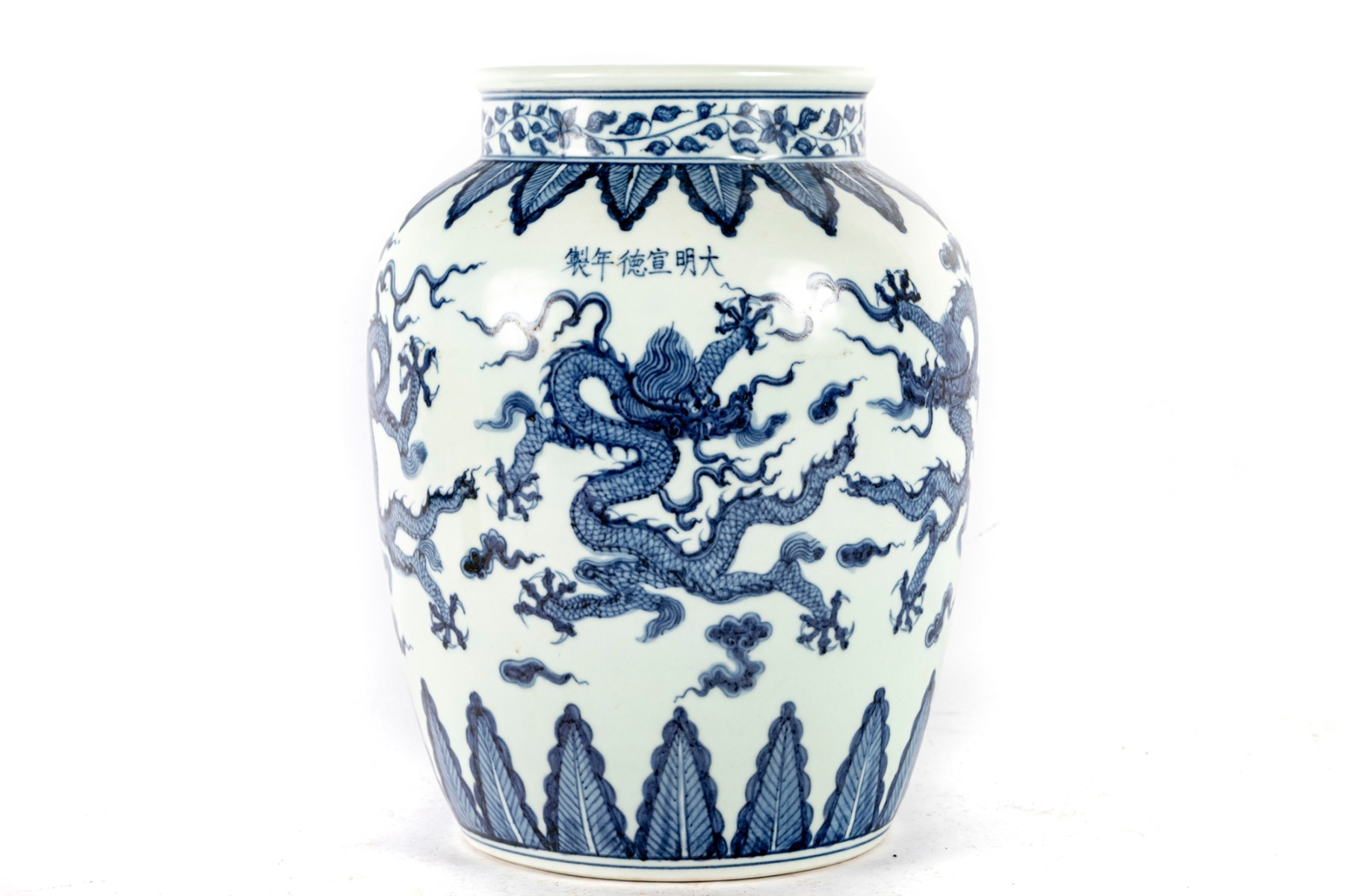 A striking Chinese blue and white porcelain jar finely decorated with five-clawed dragons chasing flaming pearls among stylized clouds, set against a crisp white ground. The design continues around the body with scrolling foliage and classic wave and lappet borders near the rim and base. The piece bears an apocryphal Da Ming Xuande Nian Zhi (Great Ming Dynasty, Xuande period) mark under the glaze, in reference to the revered imperial porcelain of the early Ming era.