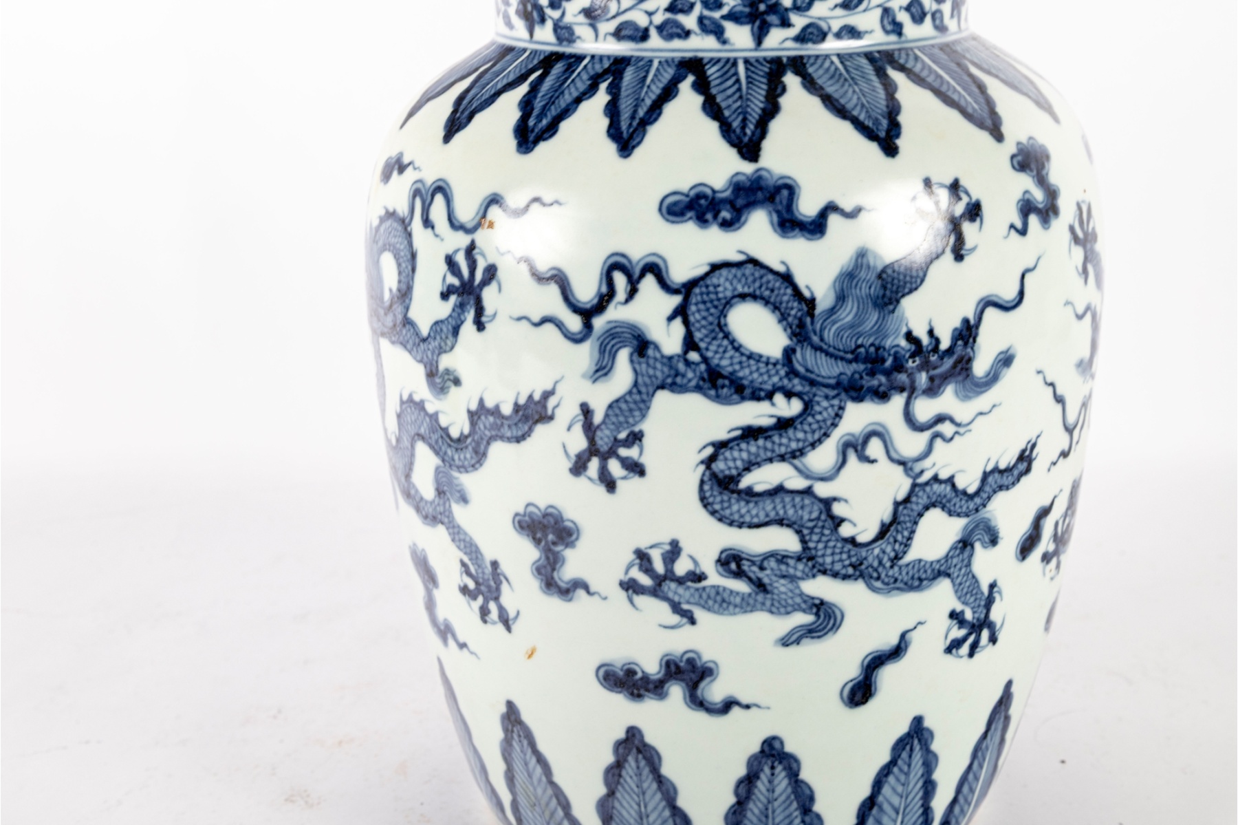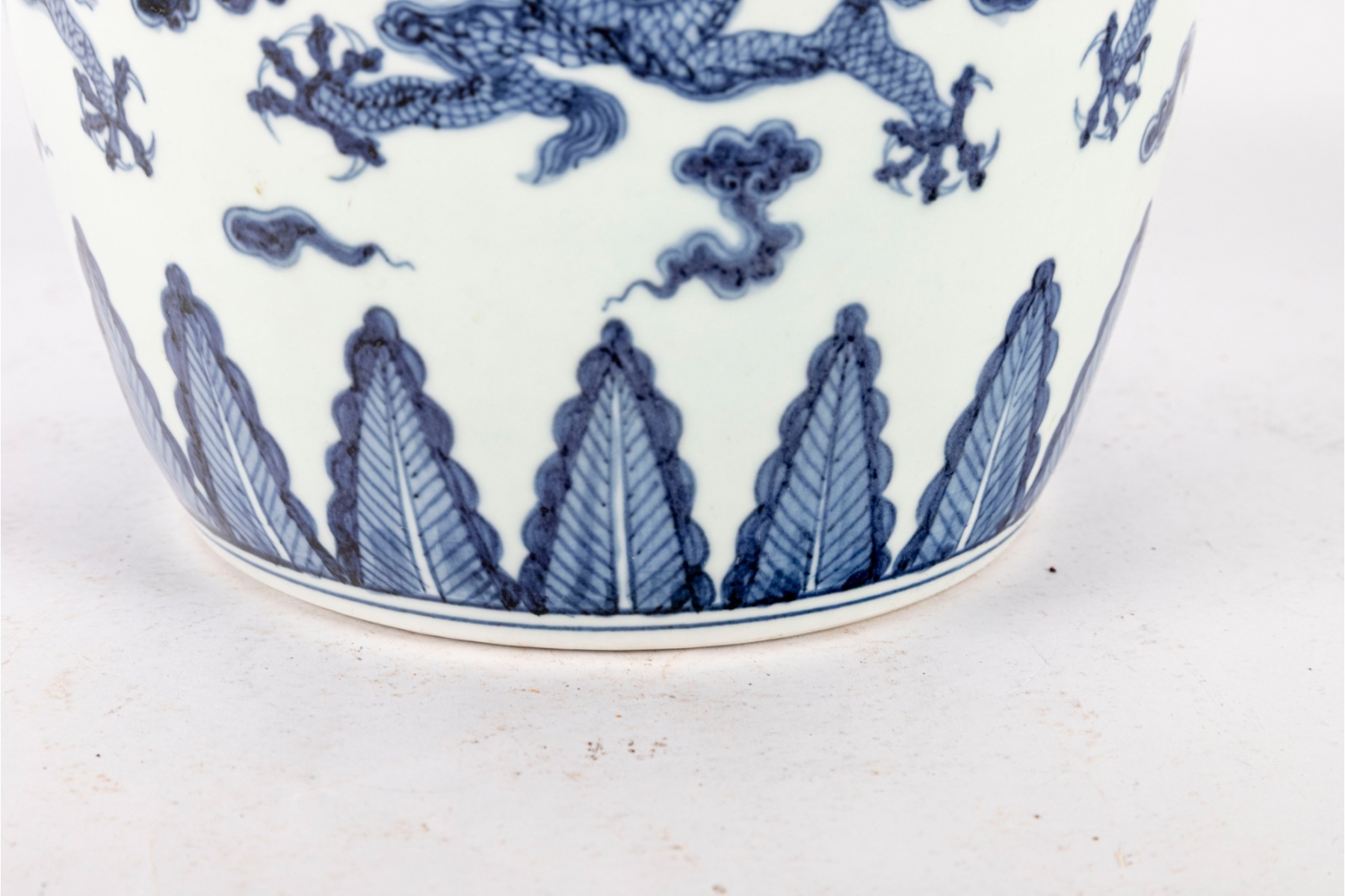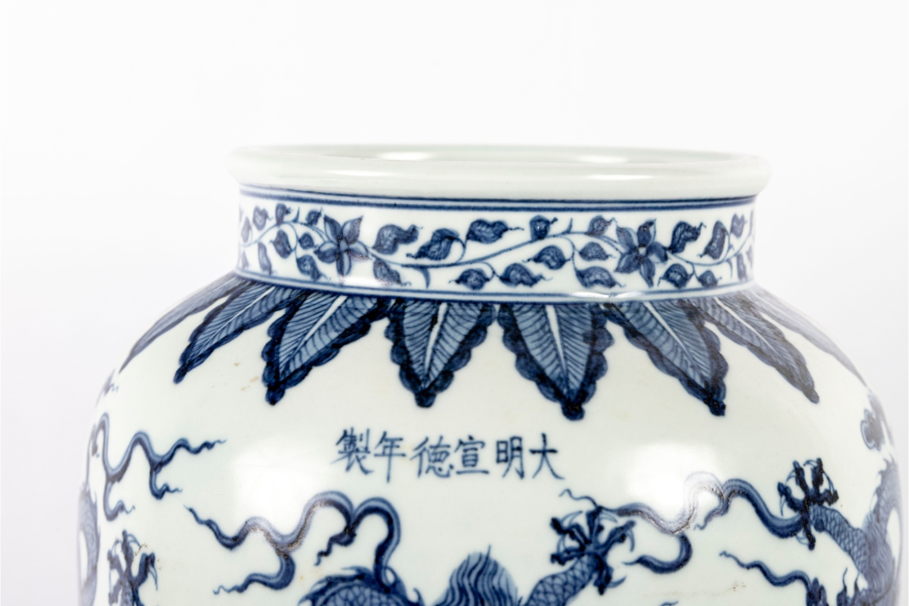 A striking Chinese blue and white porcelain jar finely decorated with five-clawed dragons chasing flaming pearls among stylized clouds, set against a crisp white ground. The design continues around the body with scrolling foliage and classic wave and lappet borders near the rim and base. The piece bears an apocryphal Da Ming Xuande Nian Zhi (Great Ming Dynasty, Xuande period) mark under the glaze, in reference to the revered imperial porcelain of the early Ming era.