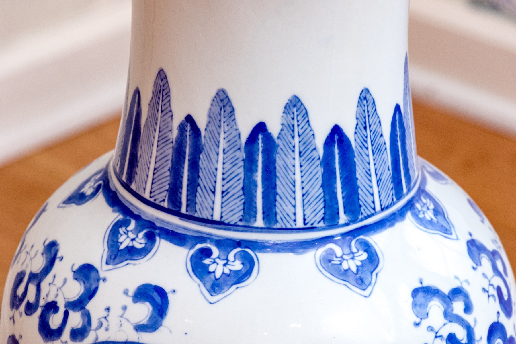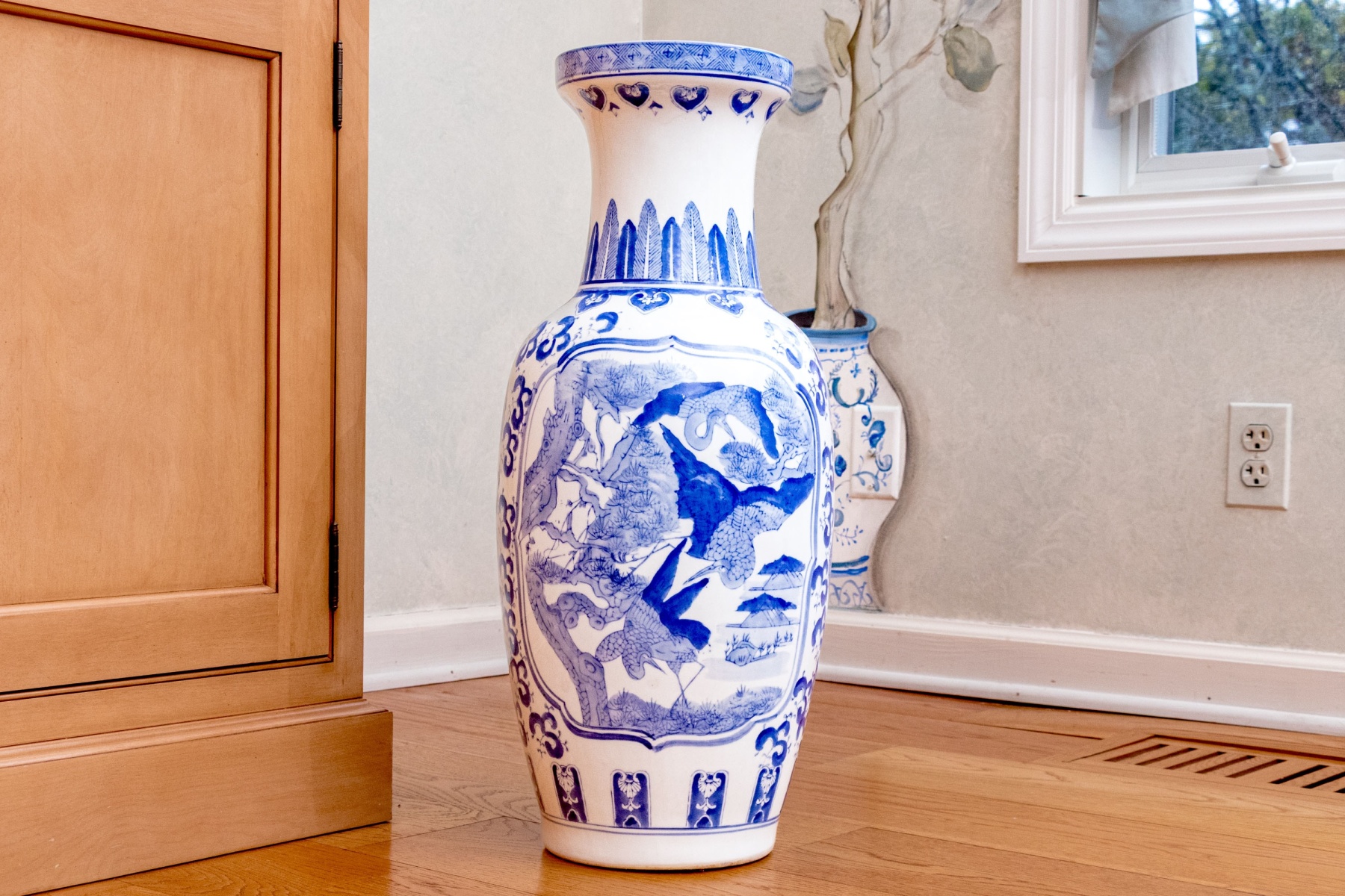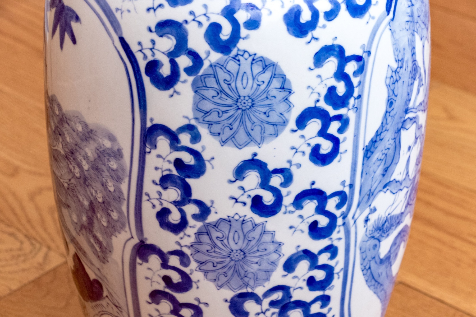 A beautiful Chinese porcelain floor vase with a baluster form with trumpet form neck with blue and white peacocks in landscape with bamboo and rockery in reserve with lappet and lingzhi collar. Marked underfoot.