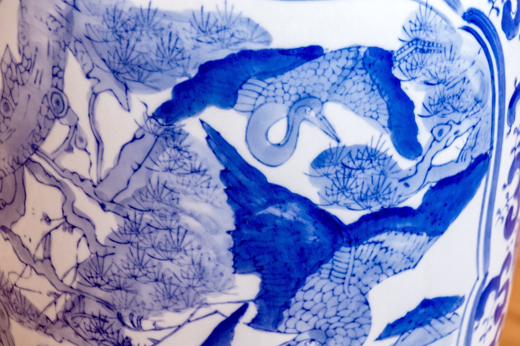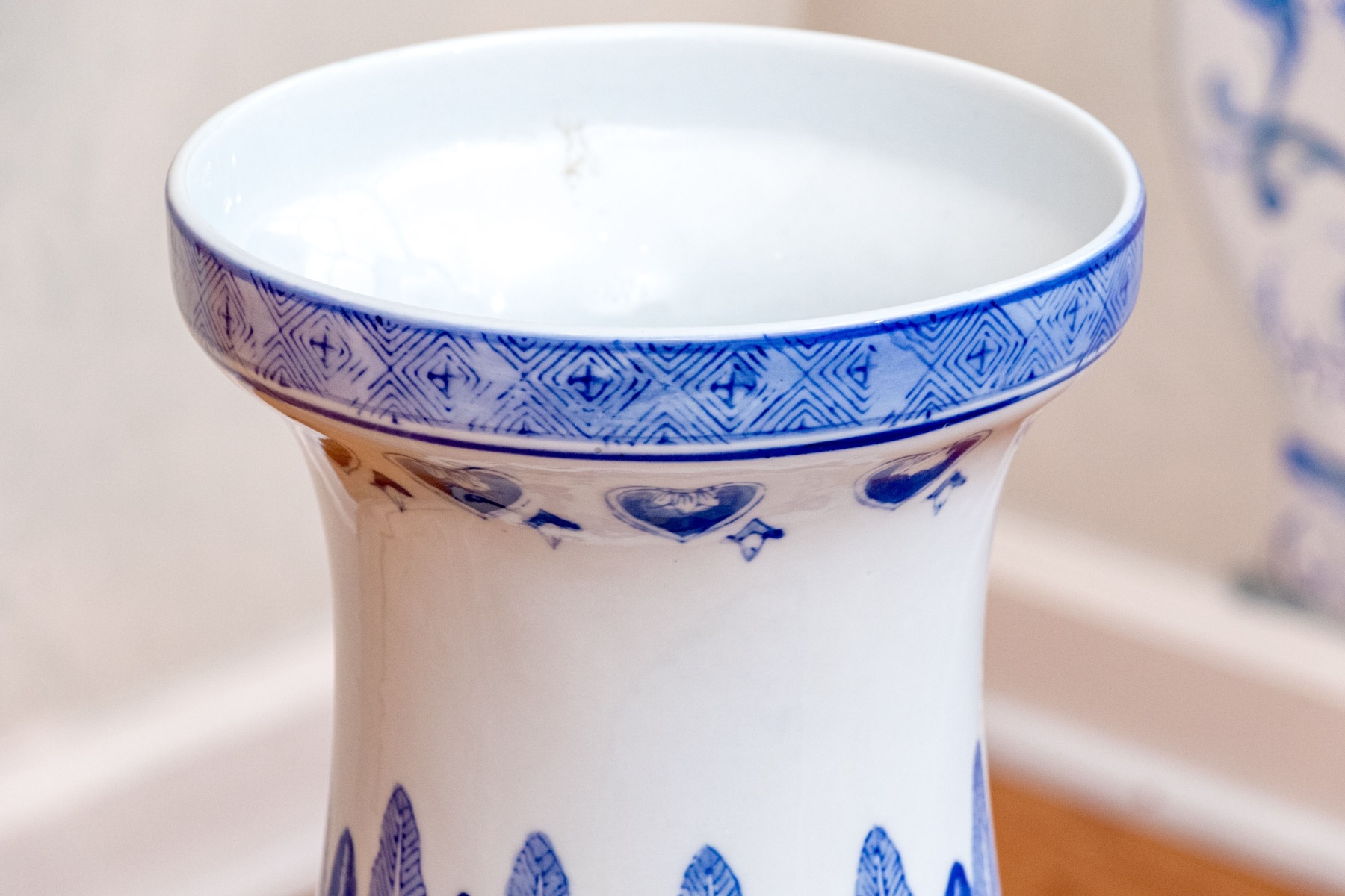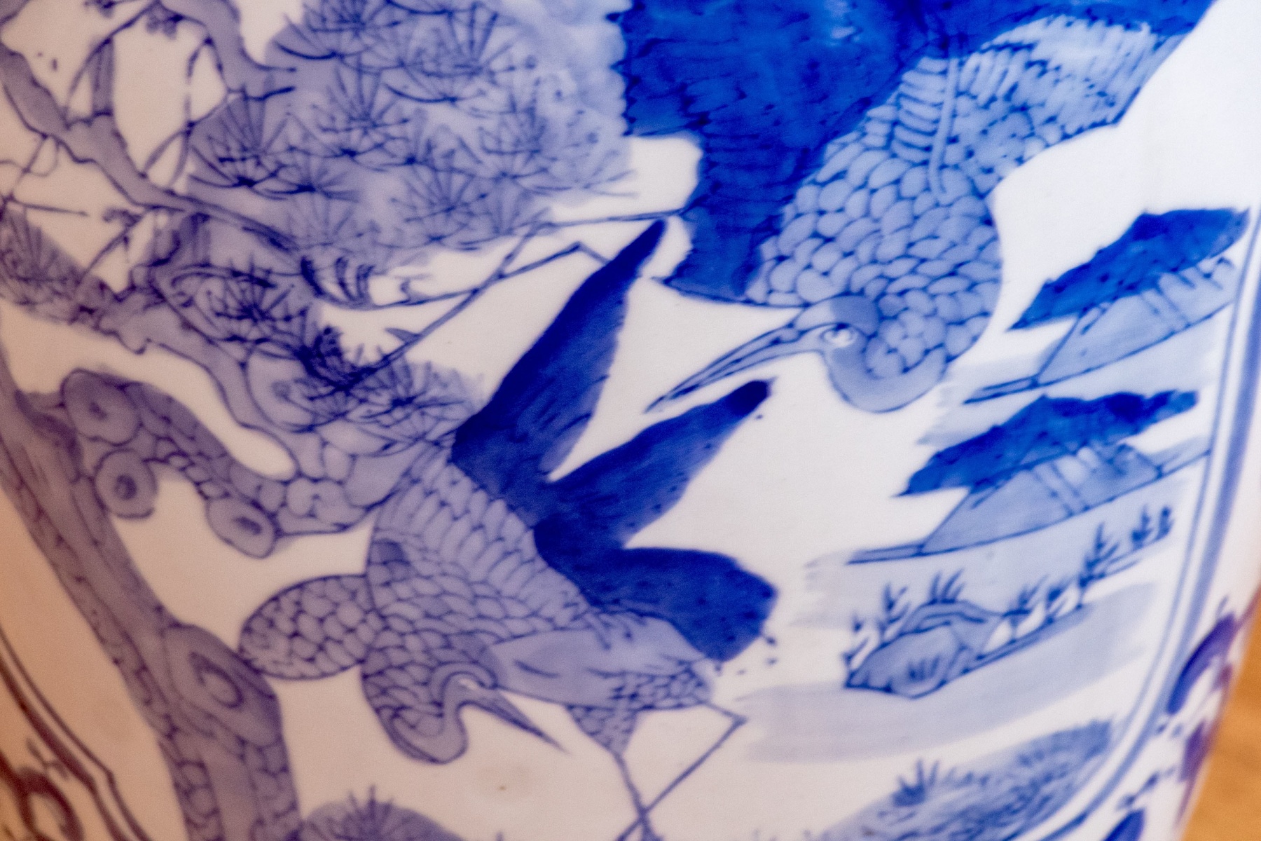 A beautiful Chinese porcelain floor vase with a baluster form with trumpet form neck with blue and white peacocks in landscape with bamboo and rockery in reserve with lappet and lingzhi collar. Marked underfoot.