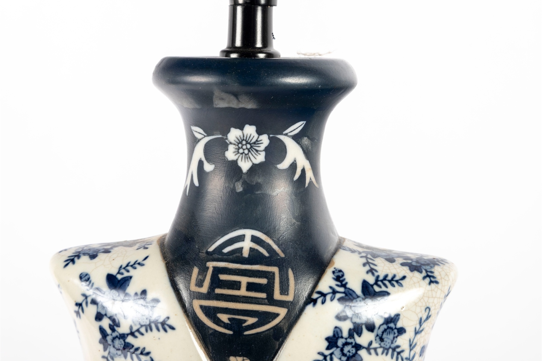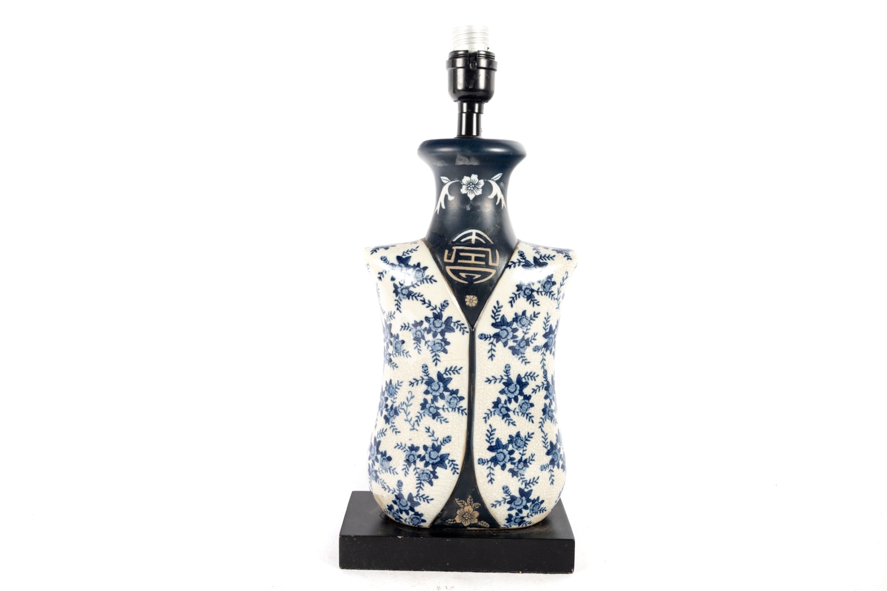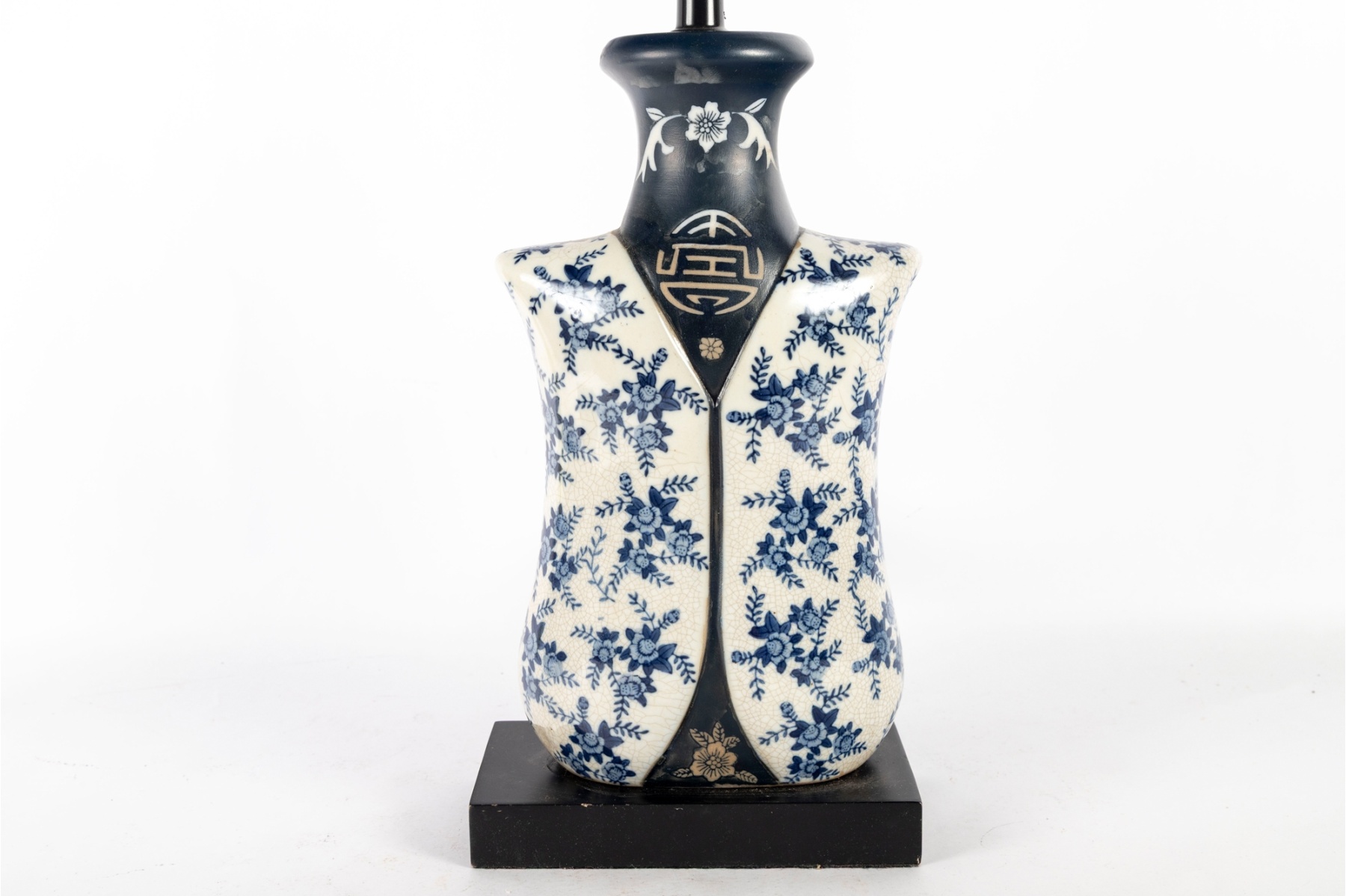 Decorative porcelain table lamp designed in the shape of a traditional robe, featuring a blue floral motif on a crackle-glazed white ground. The upper portion is finished in matte navy with gilt and white floral accents and a stylized character motif at the neckline. Mounted on a black wood base with label marked Made in China.