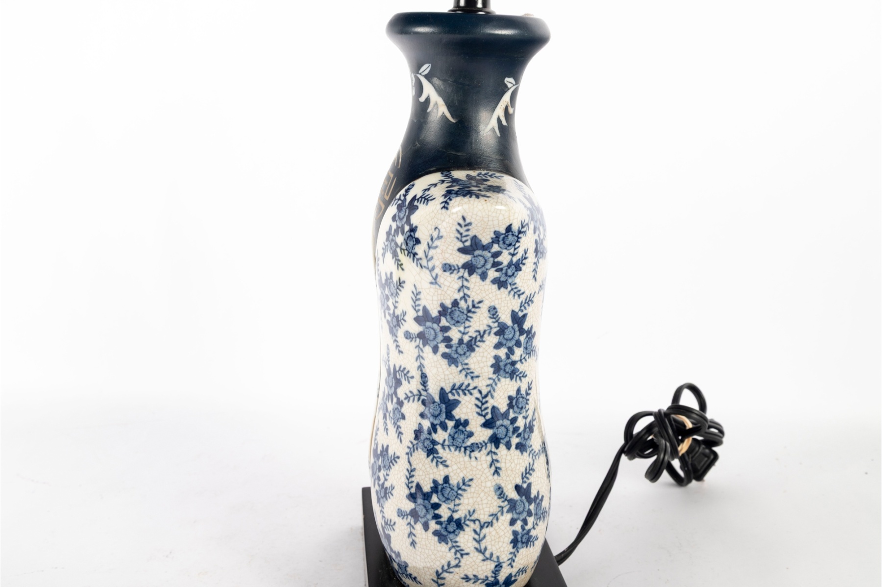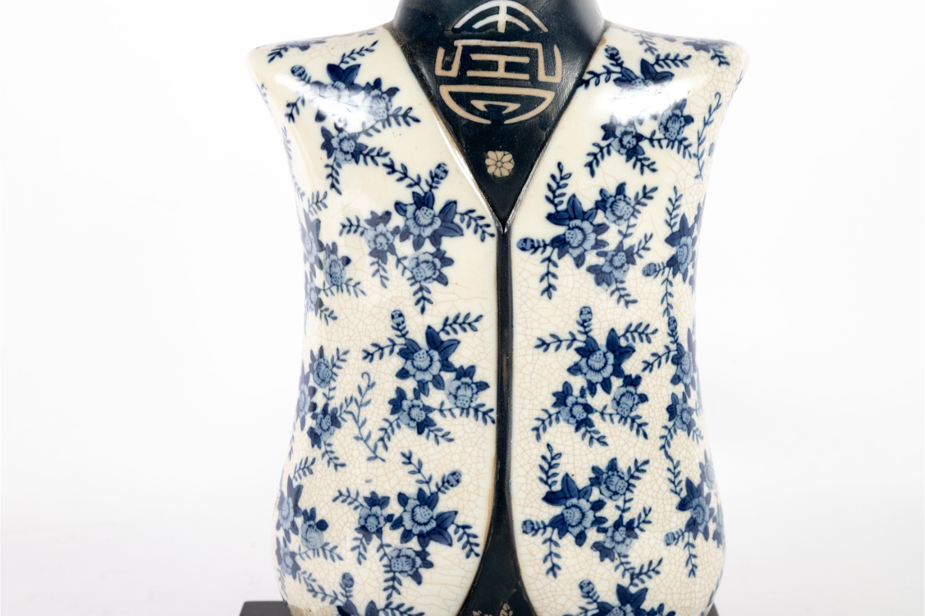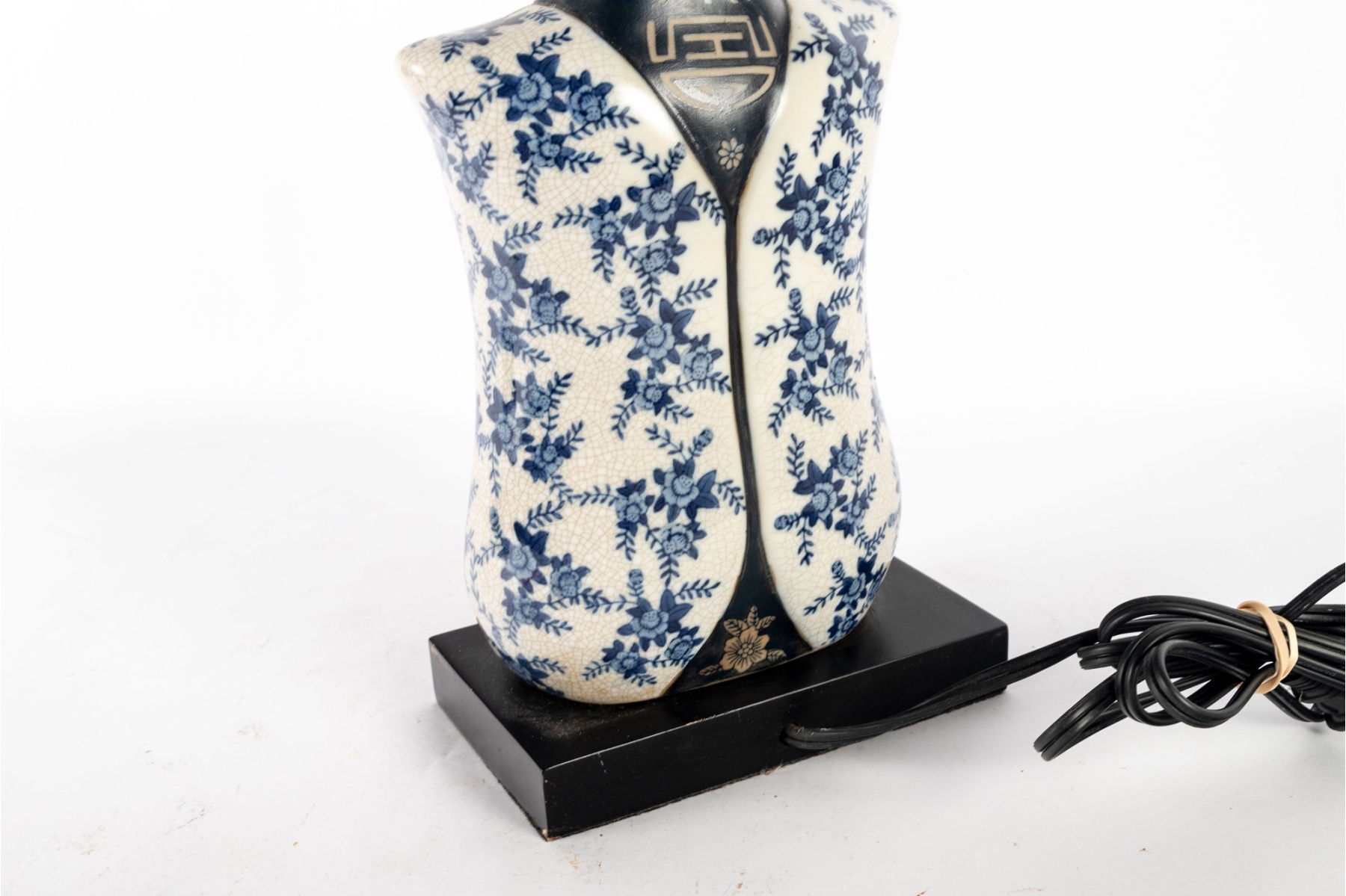 Decorative porcelain table lamp designed in the shape of a traditional robe, featuring a blue floral motif on a crackle-glazed white ground. The upper portion is finished in matte navy with gilt and white floral accents and a stylized character motif at the neckline. Mounted on a black wood base with label marked Made in China.