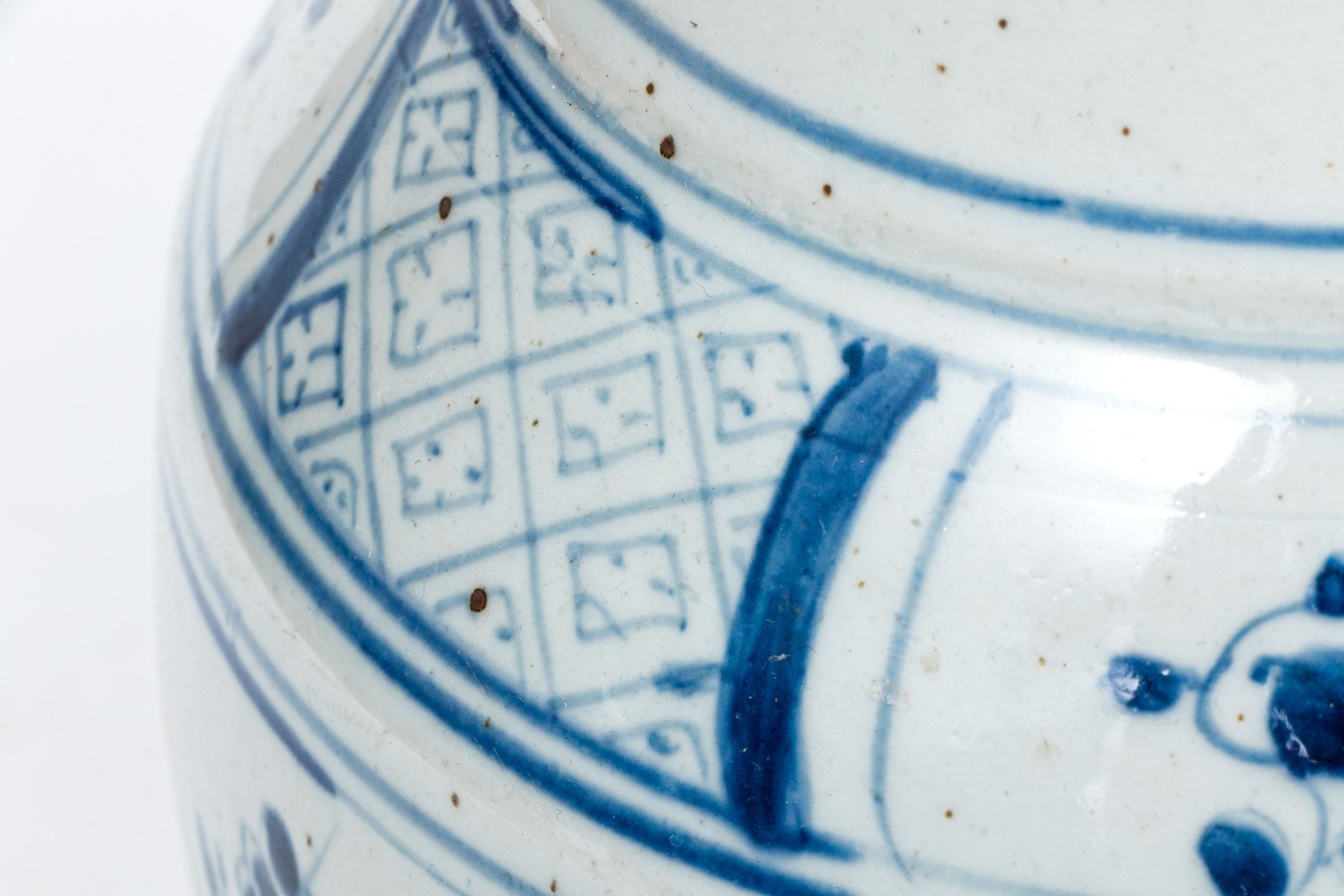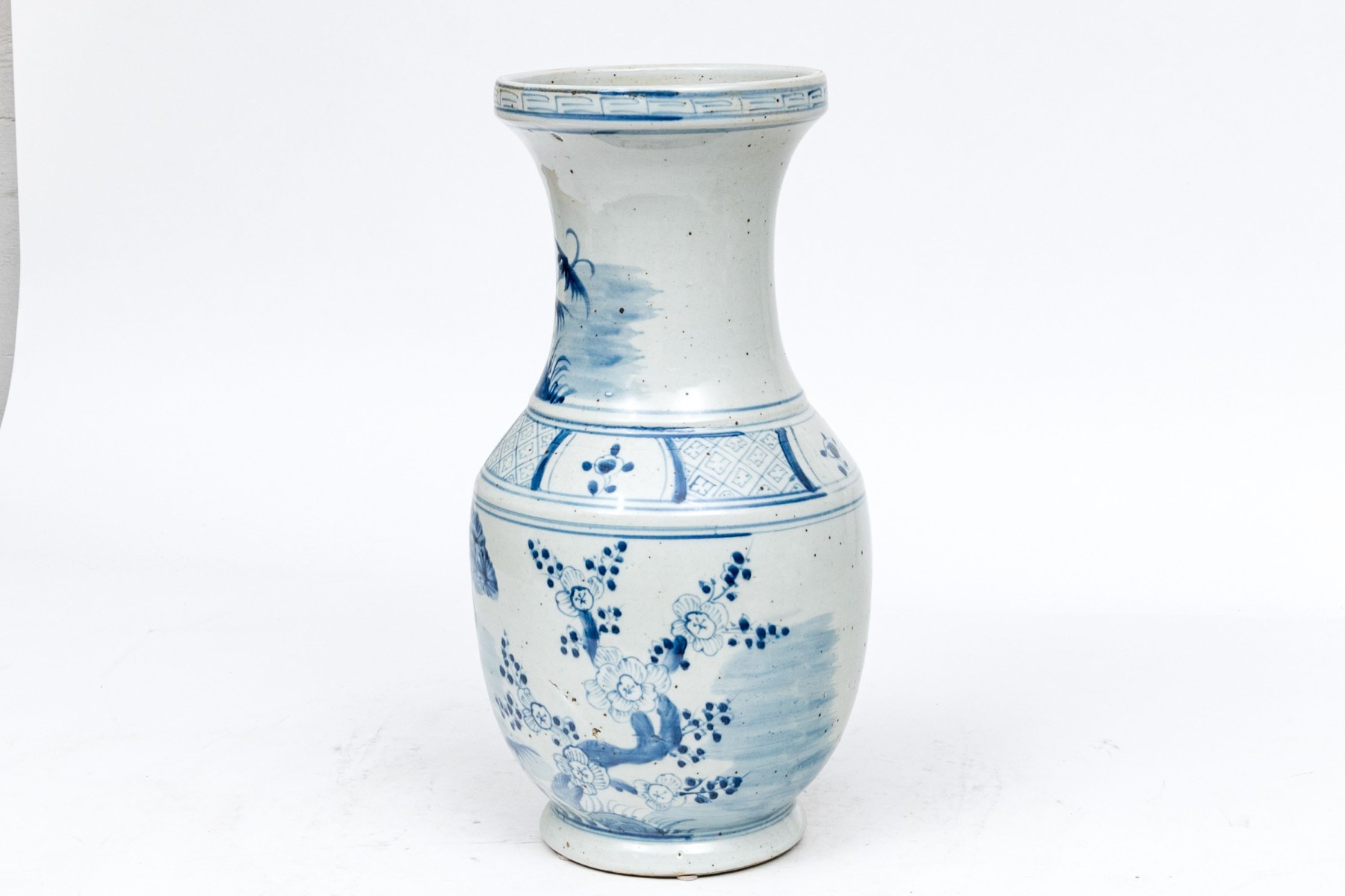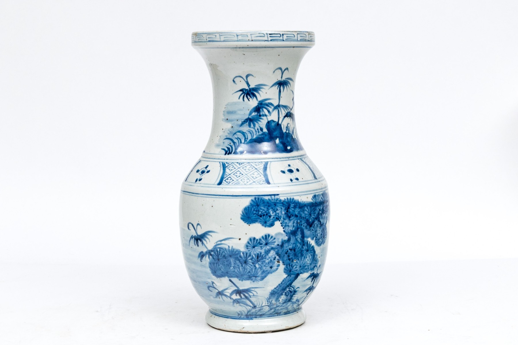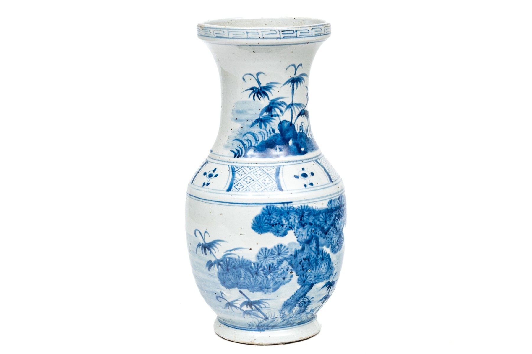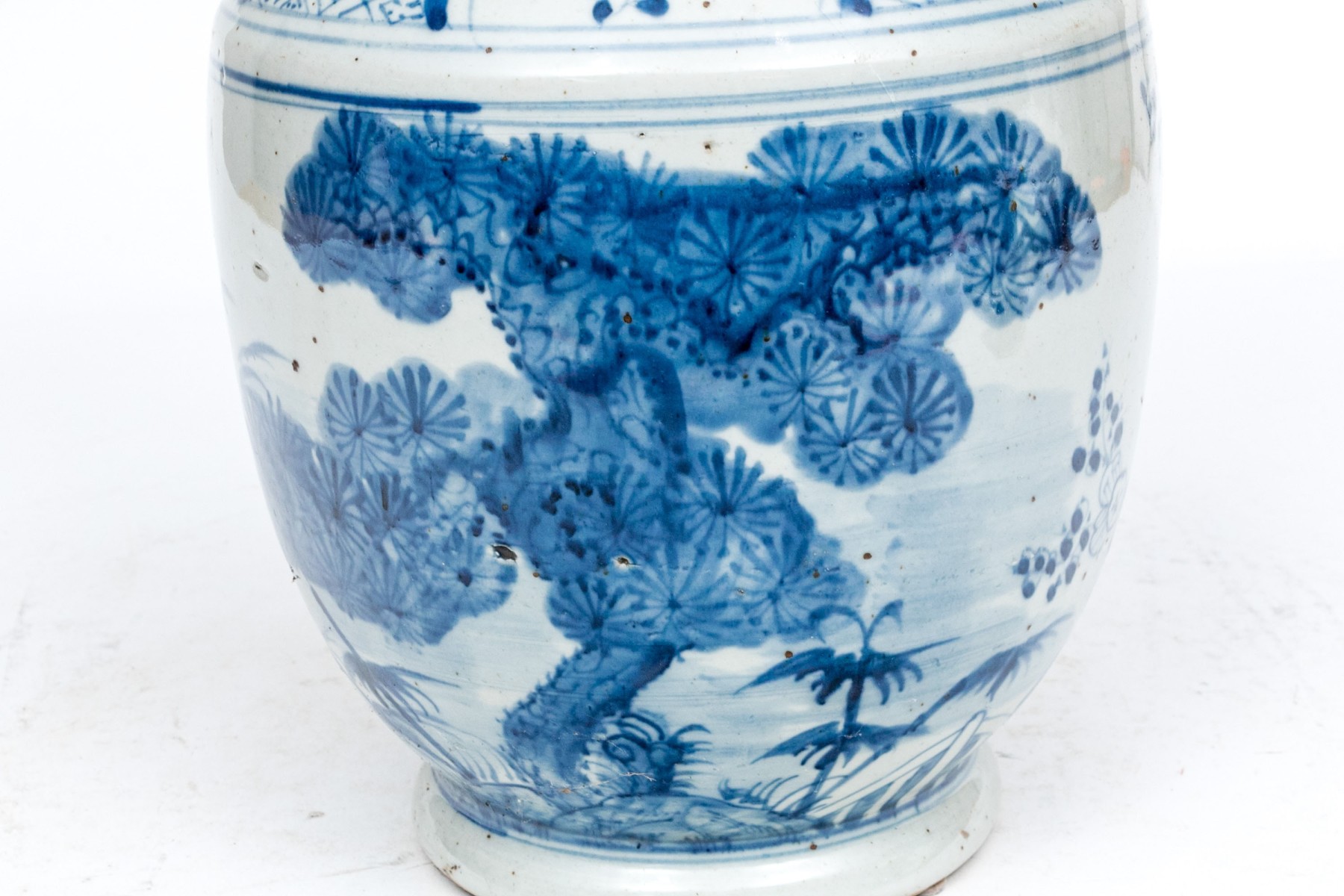 A tall necked jar with decoration of tall grasses and foliage on the neck and a tree, tall grasses and flowering branches on the body. A geometric band separates the two.