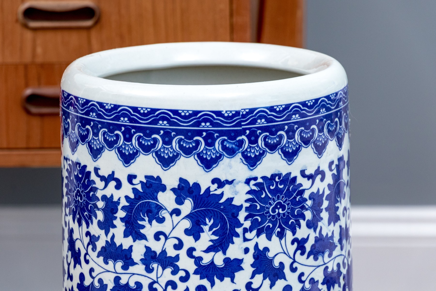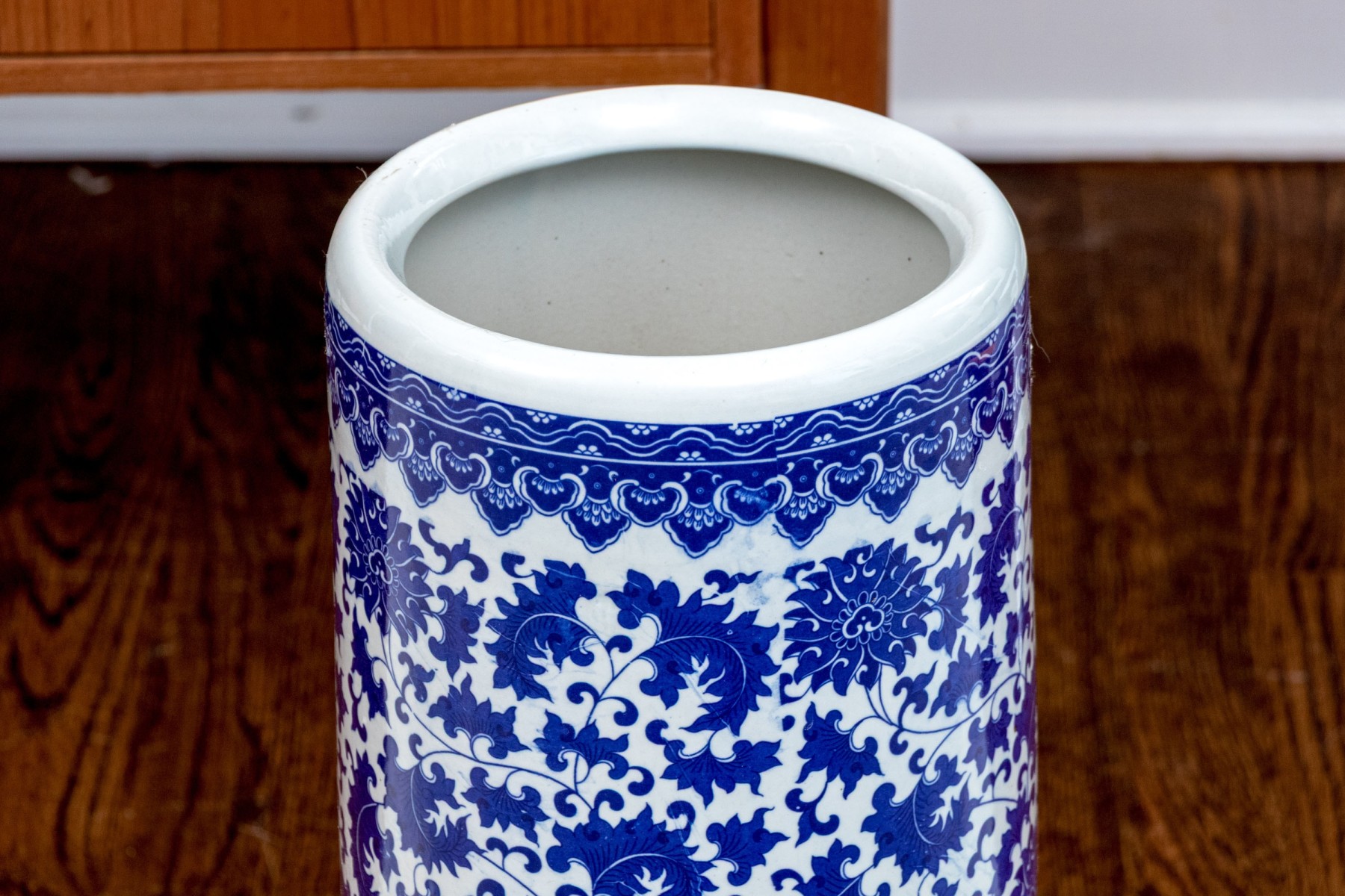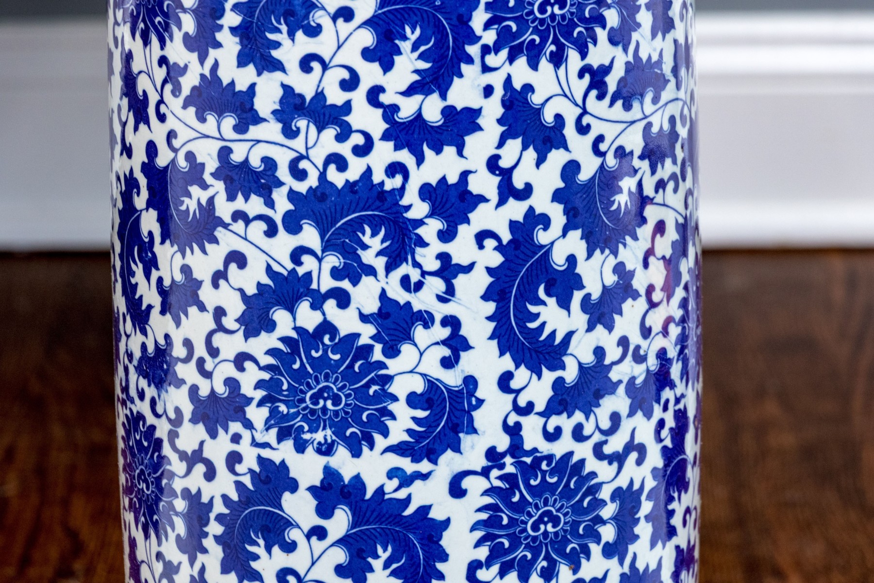 A gorgeous 20th century Chinese porcelain umbrella stand in sleek cylindrical form, well decorated with transferware scalloped borders and ornate flowers on fine vining foliage in vibrant monochromatic blue.