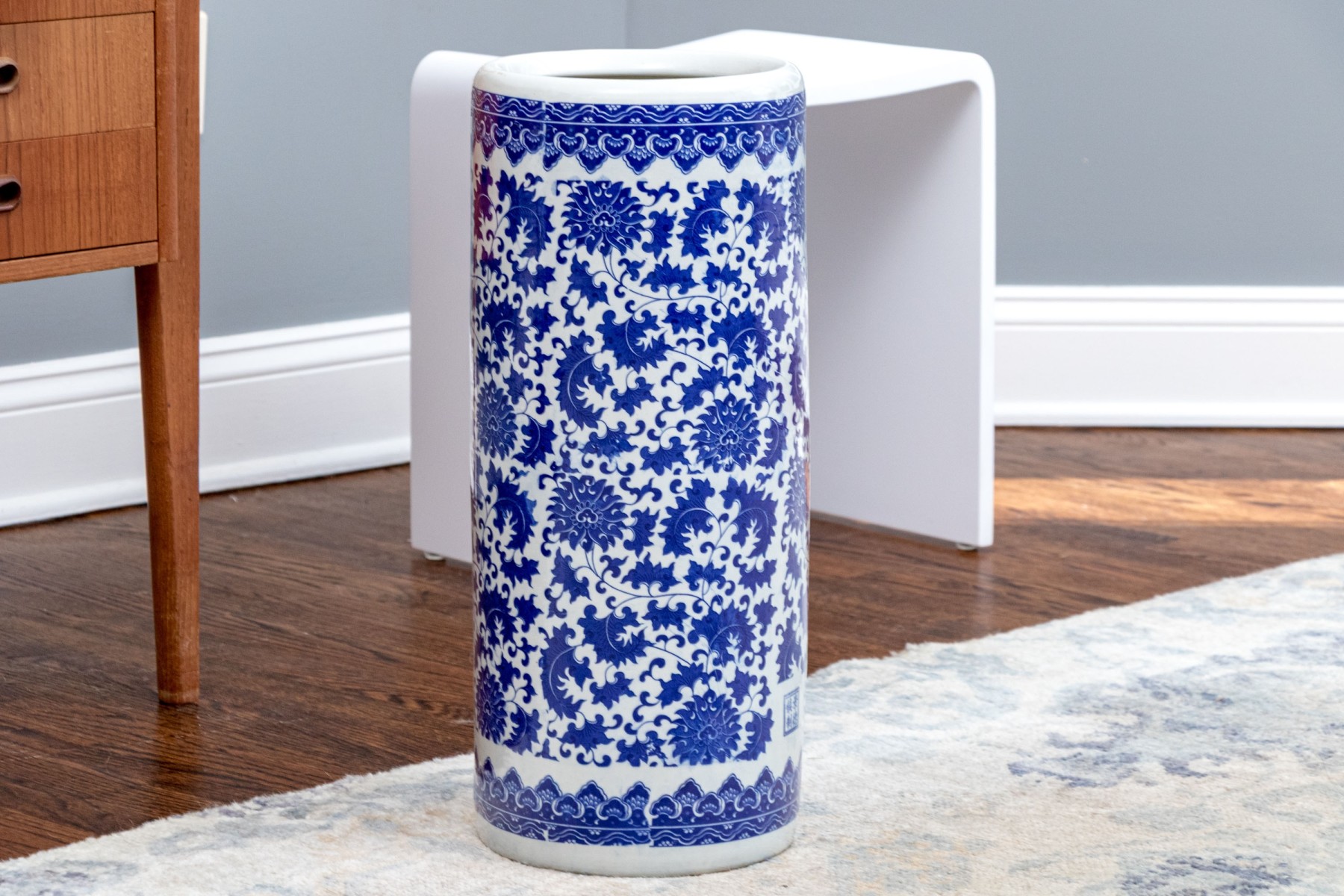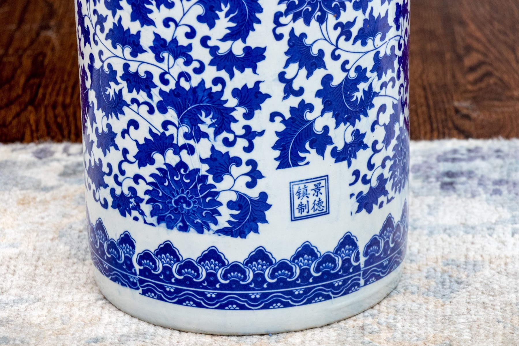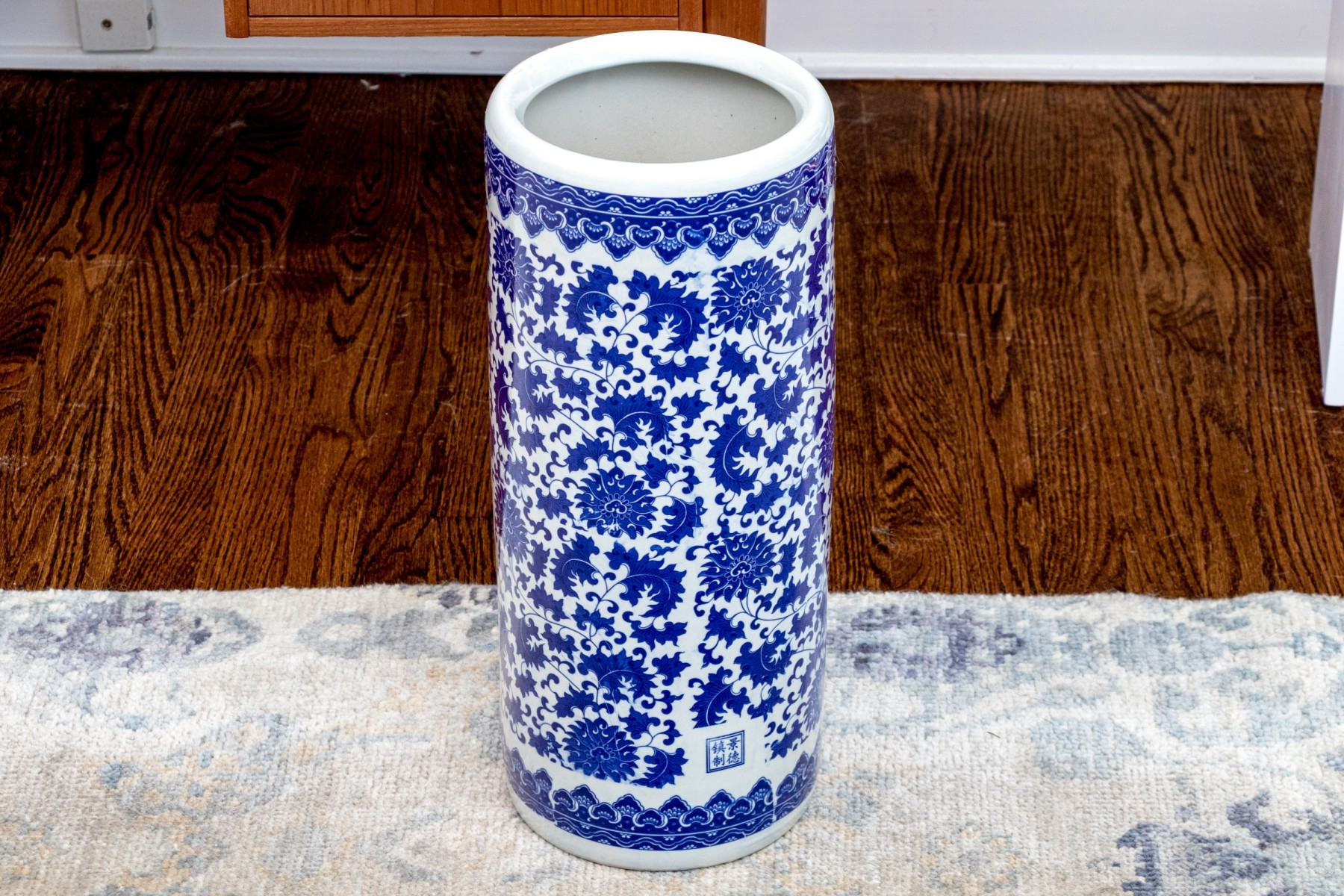 A gorgeous 20th century Chinese porcelain umbrella stand in sleek cylindrical form, well decorated with transferware scalloped borders and ornate flowers on fine vining foliage in vibrant monochromatic blue.