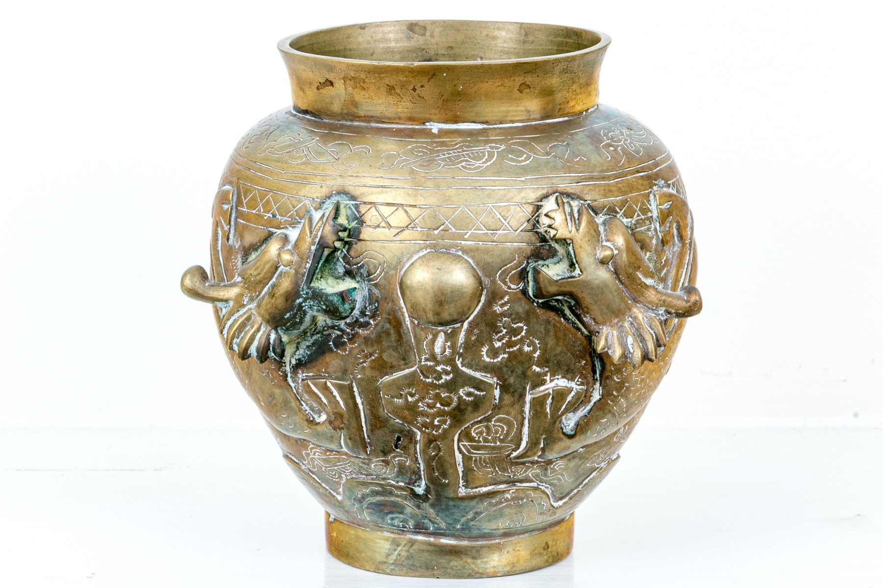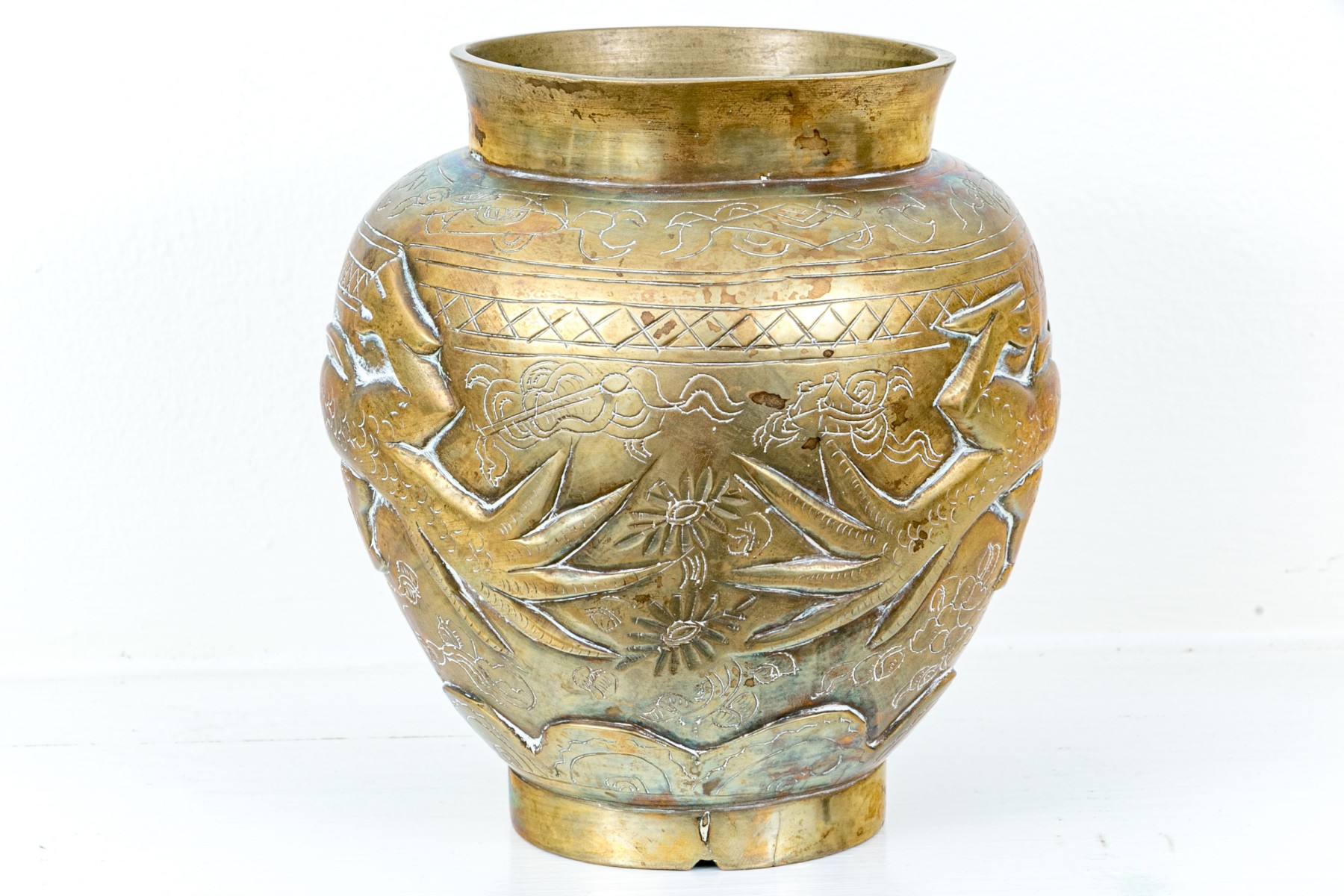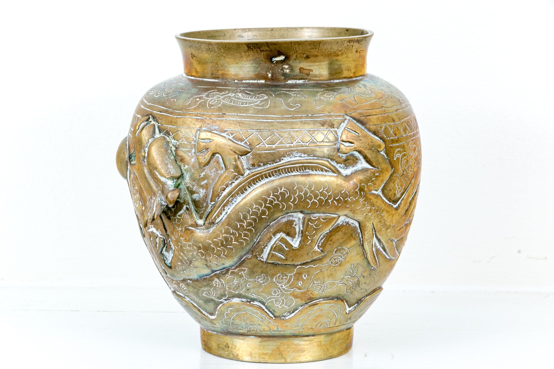 The vase fabricated of brass is ovoid in form. Standing upon a circular foot, the ovoid form vase has engraved decoration along with applied dragons chasing the immortal pearl of wisdom in relief.