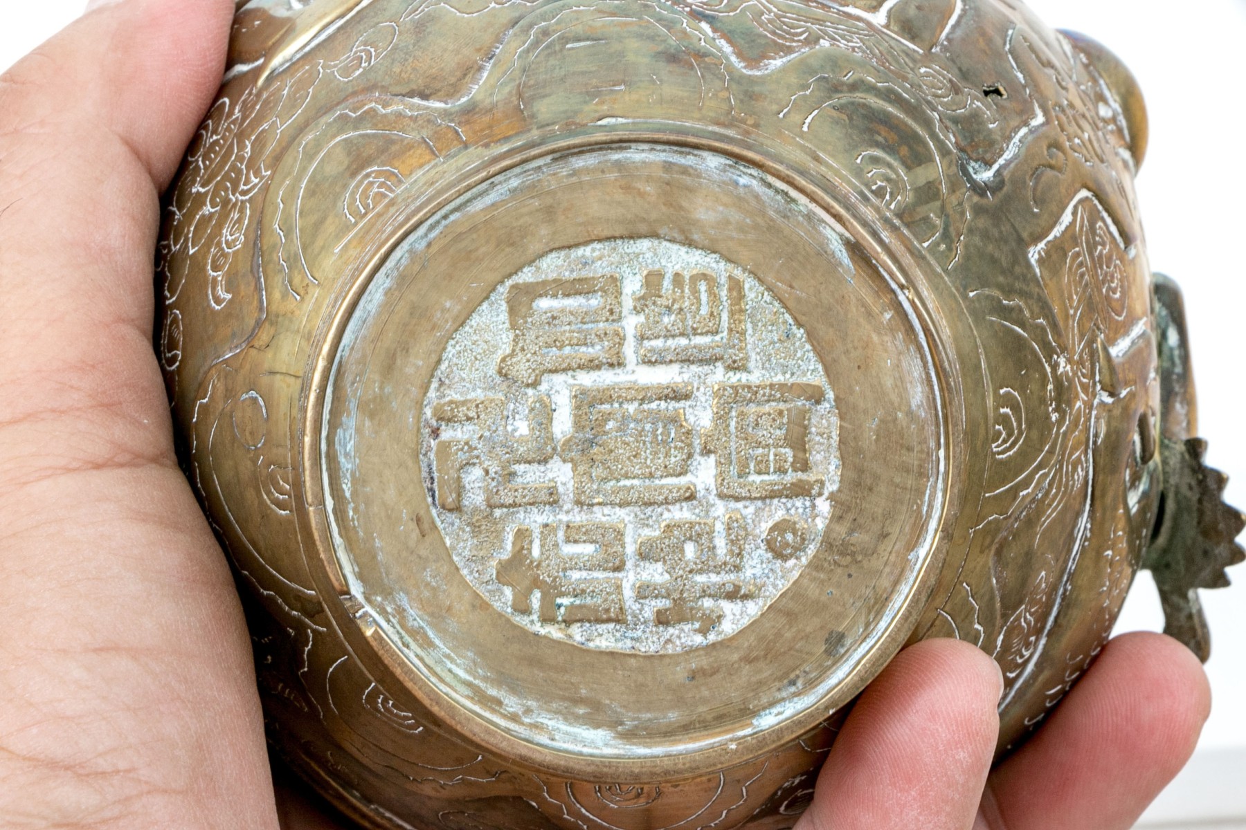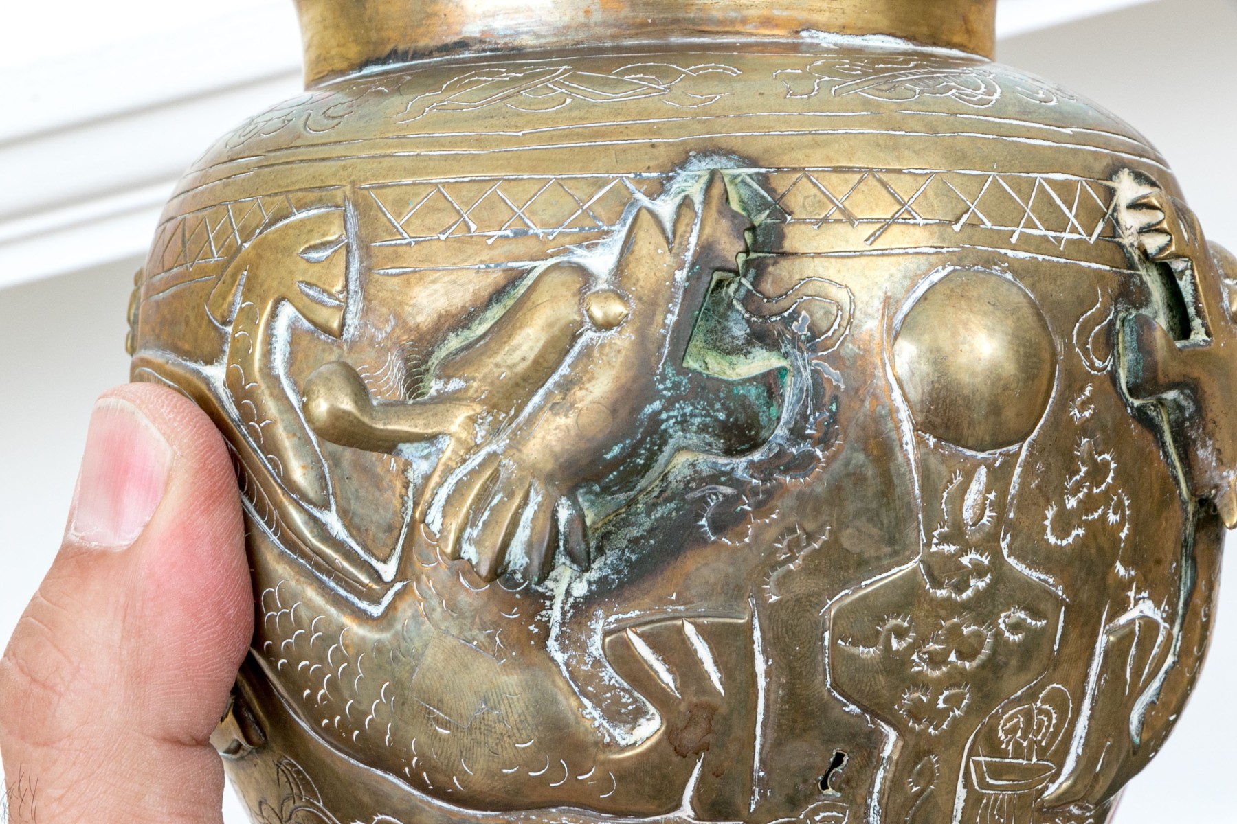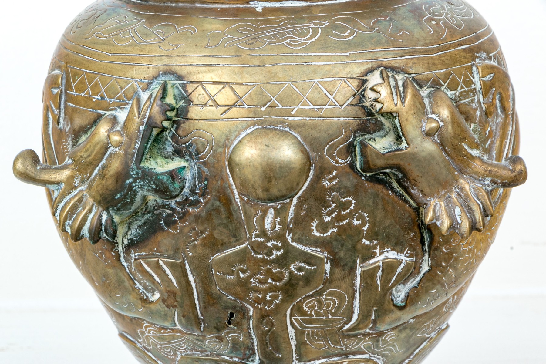 The vase fabricated of brass is ovoid in form. Standing upon a circular foot, the ovoid form vase has engraved decoration along with applied dragons chasing the immortal pearl of wisdom in relief.
