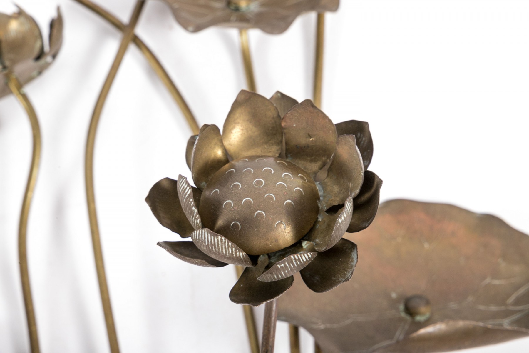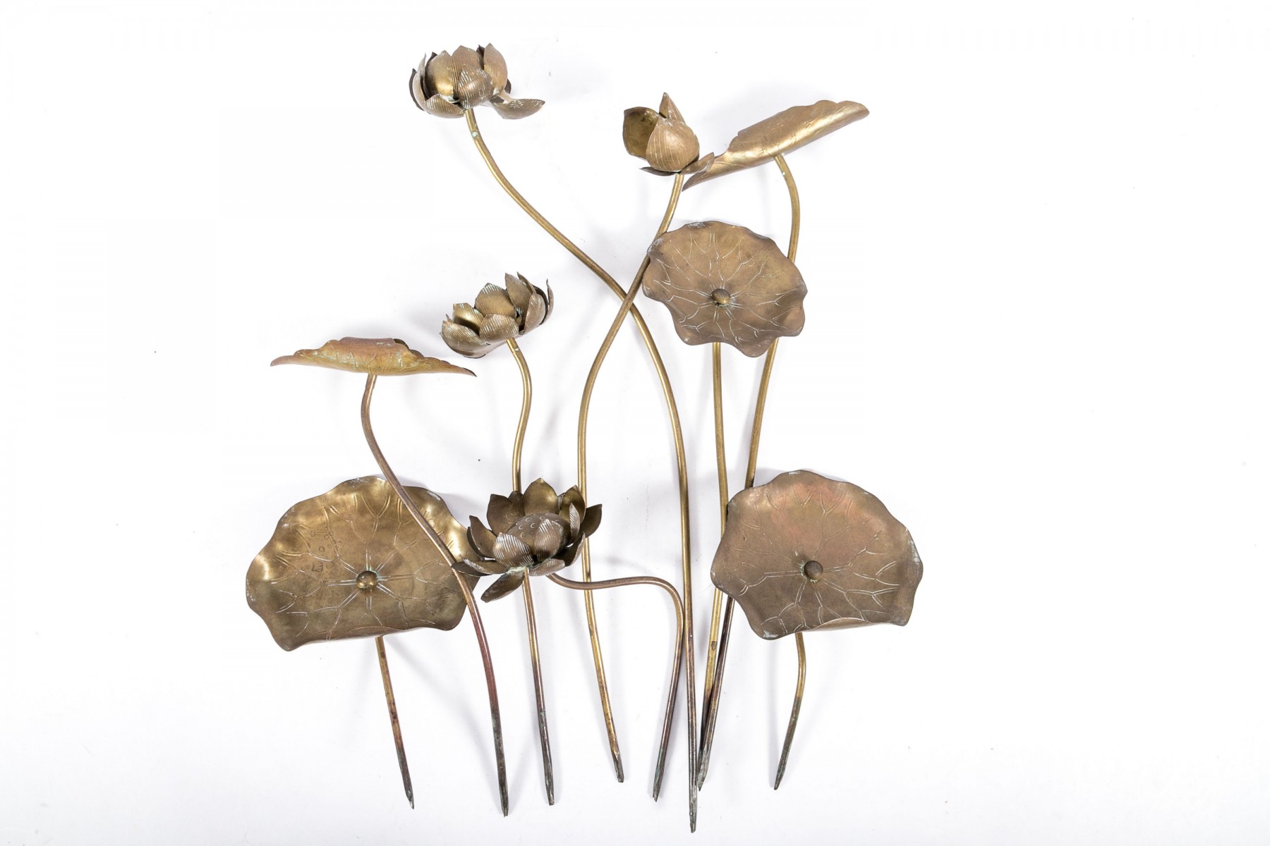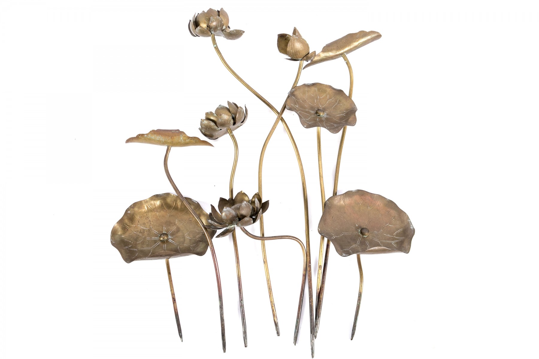 Lovely group of Chinese brass garden decor sticks displaying lily pads and lotus leaves.