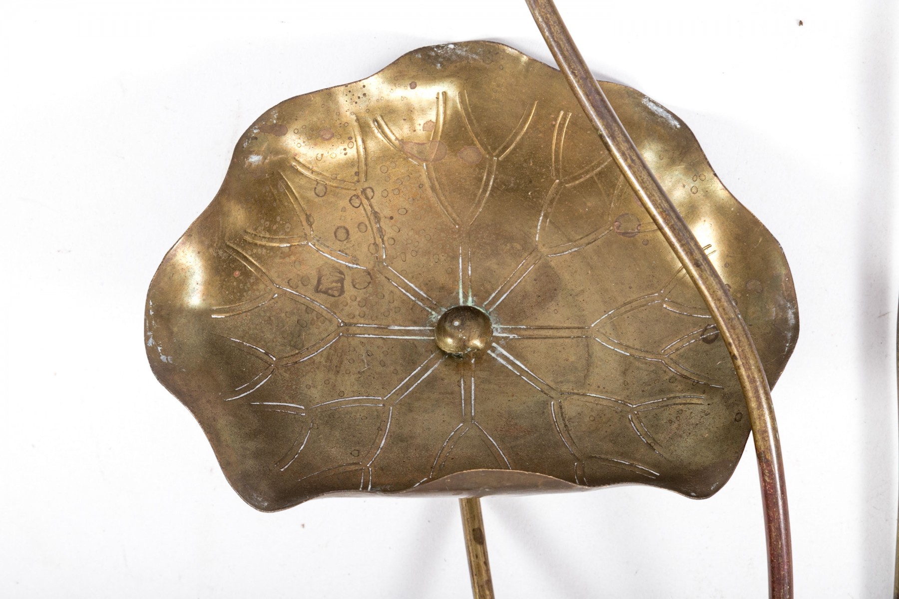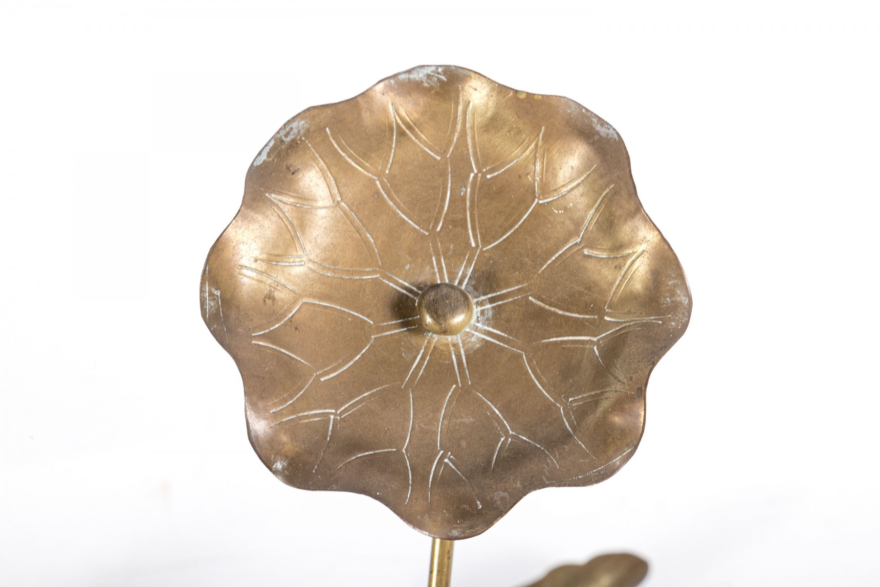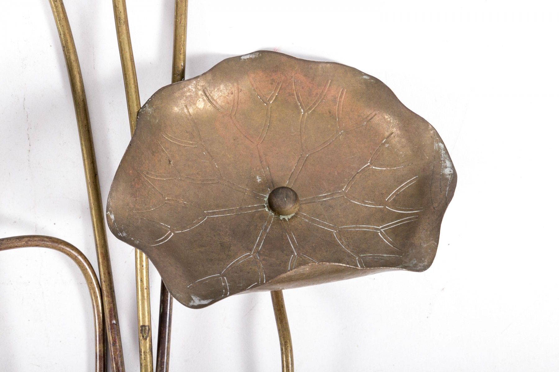 Lovely group of Chinese brass garden decor sticks displaying lily pads and lotus leaves.