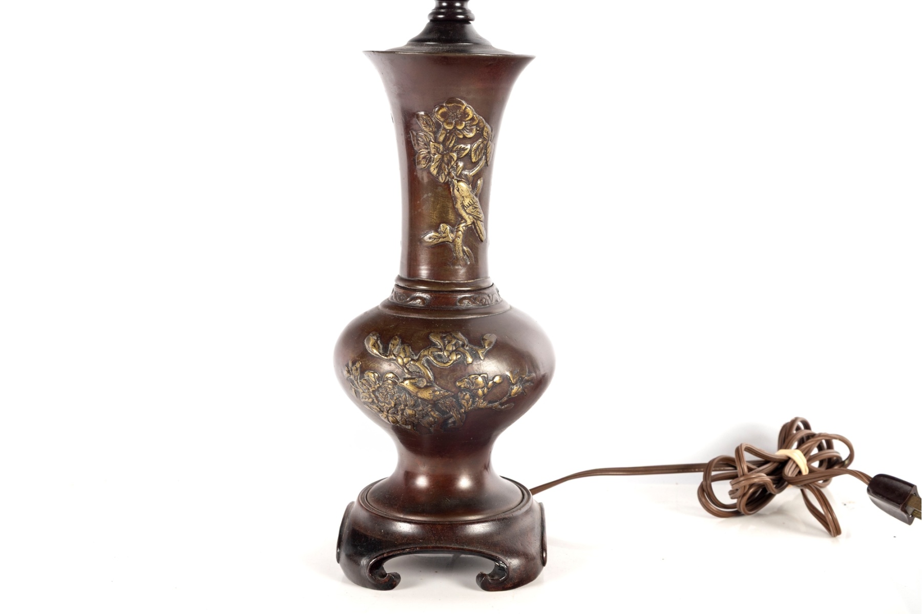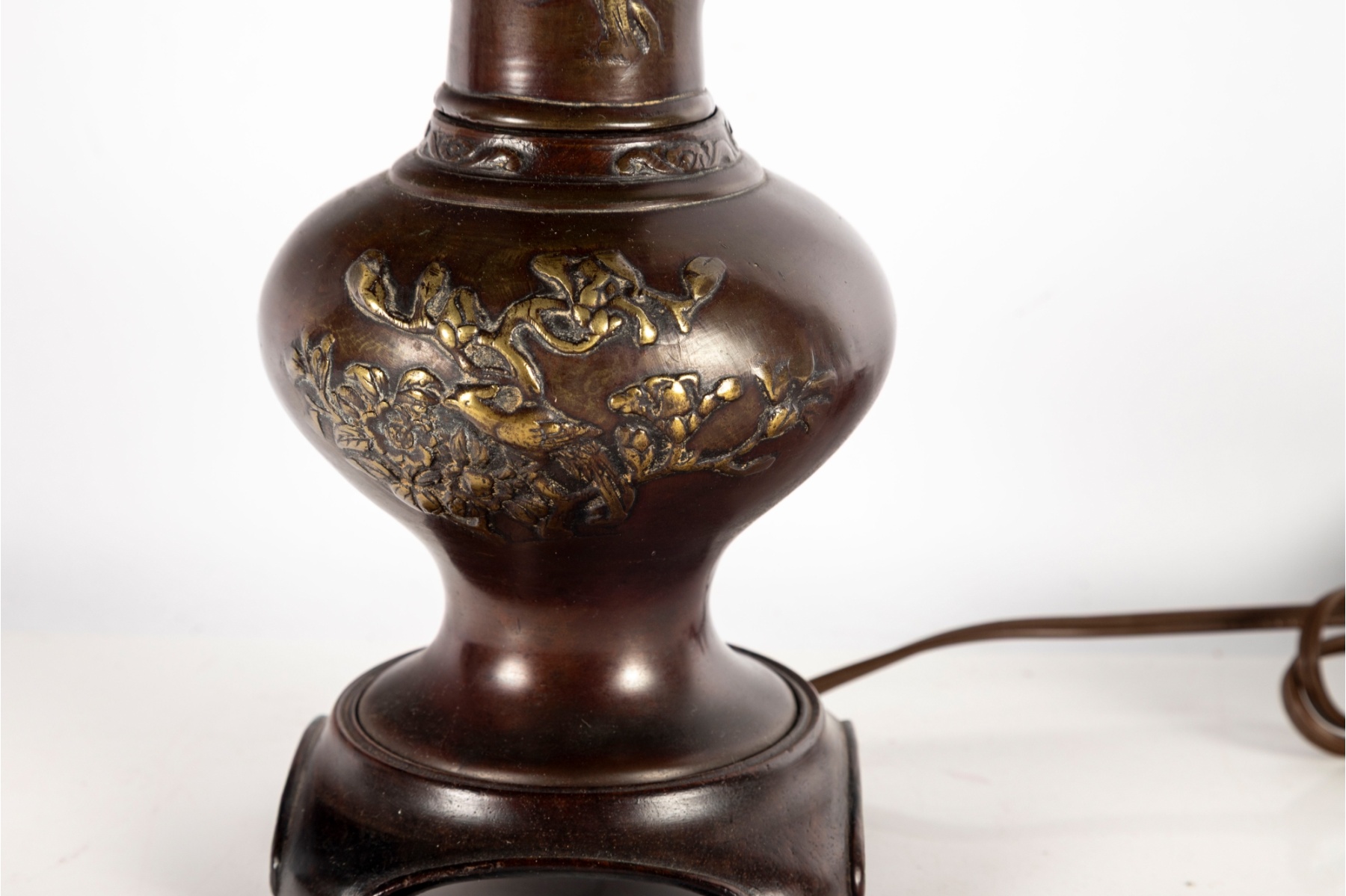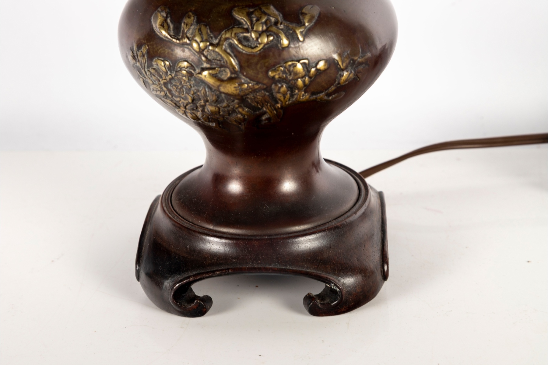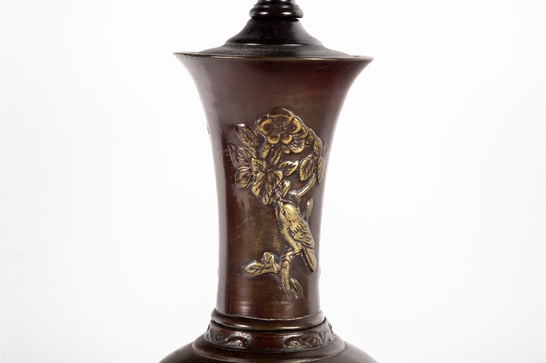 A vintage Chinese brass vase in a rich bronzed finish mounted as a table lamp, featuring relief designs of birds perched among blossoming branches on both the neck and body. The vase has a rich brown patina with highlighted gilt details, set atop a carved hardwood base marked “Made in Hong Kong No. 407” to the underside.