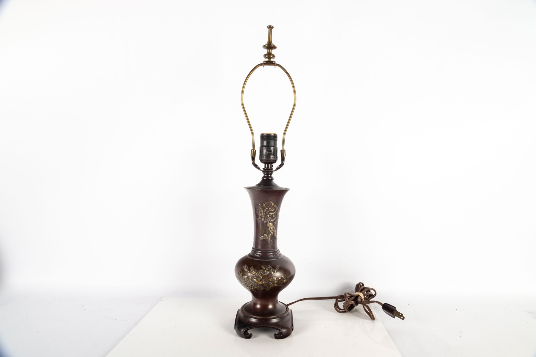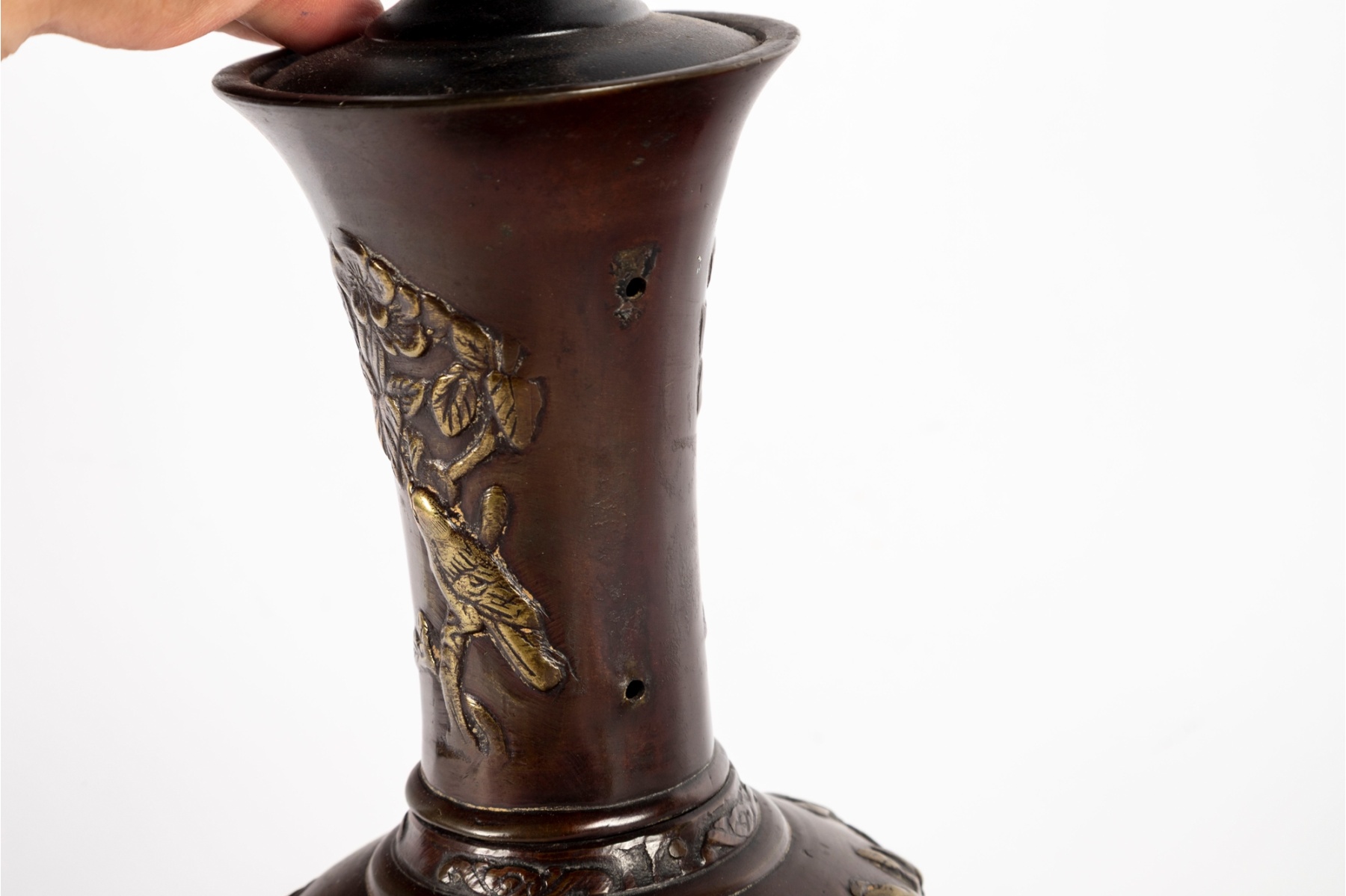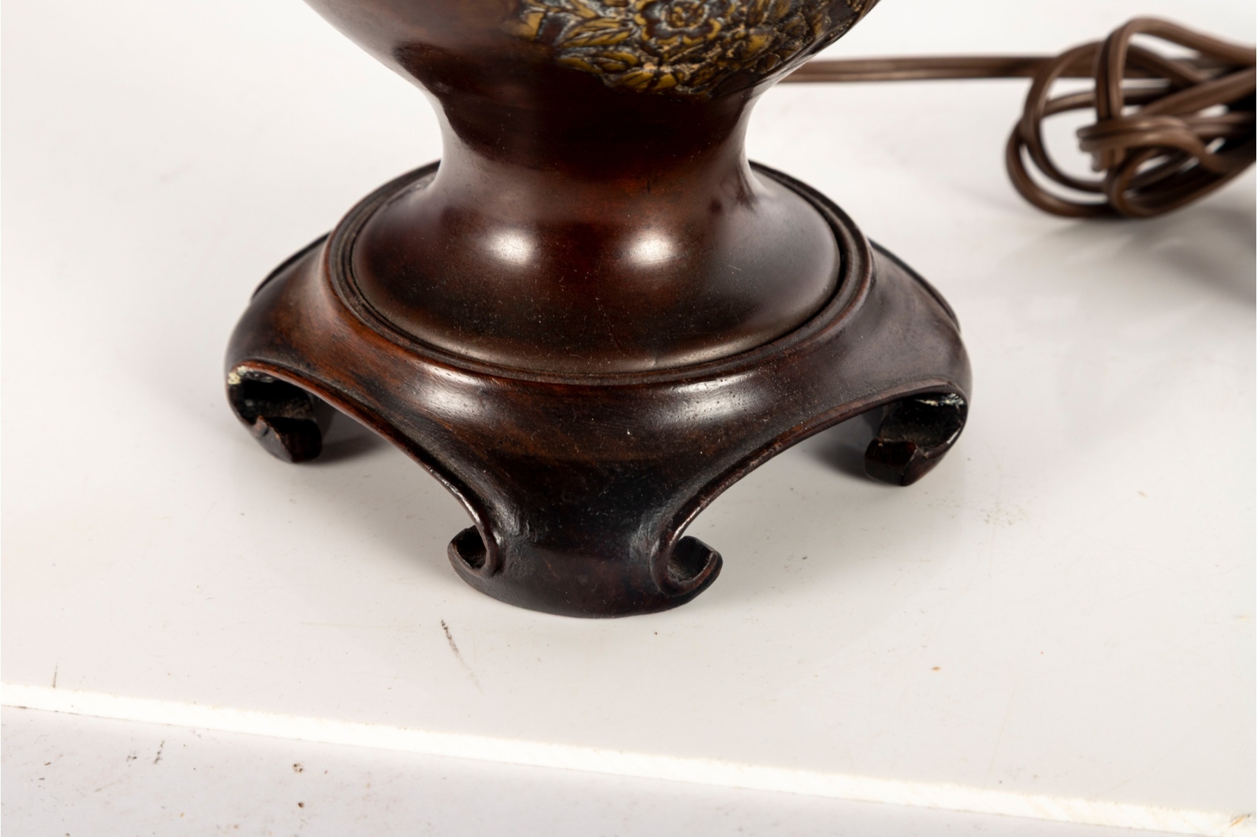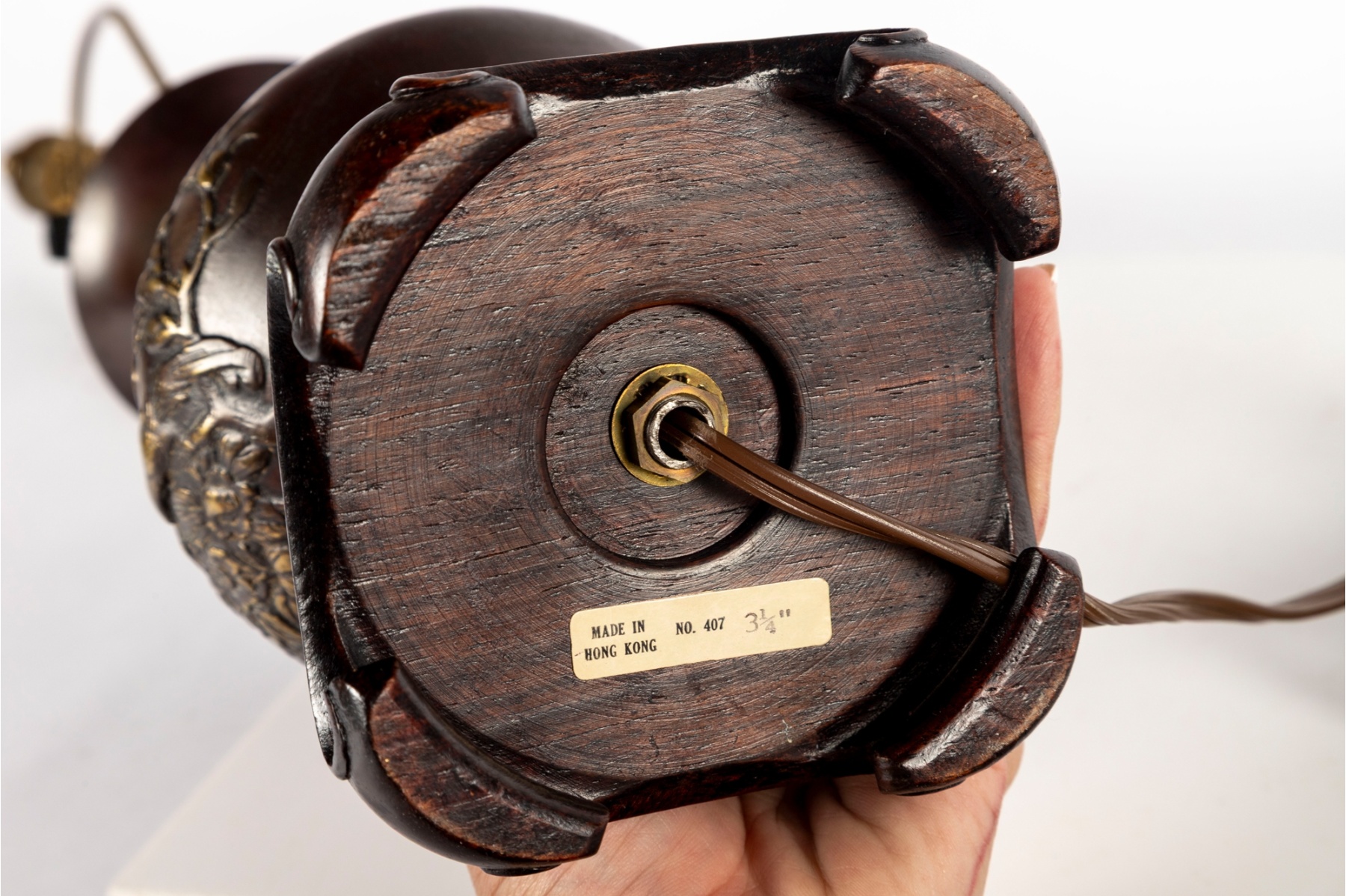 A vintage Chinese brass vase in a rich bronzed finish mounted as a table lamp, featuring relief designs of birds perched among blossoming branches on both the neck and body. The vase has a rich brown patina with highlighted gilt details, set atop a carved hardwood base marked “Made in Hong Kong No. 407” to the underside.