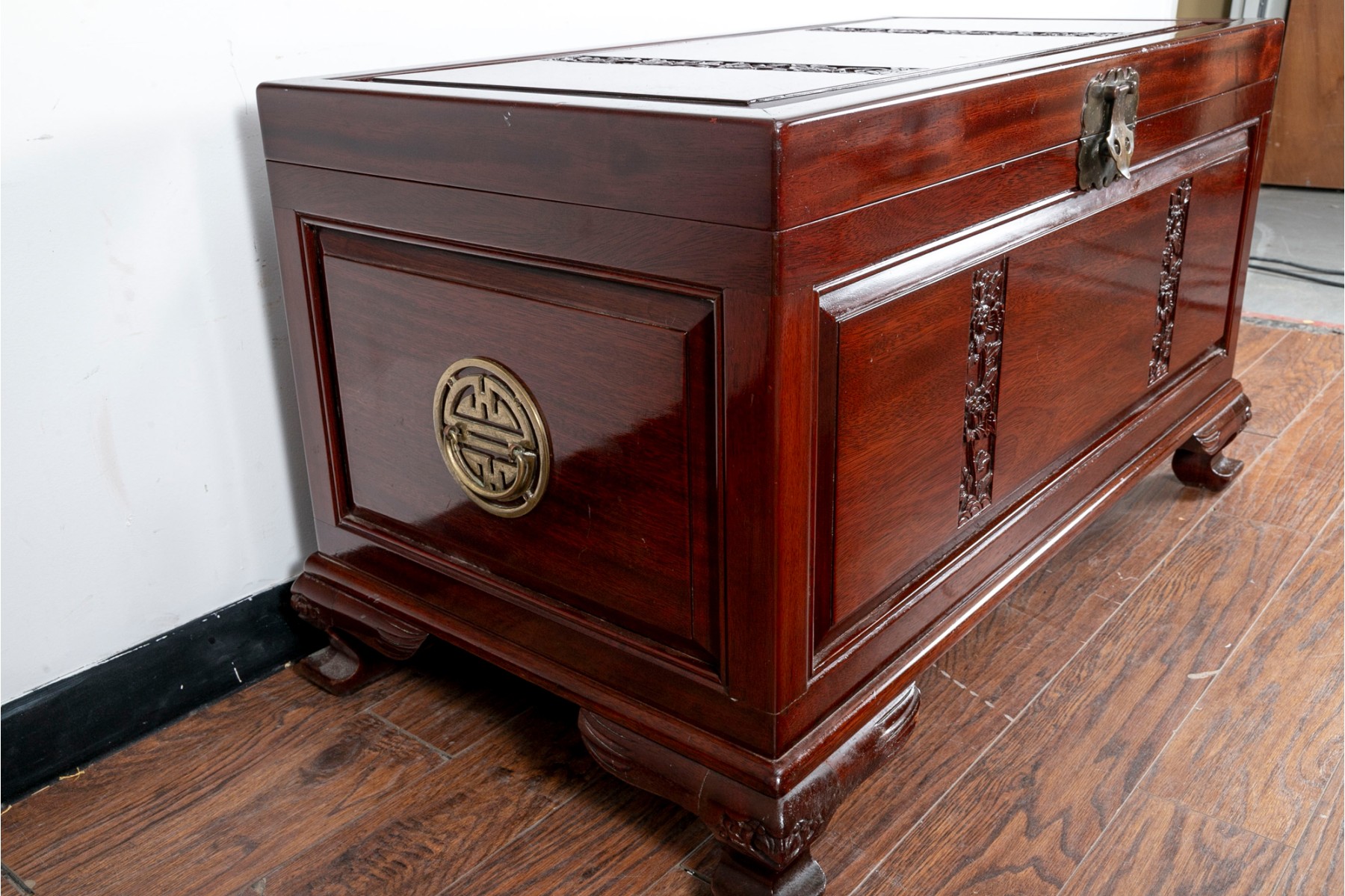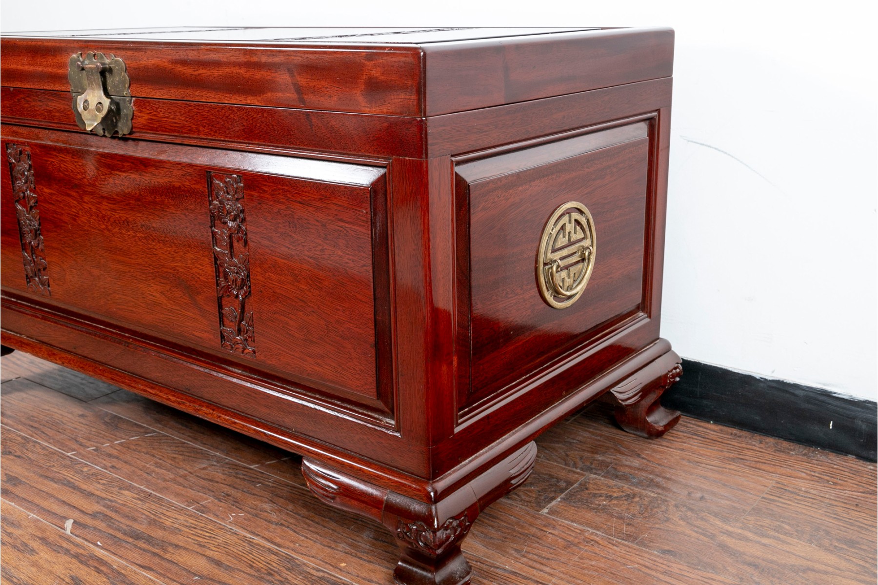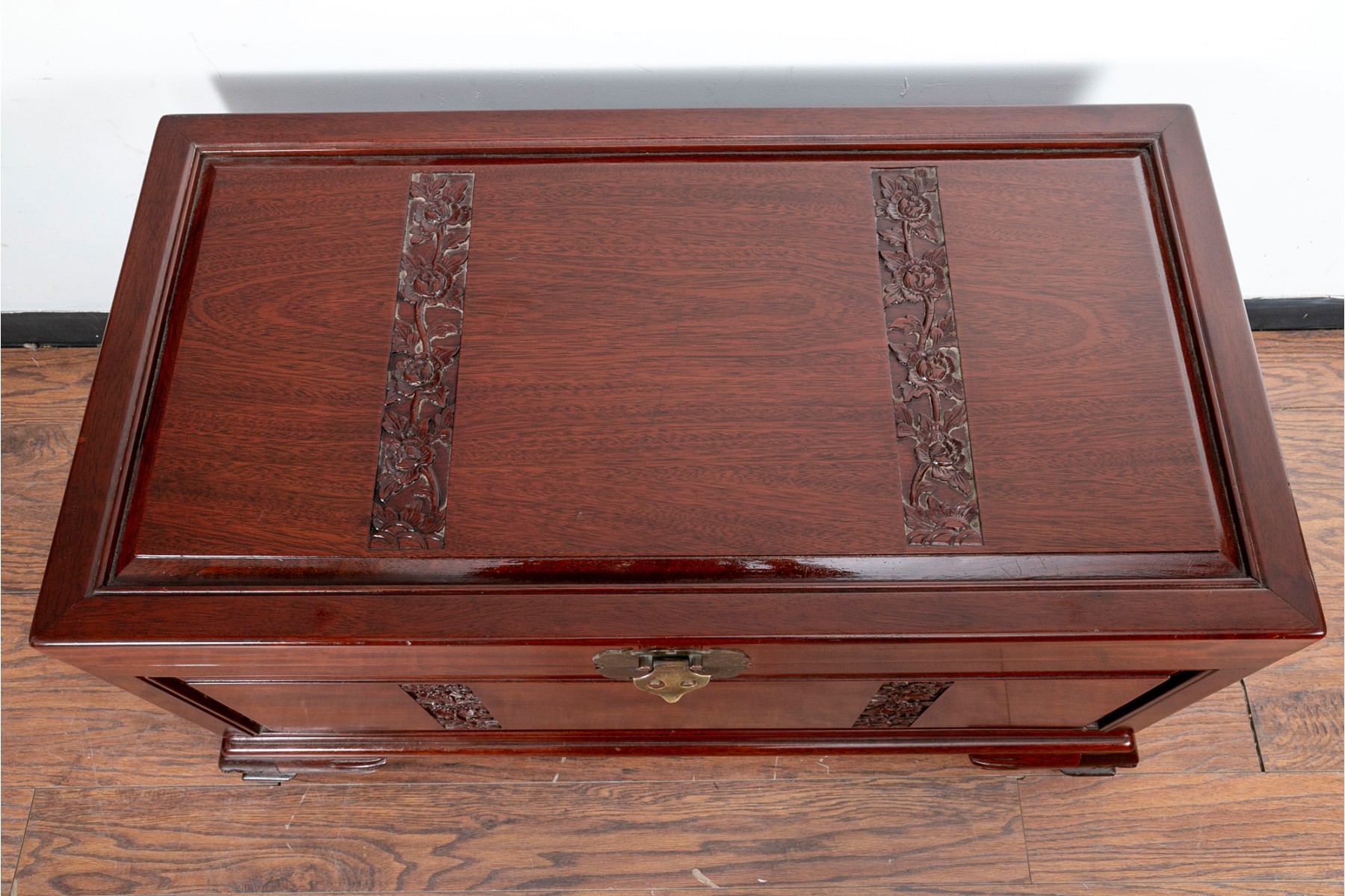 A Chinese chest in a gorgeous rosewood finish, displaying rectangular panels on the lid with intricate floral carving, extending down the front. The sides are adorned with handles on pierced brass plaques. The chest opens to a removable upper shelf and a spacious interior, and is supported by stout feet with carved figural designs.
