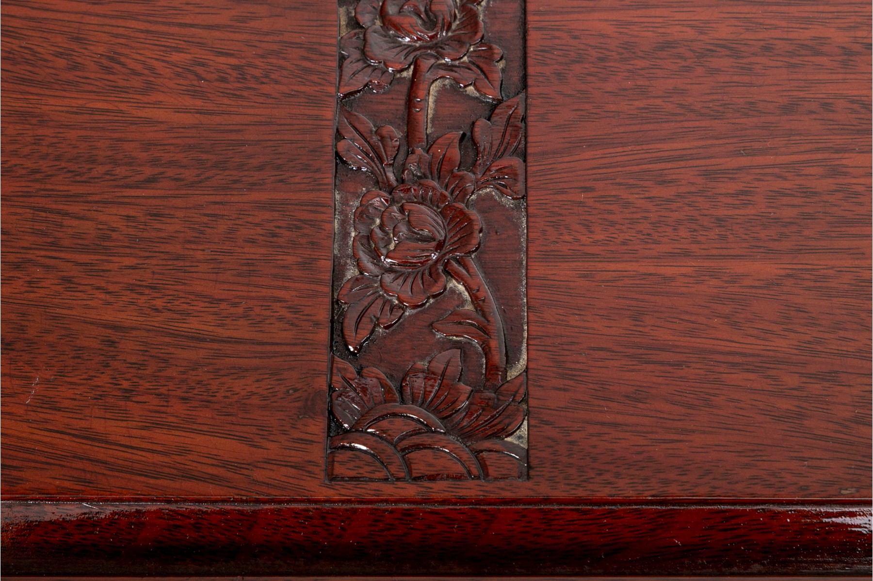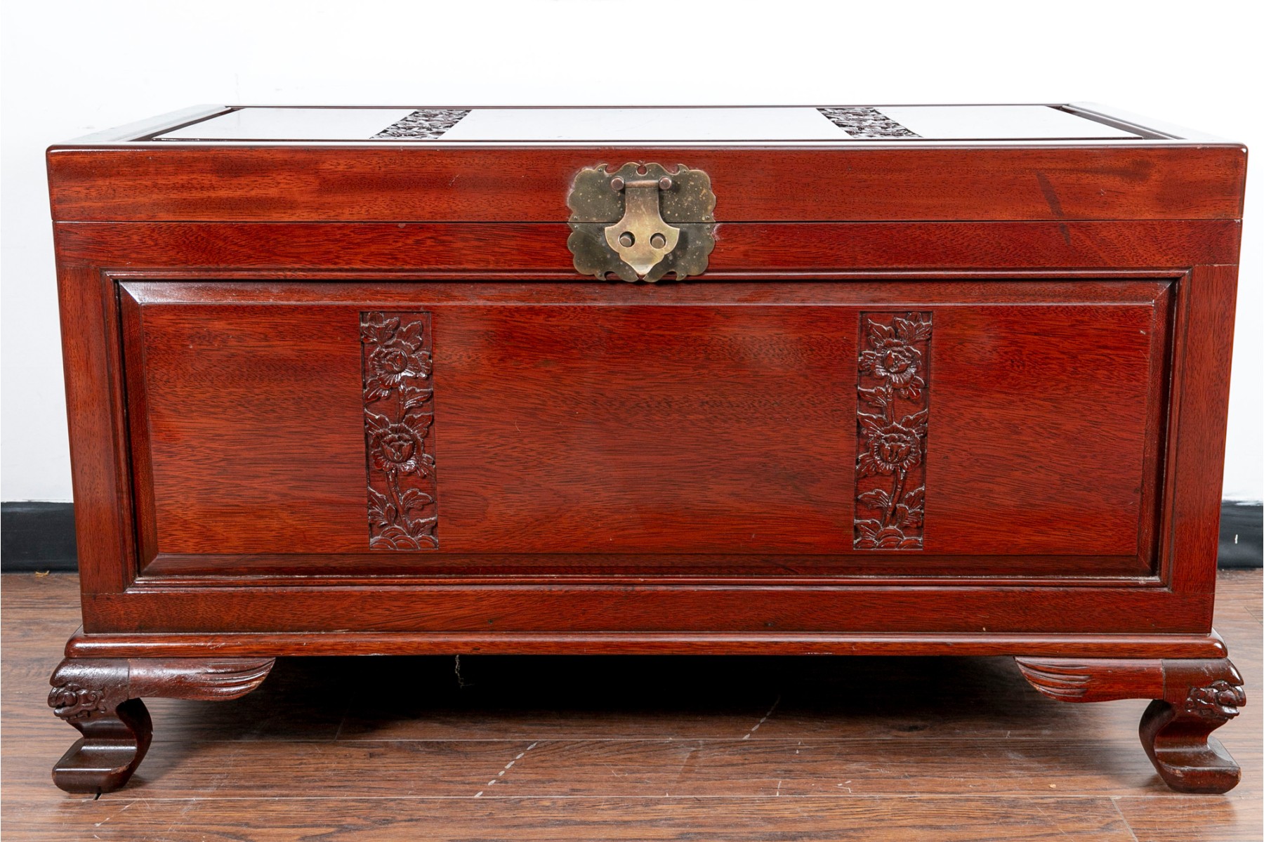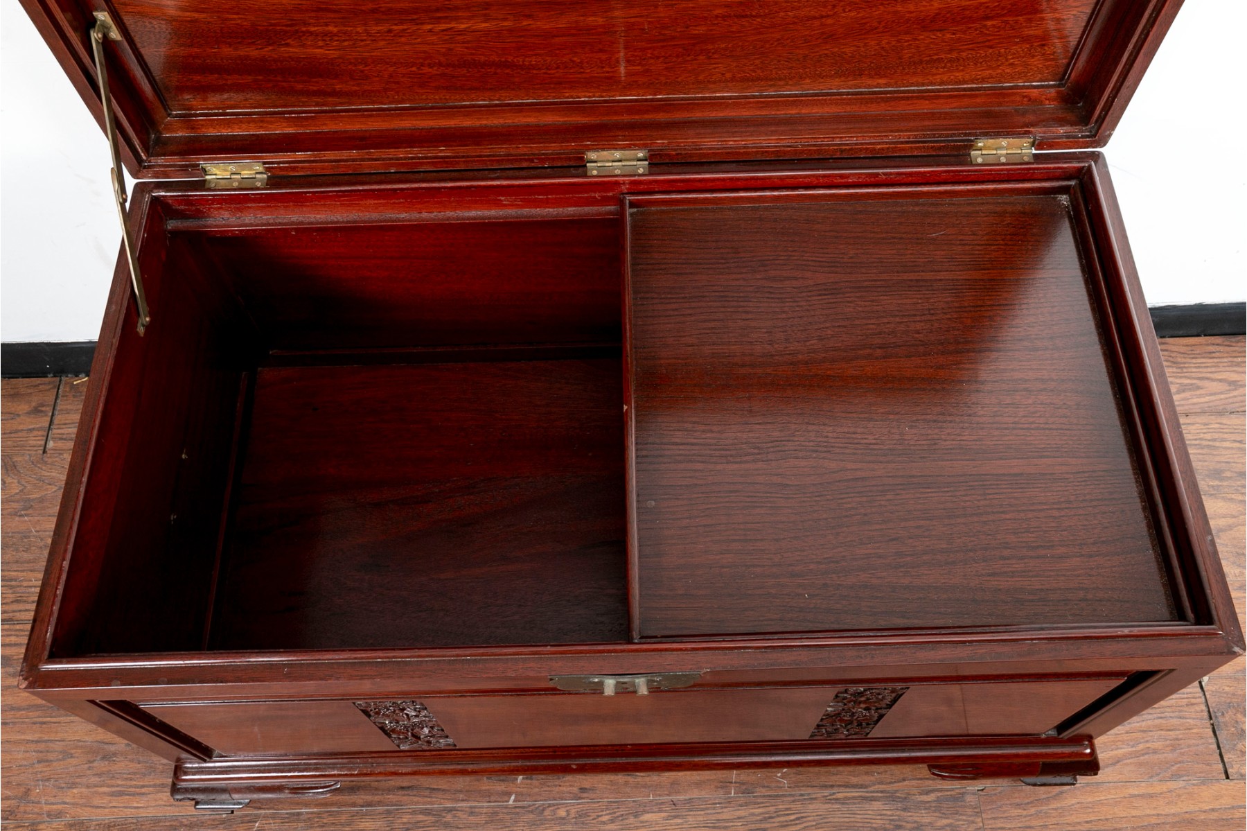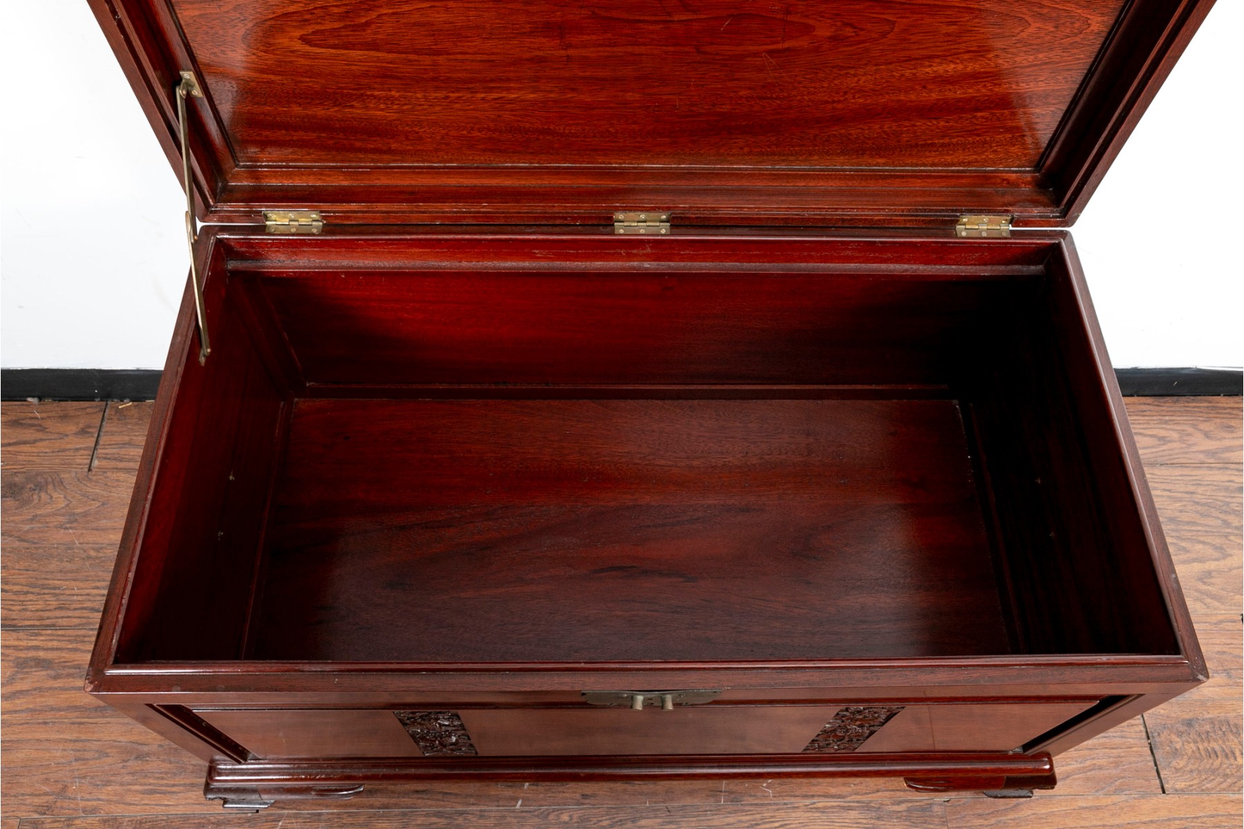 A Chinese chest in a gorgeous rosewood finish, displaying rectangular panels on the lid with intricate floral carving, extending down the front. The sides are adorned with handles on pierced brass plaques. The chest opens to a removable upper shelf and a spacious interior, and is supported by stout feet with carved figural designs.