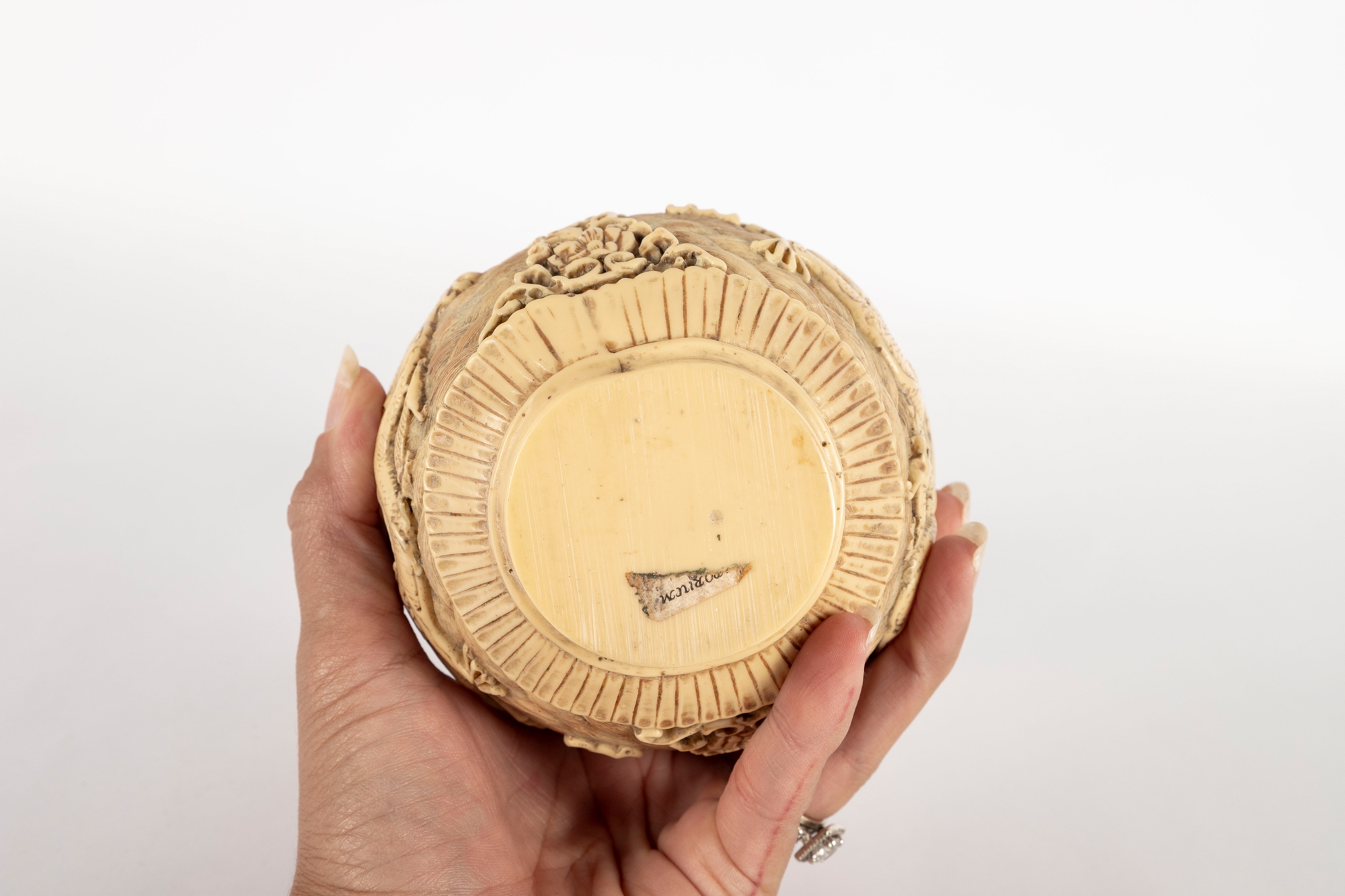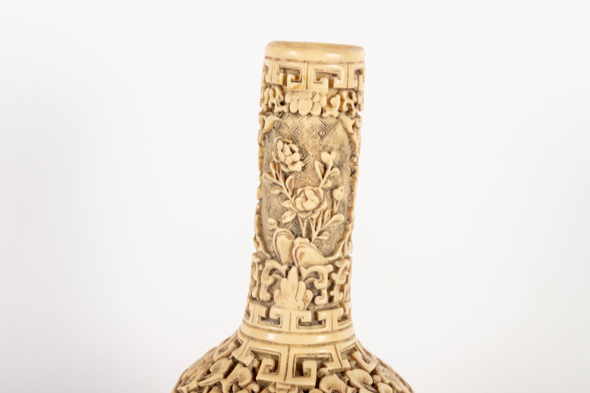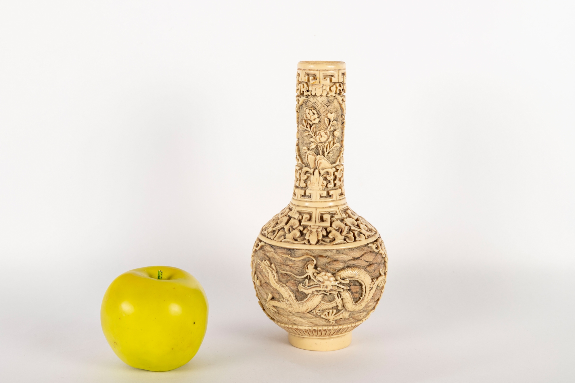 An intricately carved Chinese celluloid vase featuring a high-relief design of a five-clawed dragon amid swirling clouds around the body, with floral and geometric borders along the neck.