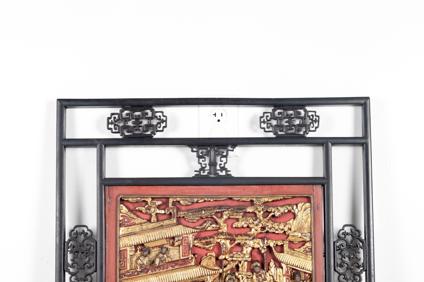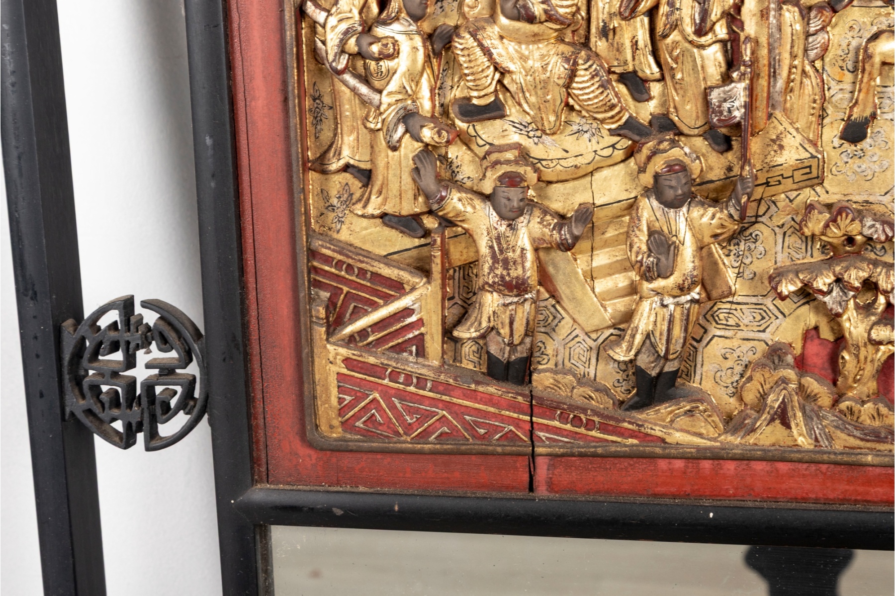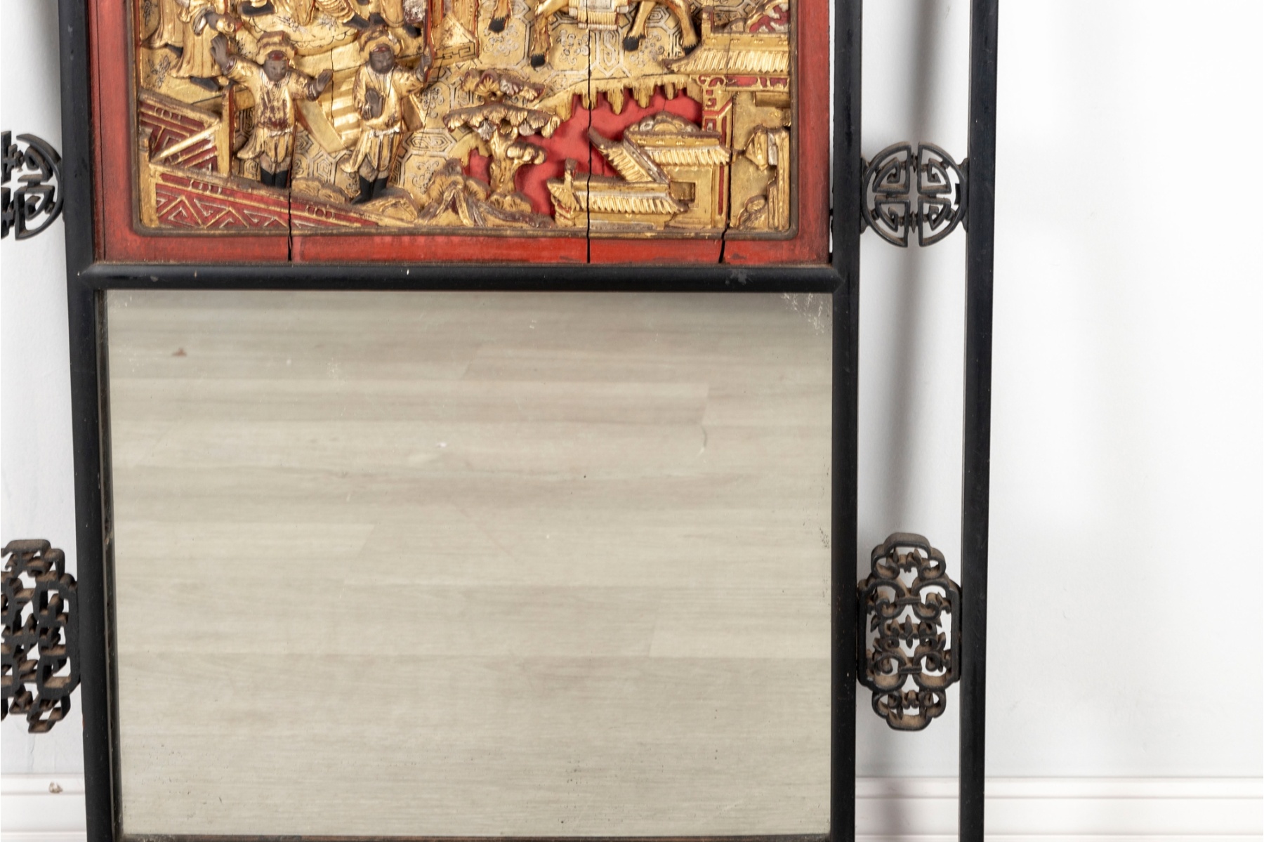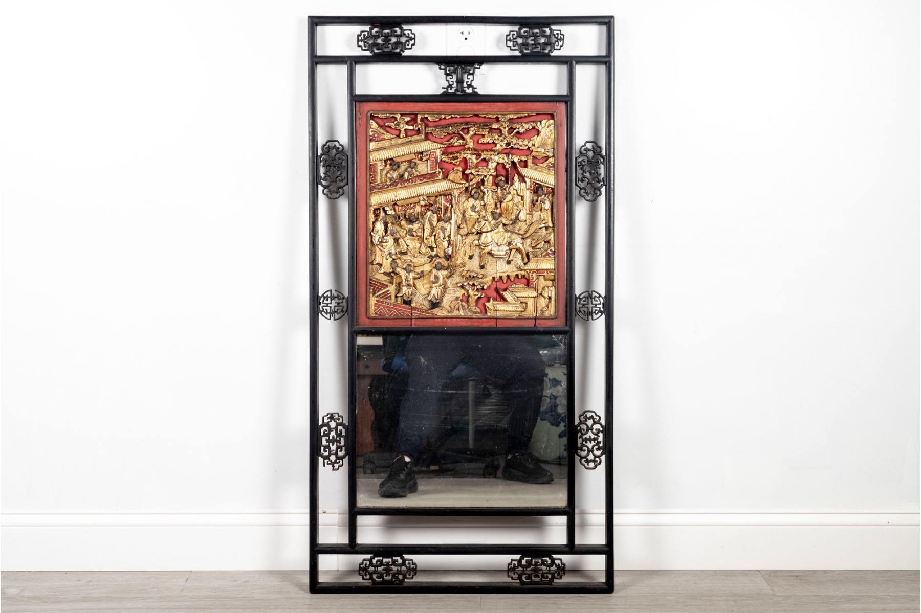 Intricately designed Chinese wall mirror featuring carved and gilt wood panel depicting a lively court scene with figures in an architectural setting, set above a square mirror plate. The panel is mounted within an openwork black lacquered frame featuring stylized geometric motifs.