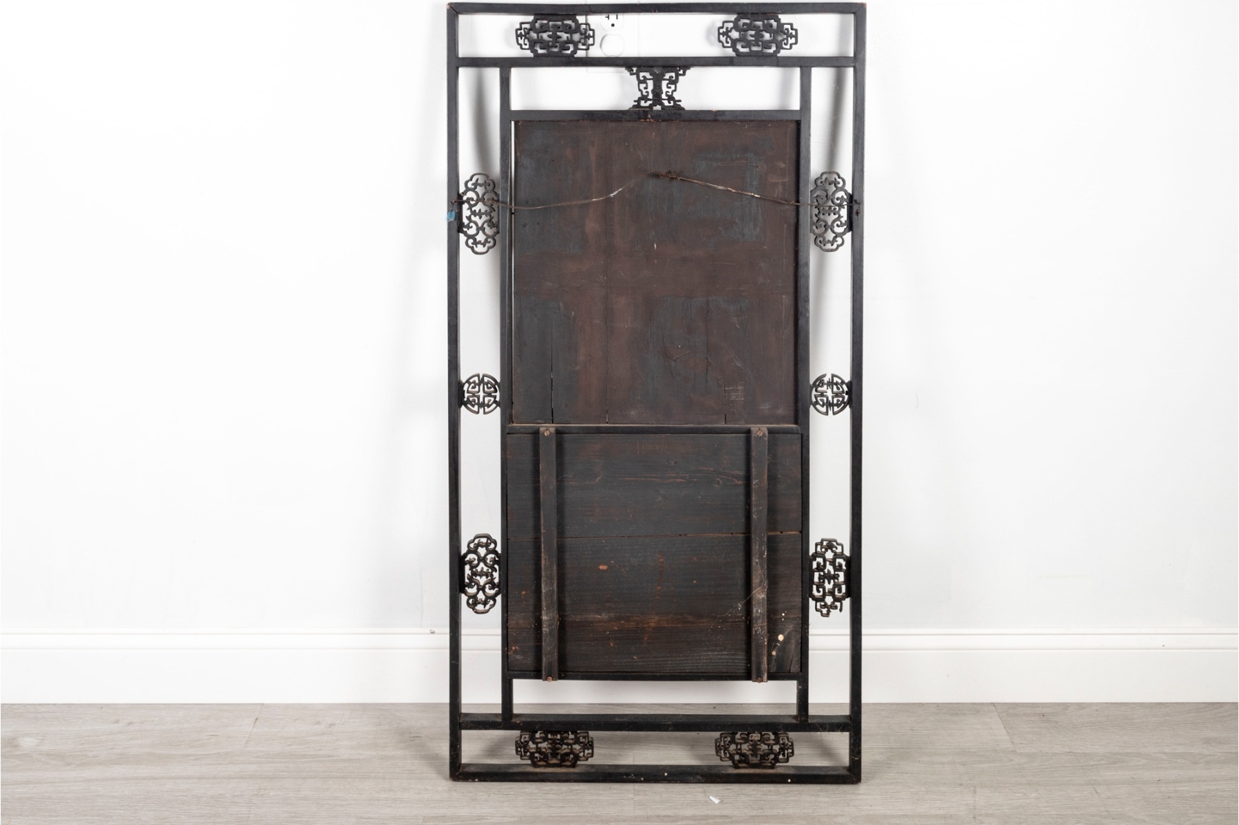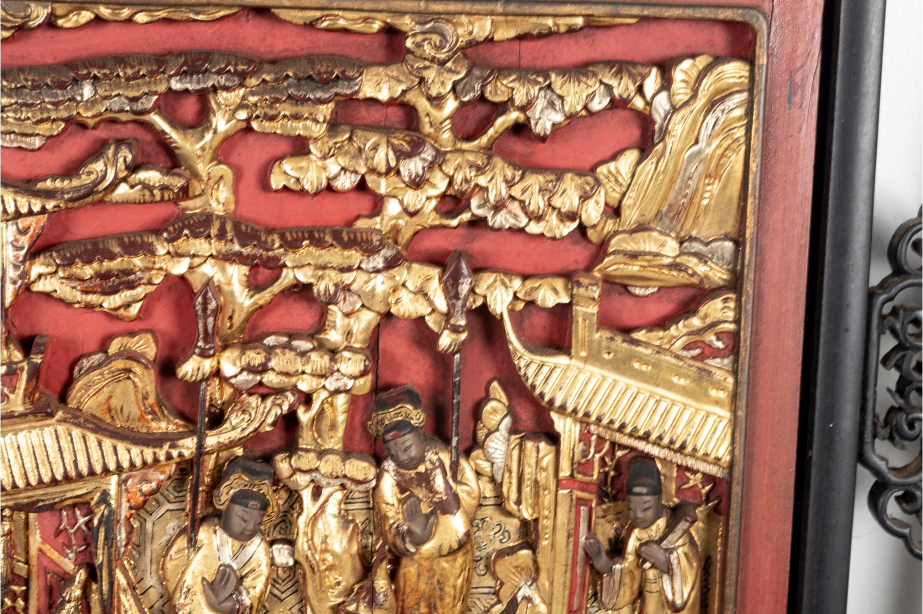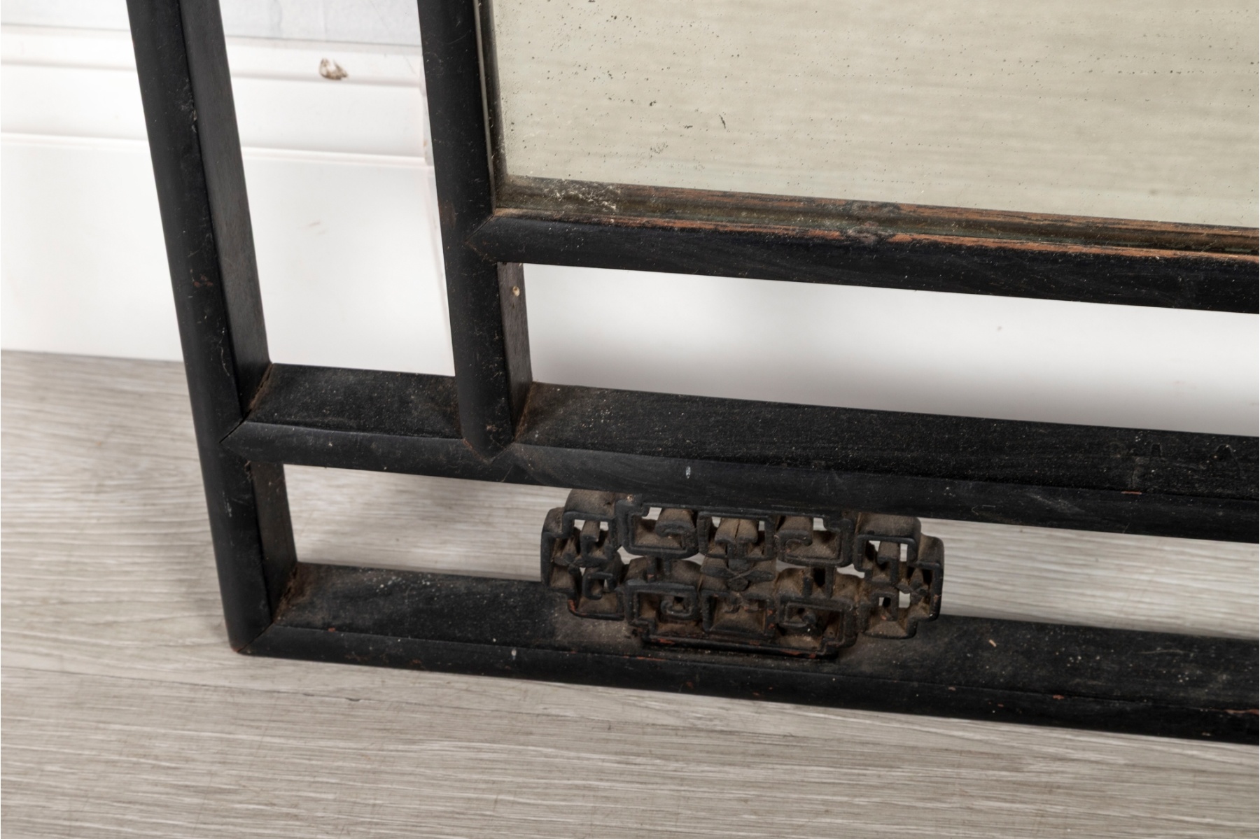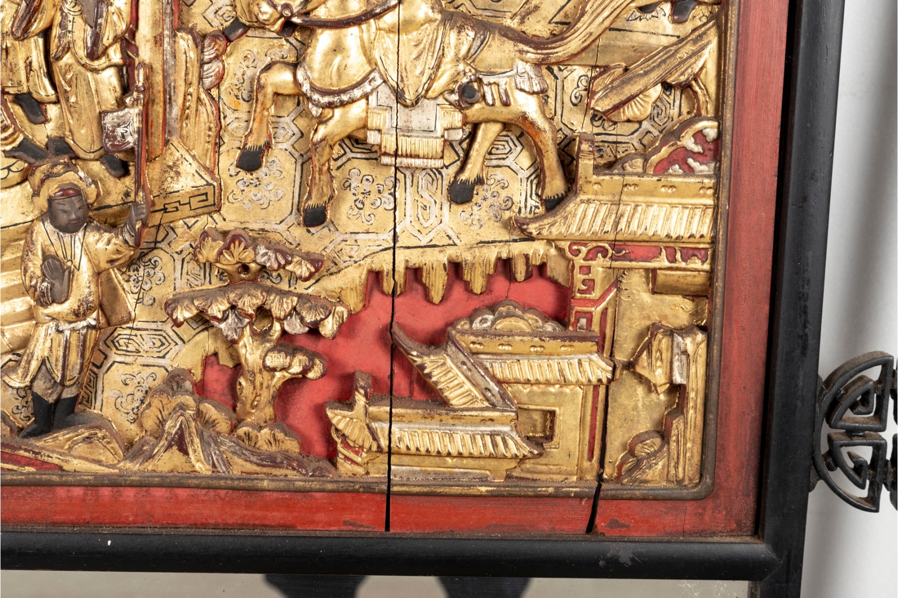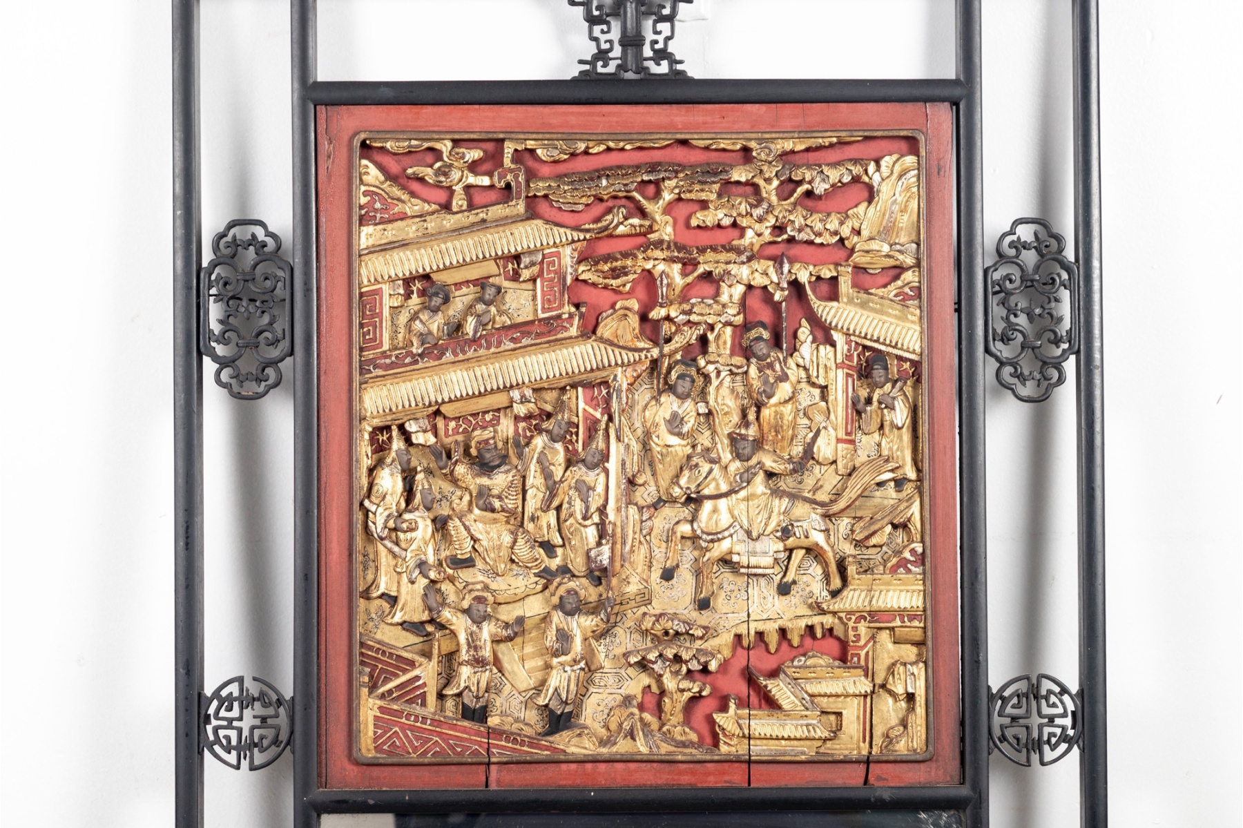 Intricately designed Chinese wall mirror featuring carved and gilt wood panel depicting a lively court scene with figures in an architectural setting, set above a square mirror plate. The panel is mounted within an openwork black lacquered frame featuring stylized geometric motifs.