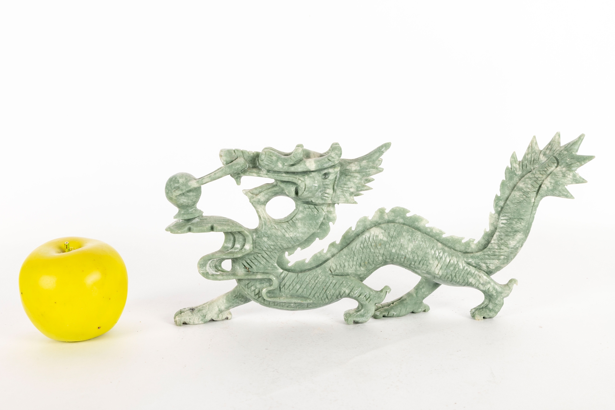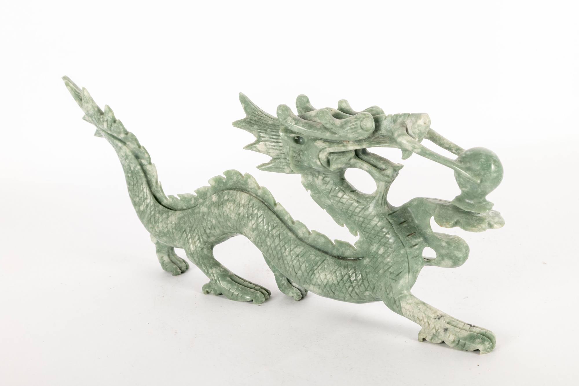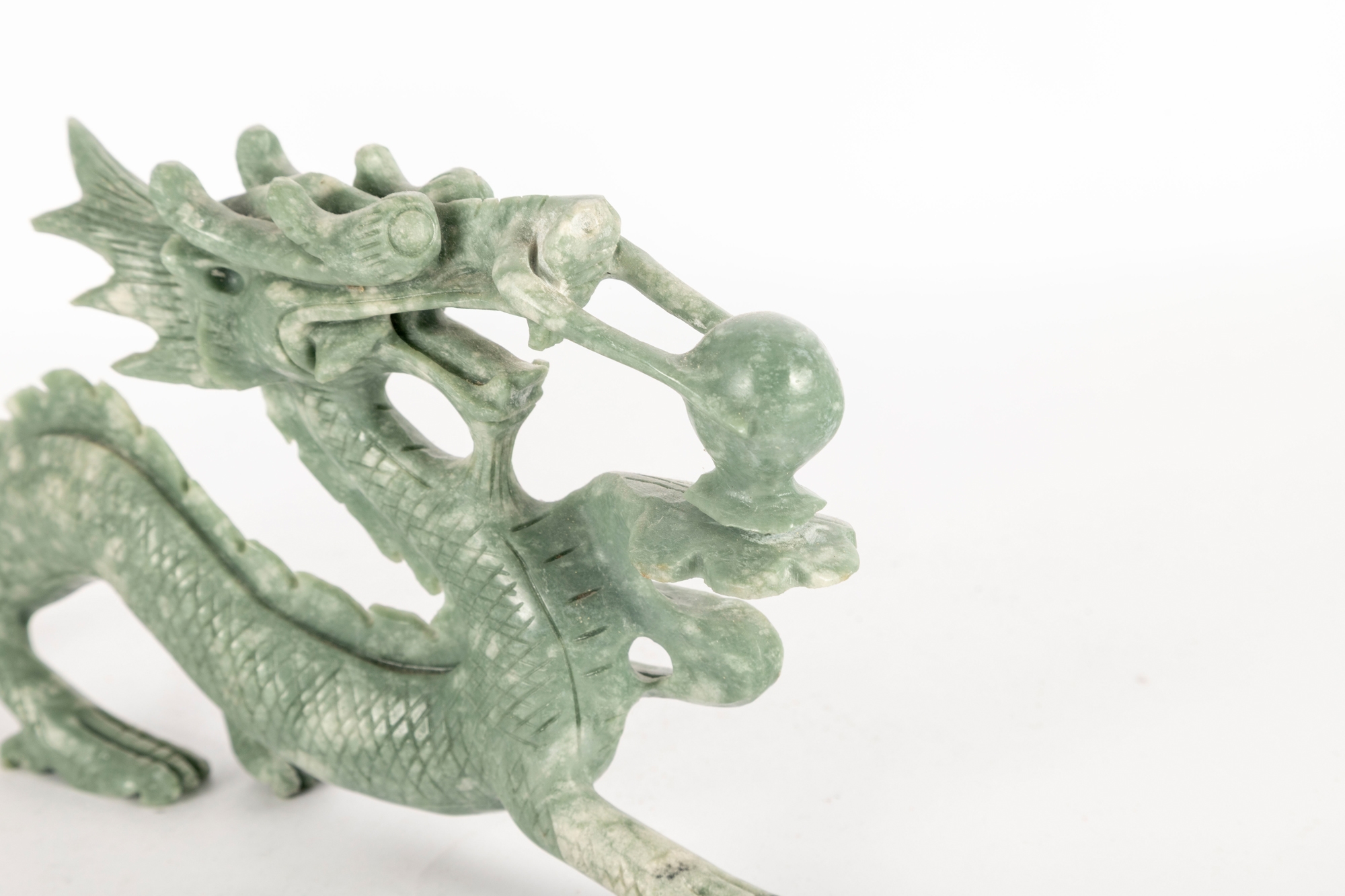 A finely carved green hardstone figure depicting a sinuous Chinese dragon in mid-stride, holding a flaming pearl in its front claws. The creature is rendered with an elongated, scaled body, raised tail, and expressive facial features with detailed whiskers, horns, and teeth.