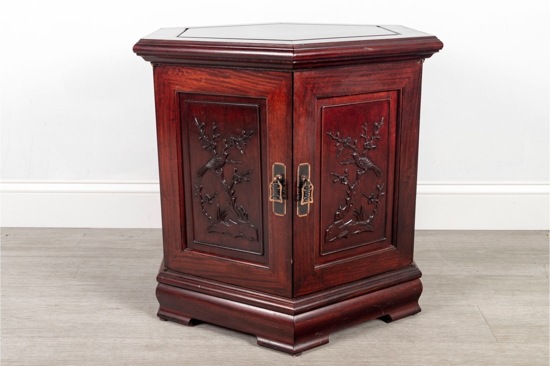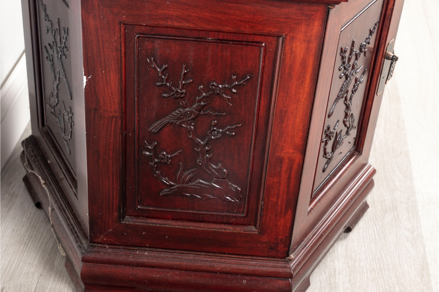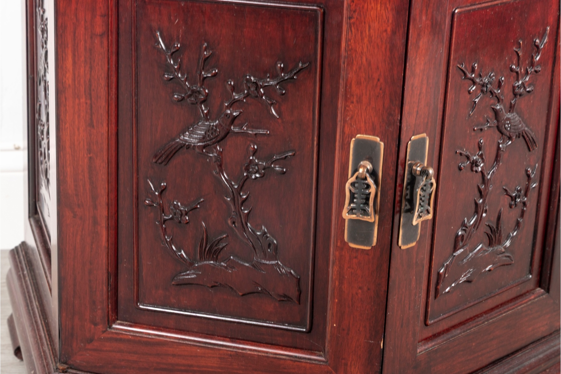 Finely crafted hexagonal cabinet featuring double doors with hand-carved panels depicting birds and flowering branches in relief. The piece rests on a molded plinth base and opens to interior storage.